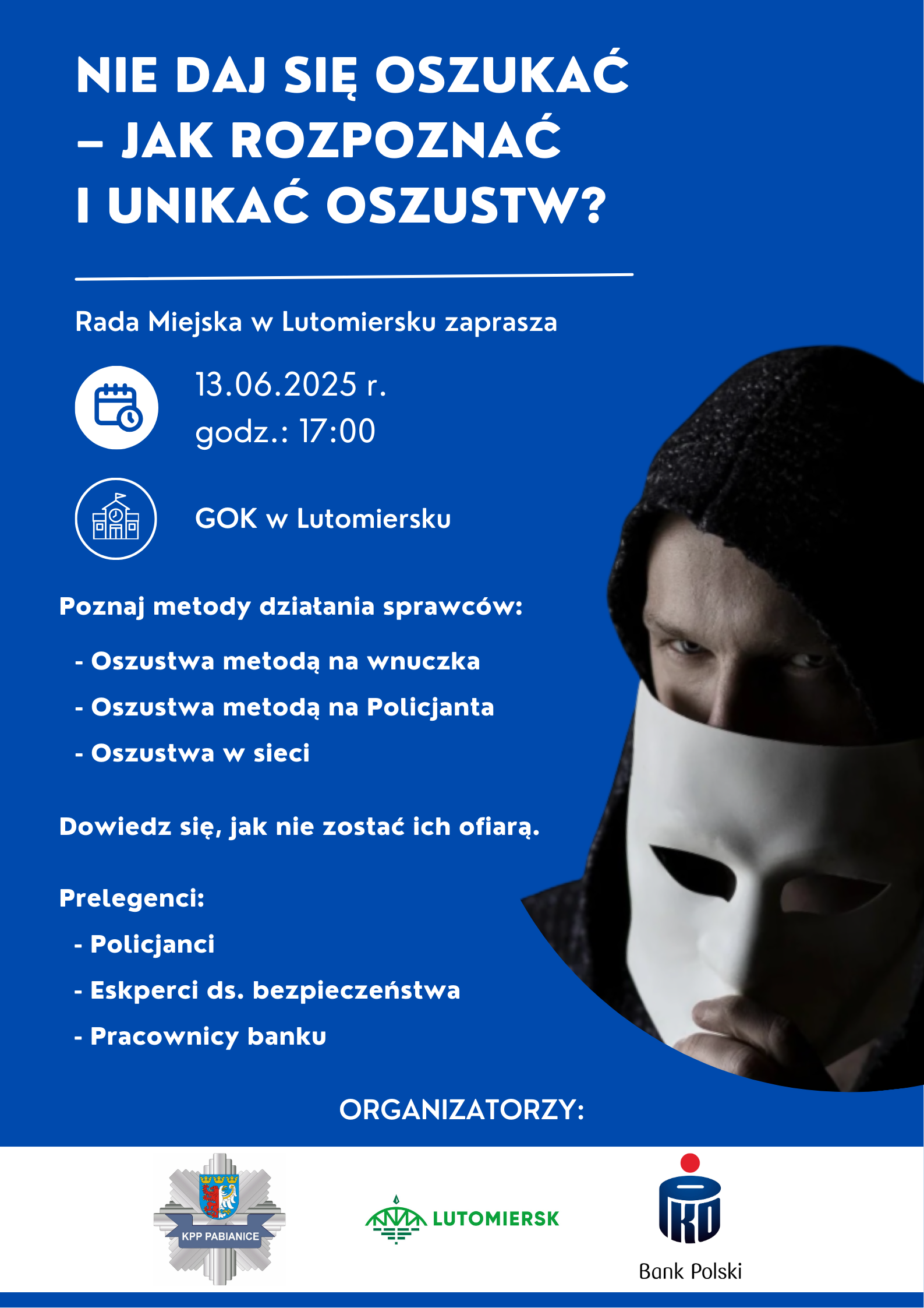 W dniu 13 czerwca 2025 roku o godzinie 17:00 w Gminnym Ośrodku Kultury w Lutomiersku odbędzie się spotkanie edukacyjne poświęcone tematyce oszustw.