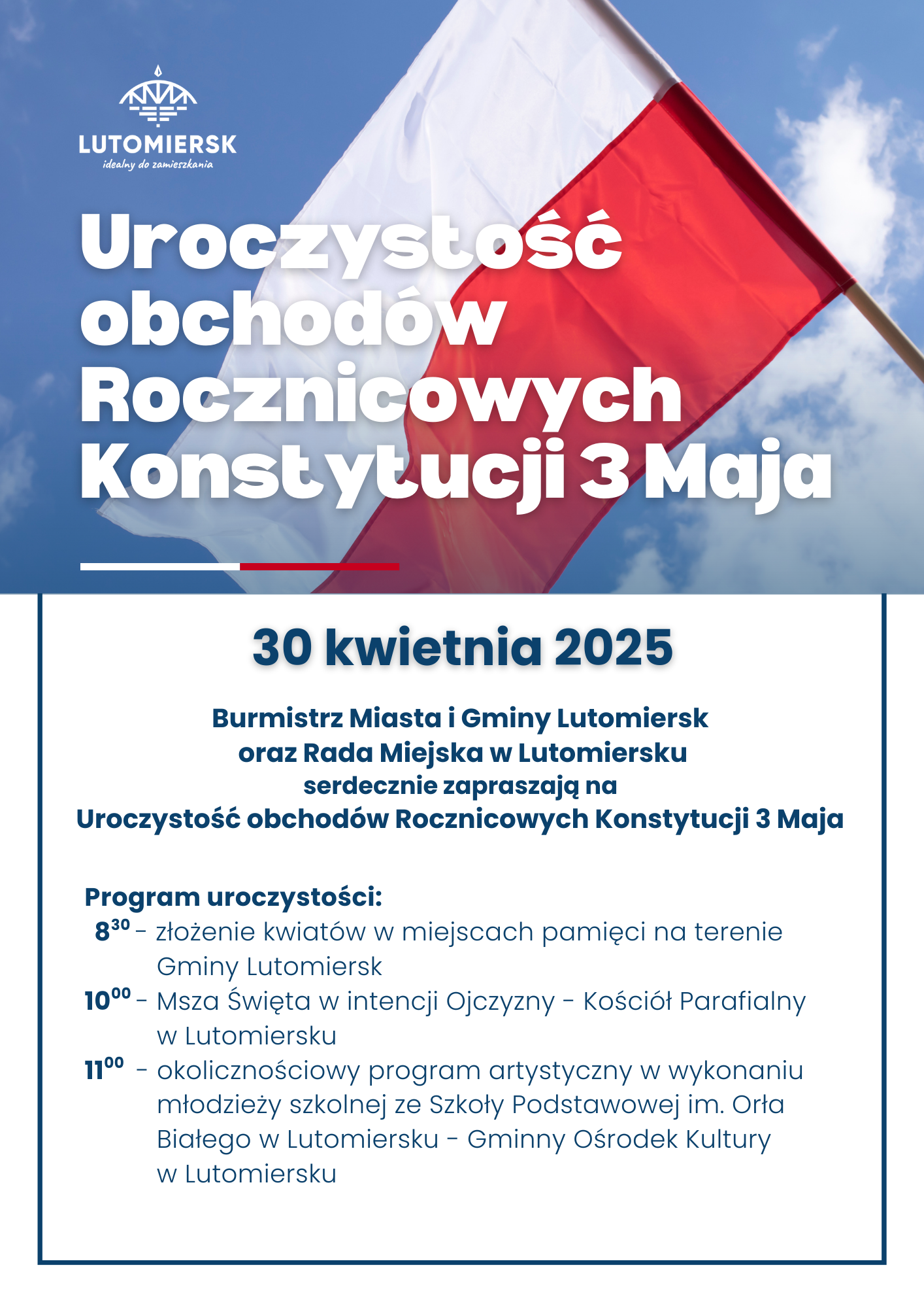 Burmistrz Miasta i Gminy Lutomiersk oraz Rada Miejska w Lutomiersku serdecznie zapraszają na uroczystość obchodów Rocznicy Konstytucji 3 Maja, która odbędzie się 30 kwietnia 2025 roku.