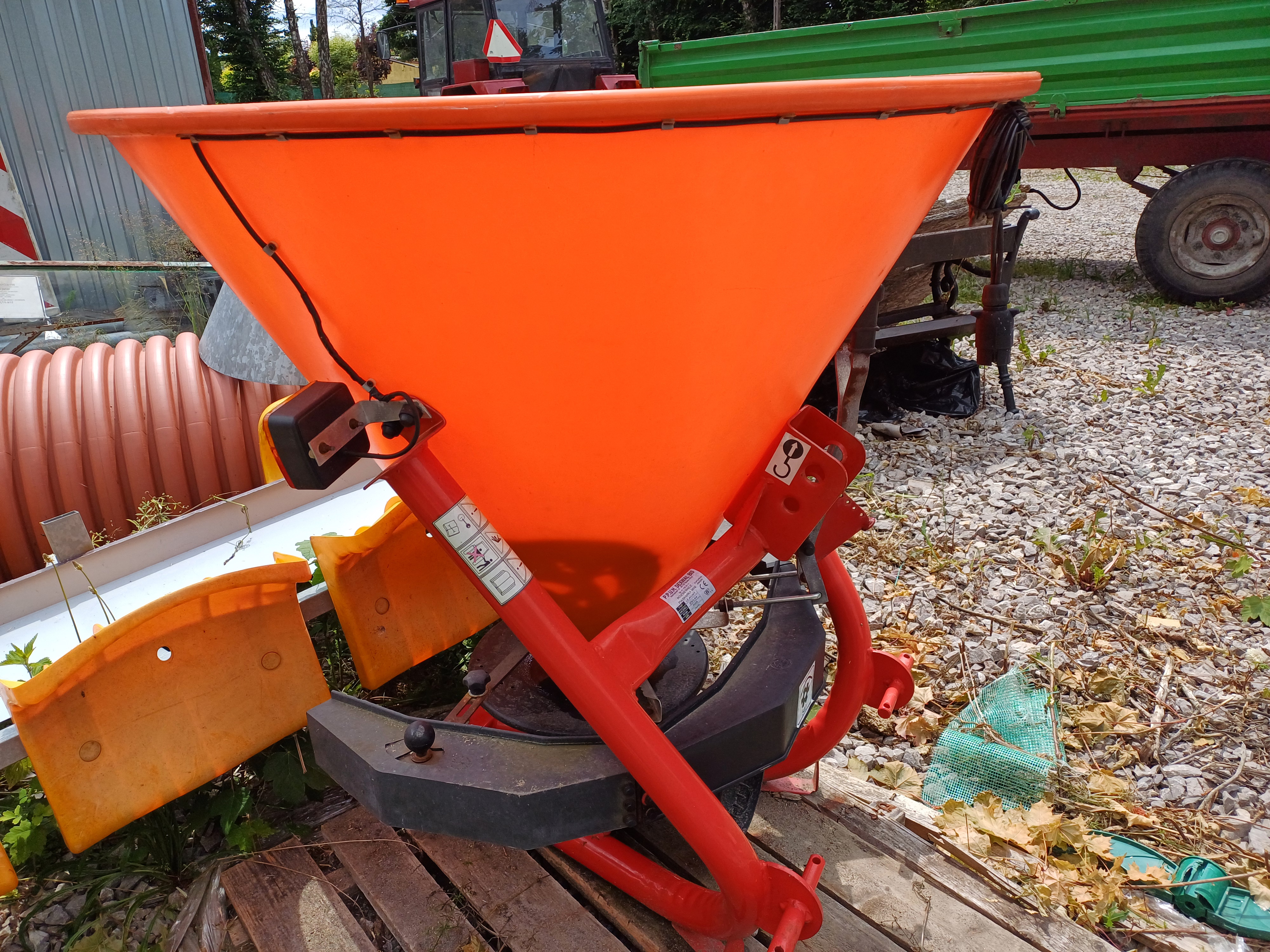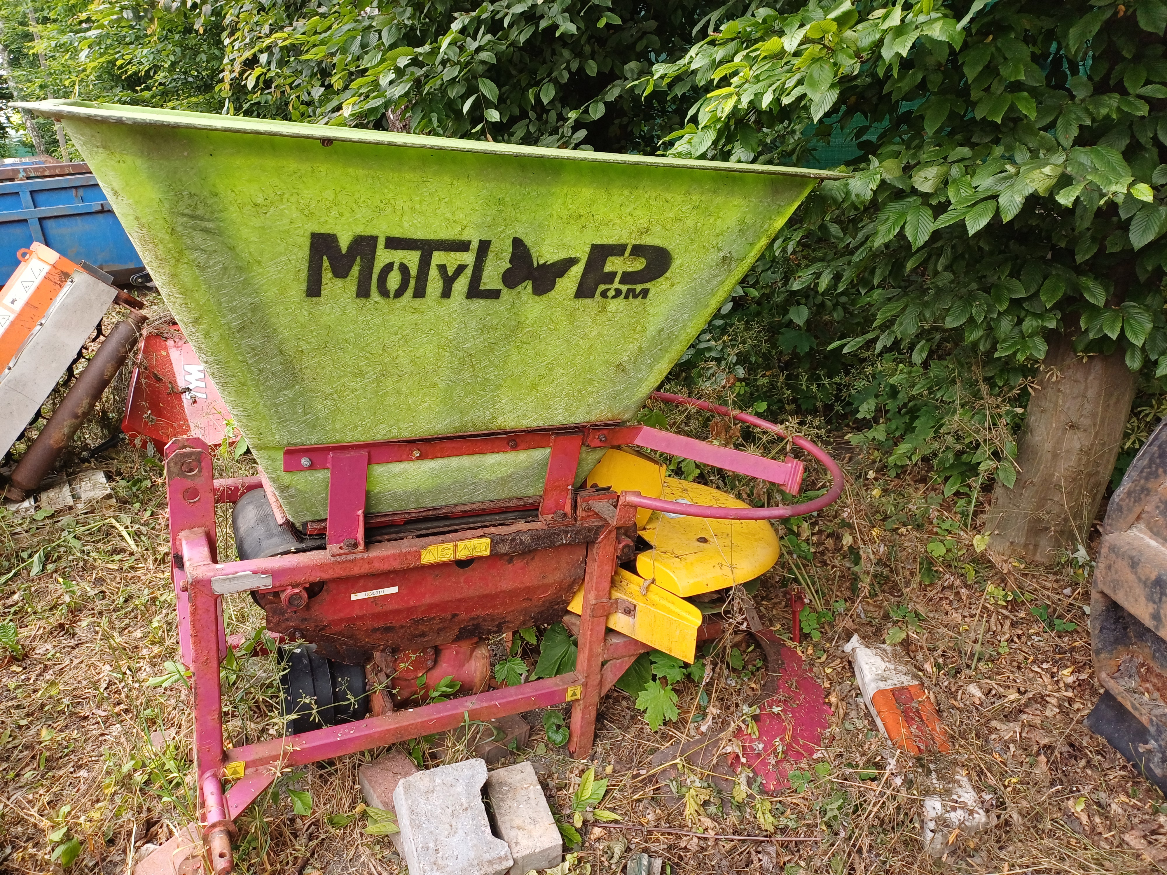 - Rozsiewacz nawozów marki MOTYL, typ N031M, prod. POM Augustów, rok produkcji 2015, masa własna 105kg, dopuszczalna wielkość ładunku 200-600kg w zależności od ciągnika, szerokość rozsiewu 8m, prędkość robocza 25 km/h;