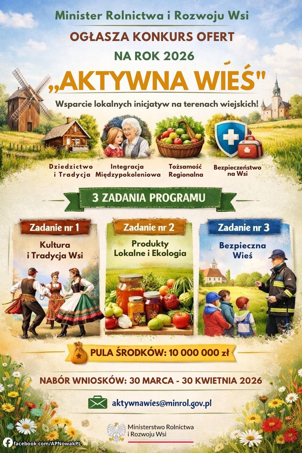 Ministerstwo Rolnictwa i Rozwoju Wsi ogłosił otwarty konkurs ofert w ramach programu „AKTYWNA WIEŚ”. Program ma na celu wspieranie inicjatyw społecznych na terenach wiejskich oraz zwiększenie atrakcyjności życia na wsi.