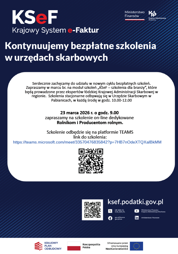 zapraszamy do udziału w BEZPŁATNYM szkoleniu dotyczącym KRAJOWEGO SYSTEMU e-FAKTUR (KSeF), skierowanym do rolników i producentów rolnych.
