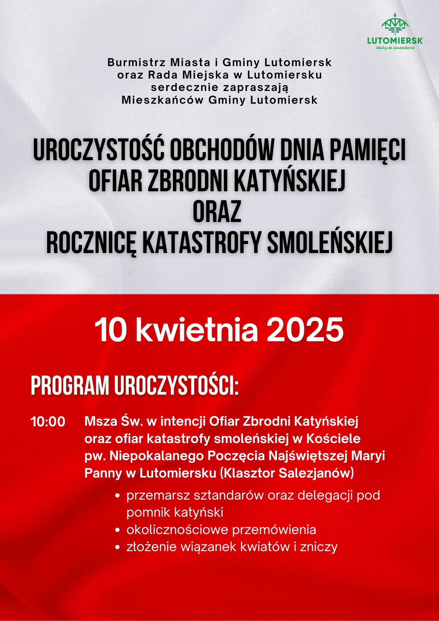 Burmistrz Miasta i Gminy Lutomiersk oraz Rada Miejska w Lutomiersku serdecznie zapraszają Mieszkańców Gminy Lutomiersk na Uroczystość Obchodów Dnia Pamięci Ofiar Zbrodni Katyńskiej oraz Rocznicy Katastrofy Smoleńskiej, która odbędzie się 10 kwietnia 2025 roku.