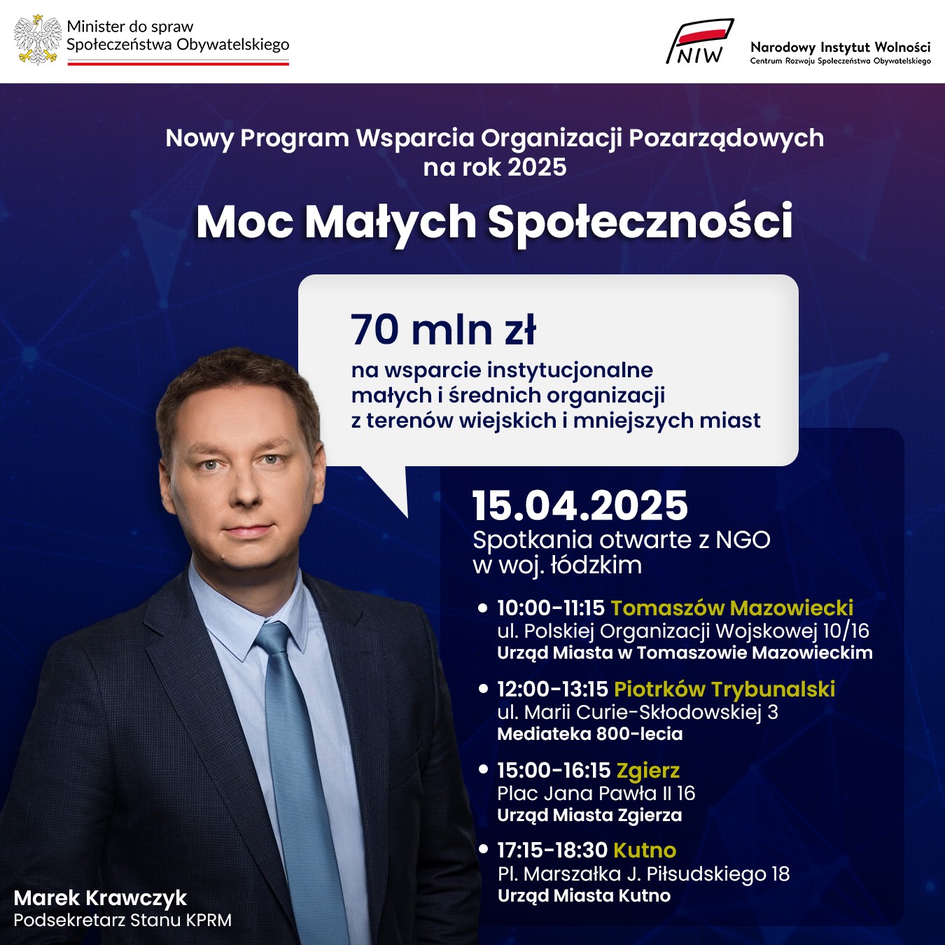 Już 15 kwietnia 2025 r. odbędą się spotkania informacyjne w naszym województwie, na które serdecznie zapraszamy przedstawicieli organizacji z terenu Gminy Lutomiersk:
