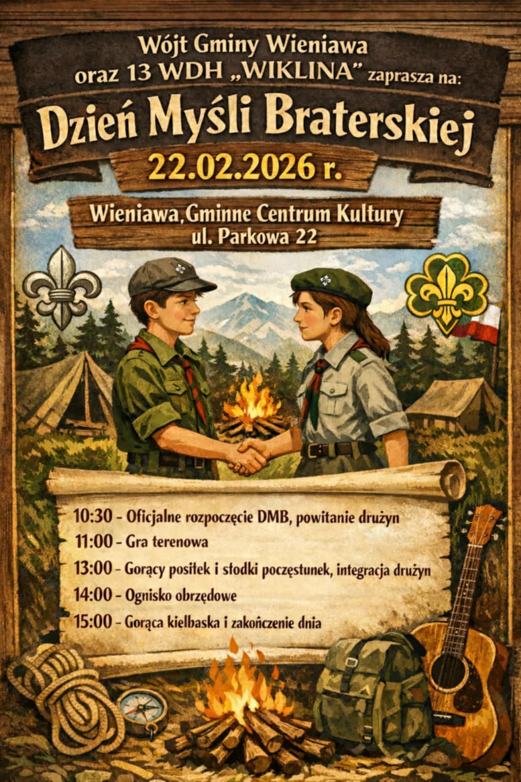 Wójt Gminy Wieniawa oraz 13 WDH „Wiklina” serdecznie zapraszają mieszkańców do udziału w Dniu Myśli Braterskiej, który odbędzie się 22 lutego 2026 r. w Gminnym Centrum Kultury w Wieniawie (ul. Parkowa 22).