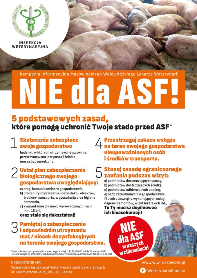 Niniejszym przedstawiamy apel Wojewody Mazowieckiego, który jest skierowany do wszystkich hodowców trzody chlewnej o podjęcie działań, które pozwolą ograniczyć szerzenie się choroby. Proszę o zachowanie szczególnej ostrożności i odpowiednich środków higieny oraz zasad bioasekuracji, które pozwolą zminimalizować ryzyko przeniesienia wirusa wywołującego ASF do niezarażonych gospodarstw. Ważne jest, aby m.in. dbać o czystość ubrań i obuwia używanego do obsługi świń, dezynfekować maszyny, pojazdy i sprzęt używany do obsługi świń, utrzymywać świnie w pełnej izolacji od dzików, a także innych zwierząt wolnożyjących oraz domowych. Obecnie nie ma szczepionki ani leków przeciw ASF, dlatego tak ważne są działania prewencyjne.