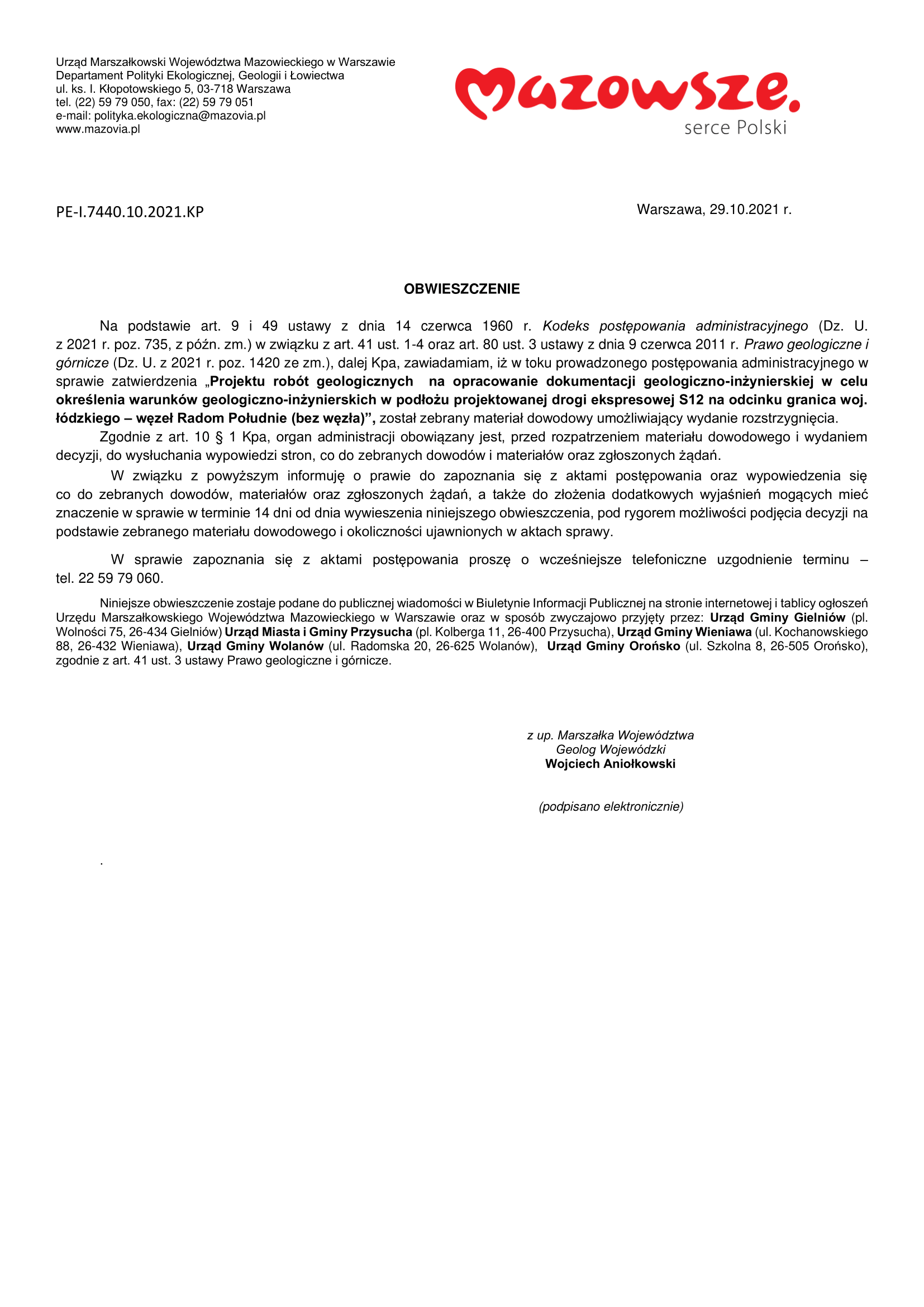 przekazujemy do publicznej wiadomości obwieszczenie Urzędu Marszałkowskiego Województwa Mazowieckiego z dnia 29.10.2021 r. PE-I.7440.10.2021.KP, iż w toku prowadzonego postępowania administracyjnego w sprawie zatwierdzenia „Projektu robót geologicznych na opracowanie dokumentacji geologiczno-inżynierskiej w celu określenia warunków geologiczno-inżynierskich w podłożu projektowanej drogi ekspresowej S12 na odcinku granica woj. łódzkiego – węzeł Radom Południe (bez węzła)”, został zebrany materiał dowodowy umożliwiający wydanie rozstrzygnięcia. W sprawie zapoznania się z aktami postępowania należy kontaktować się pod numerem tel. 22 59 79 060.