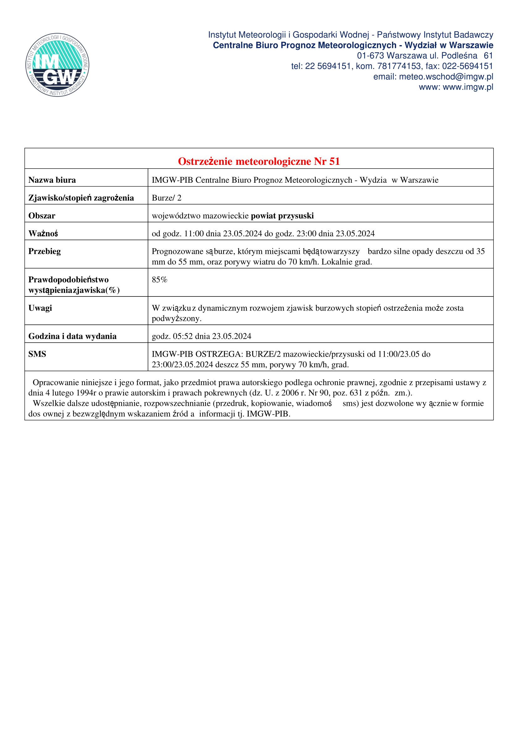 od godz. 11:00 dnia 23.05.2024 do godz. 23:00 dnia 23.05.2024 prognozowane są burze, którym miejscami będą towarzyszyć bardzo silne opady deszczu od 35 mm do 55 mm, oraz porywy wiatru do 70 km/h. Lokalnie grad.