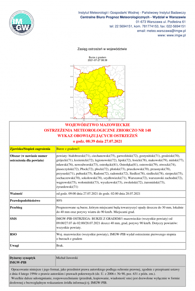 od godz. 09:00 dnia 27.07.2021 do godz. 02:00 dnia 28.07.2021 prognozowane są burze, którym miejscami będą towarzyszyć ulewne opady deszczu dd 30 mm, lokalnie do 40 mm oraz porywy wiatru do 90 km/h. Miejscami grad.