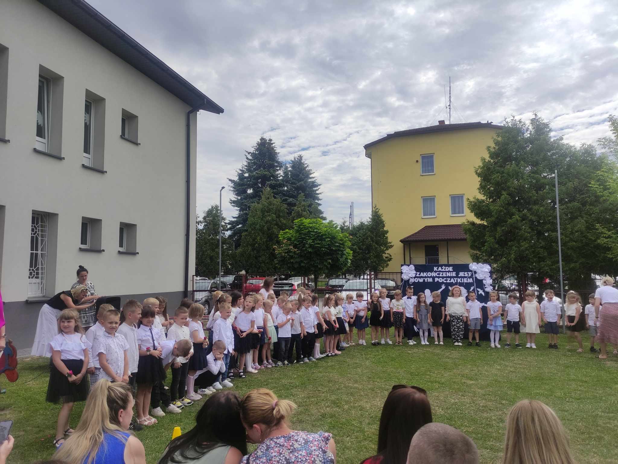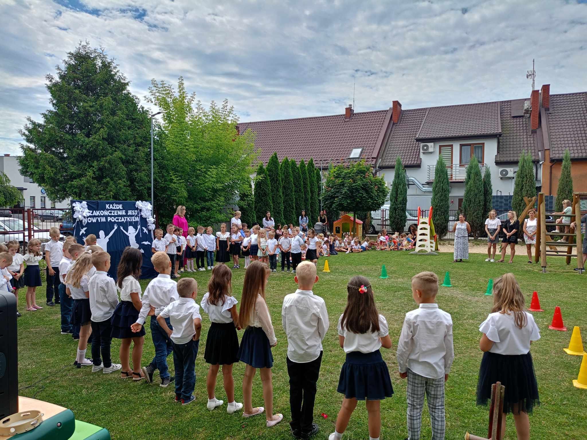 Impreza rozpoczęła się na przedszkolnym placu zabaw, który tego dnia został odświętnie udekorowany. Zgromadzonych powitała Pani Dyrektor, która w swoim przemówieniu podkreśliła znaczenie tych wspólnych lat spędzonych w przedszkolu, dziękując zarówno dzieciom, jak i rodzicom za zaangażowanie i współpracę.