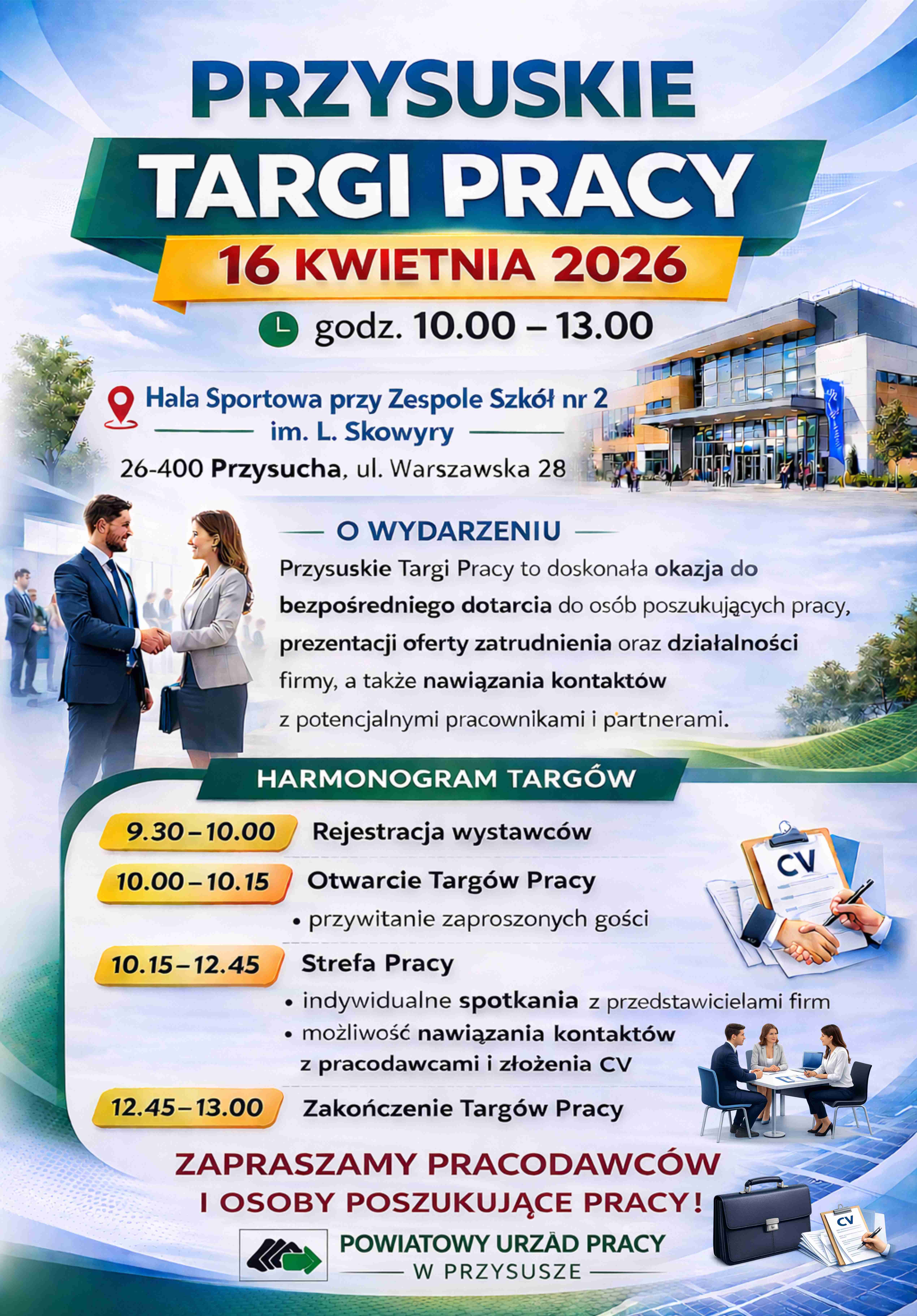 Serdecznie zapraszamy pracodawców do udziału w pierwszej edycji Targów Pracy w Przysusze, które odbędą się 16 kwietnia 2026 r. (czwartek) w godzinach 10:00–13:00 w Hali Sportowej przy Zespole Szkół nr 2 im. L. Skowyry, 26-400 Przysucha ul. Warszawska 28
