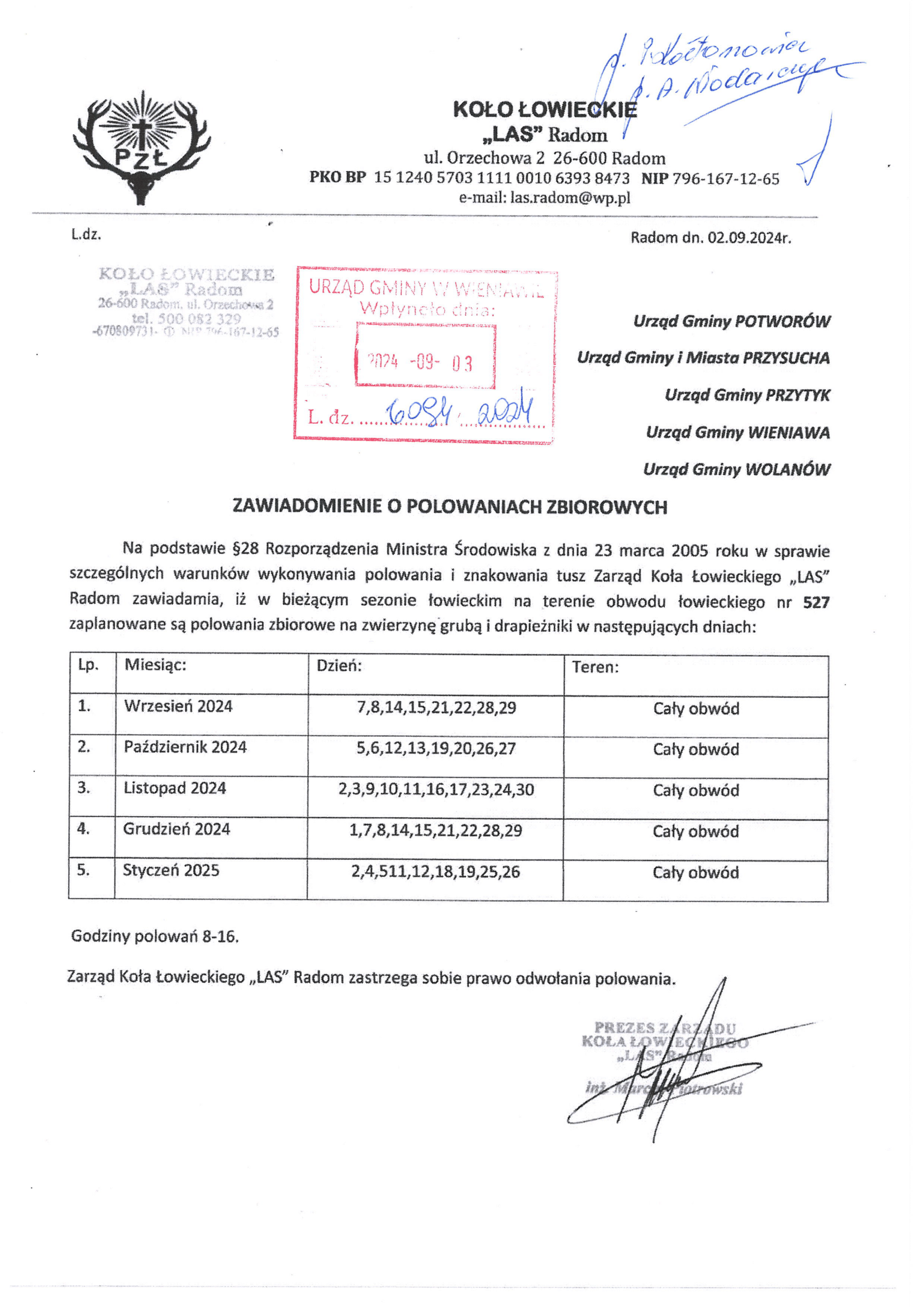 Zawiadomienie o polowaniach zbiorowych