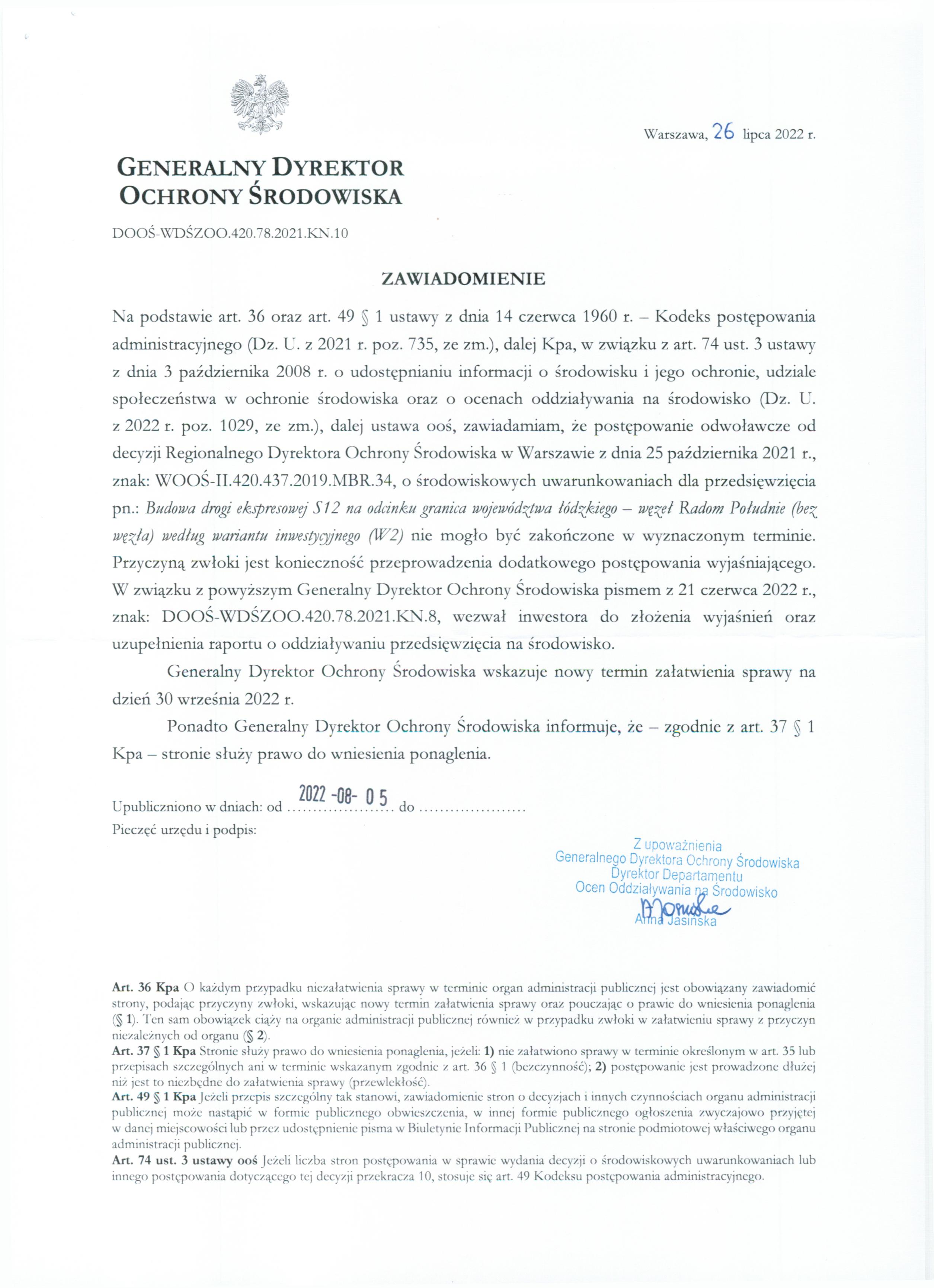 W związku z prowadzonym postępowaniem odwoławczym od decyzji Regionalnego Dyrektora Ochrony Środowiska w Warszawie z dnia 25 października 2021 r., znak: WOOS-II.420.437.2019.MBR.34, o środowiskowych uwarunkowaniach dla przedsięwzięcia pn.: budowa drogi ekspresowej S12 na odcinku granica województwa łódzkiego — węzła Radom Południe (bez węzła) według wariantu inwestycyjnego (W2), zgodnie z art. 49 § 1 ustawy z dnia 14 czerwca 1960 r. - Kodeks postępowania administracyjnego (Dz. U. z 2021 r. poz. 735, ze zm.) podajemy do publicznej wiadomości zawiadomienie o przedłużeniu terminu załatwienia sprawy.