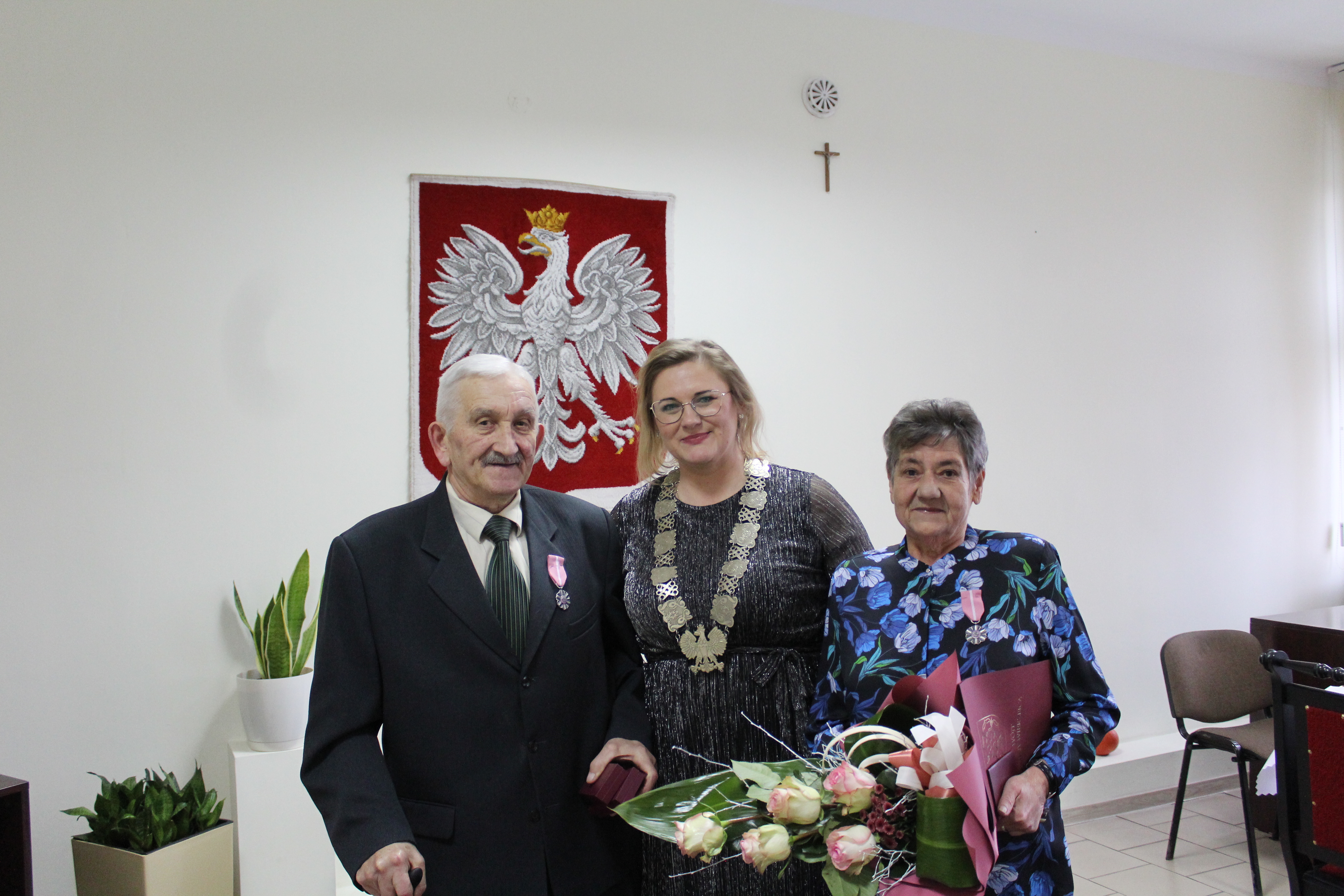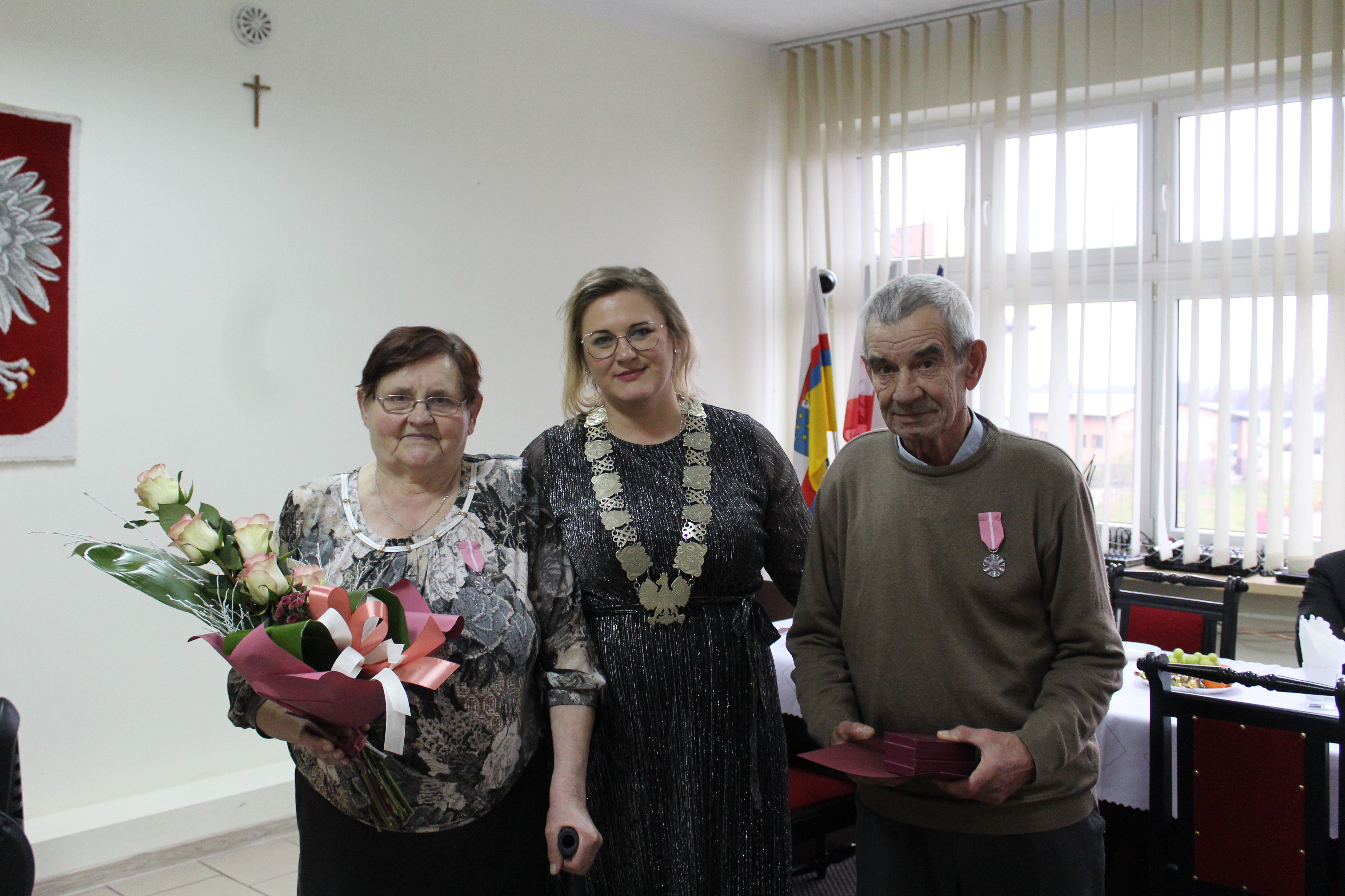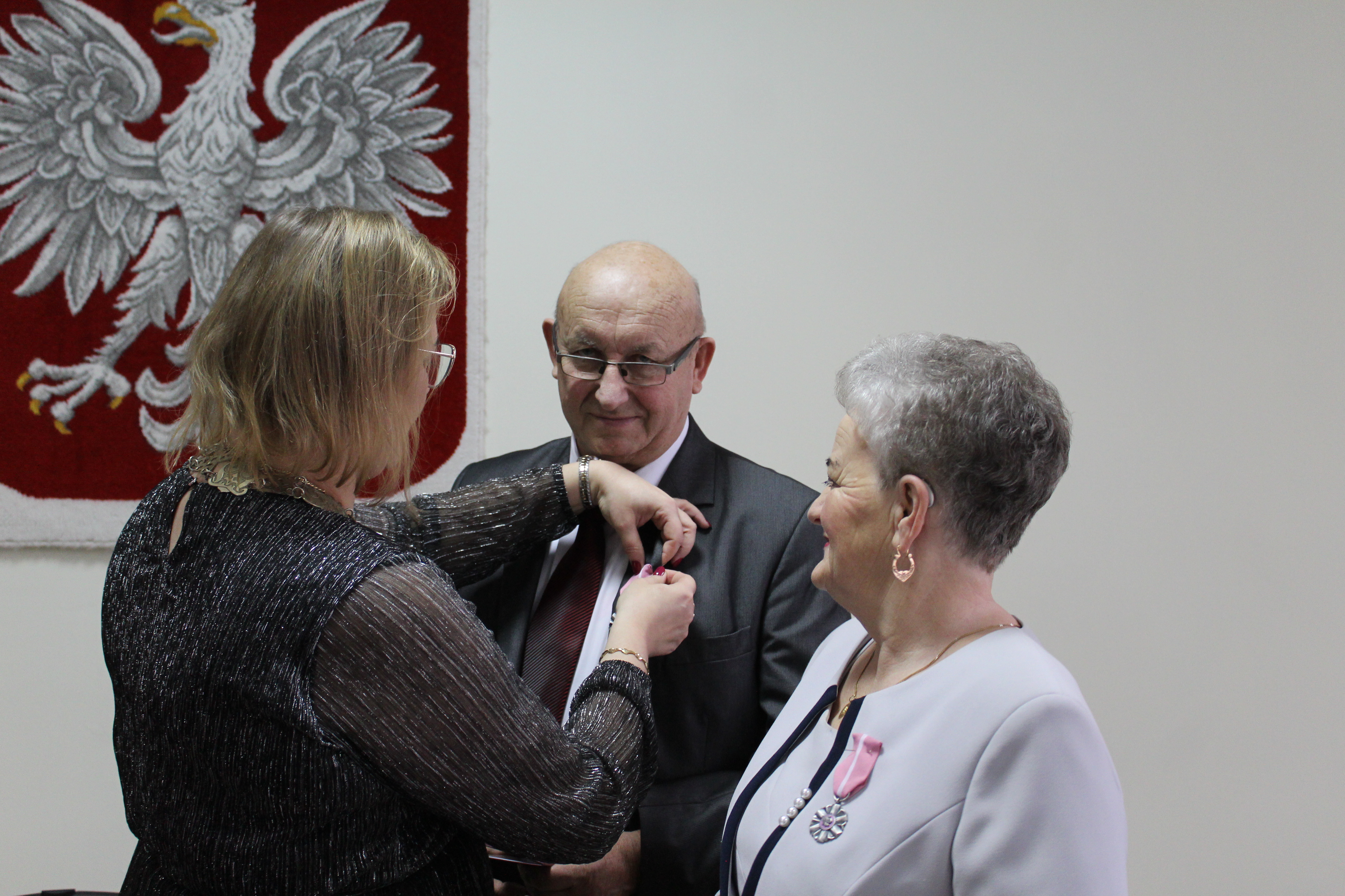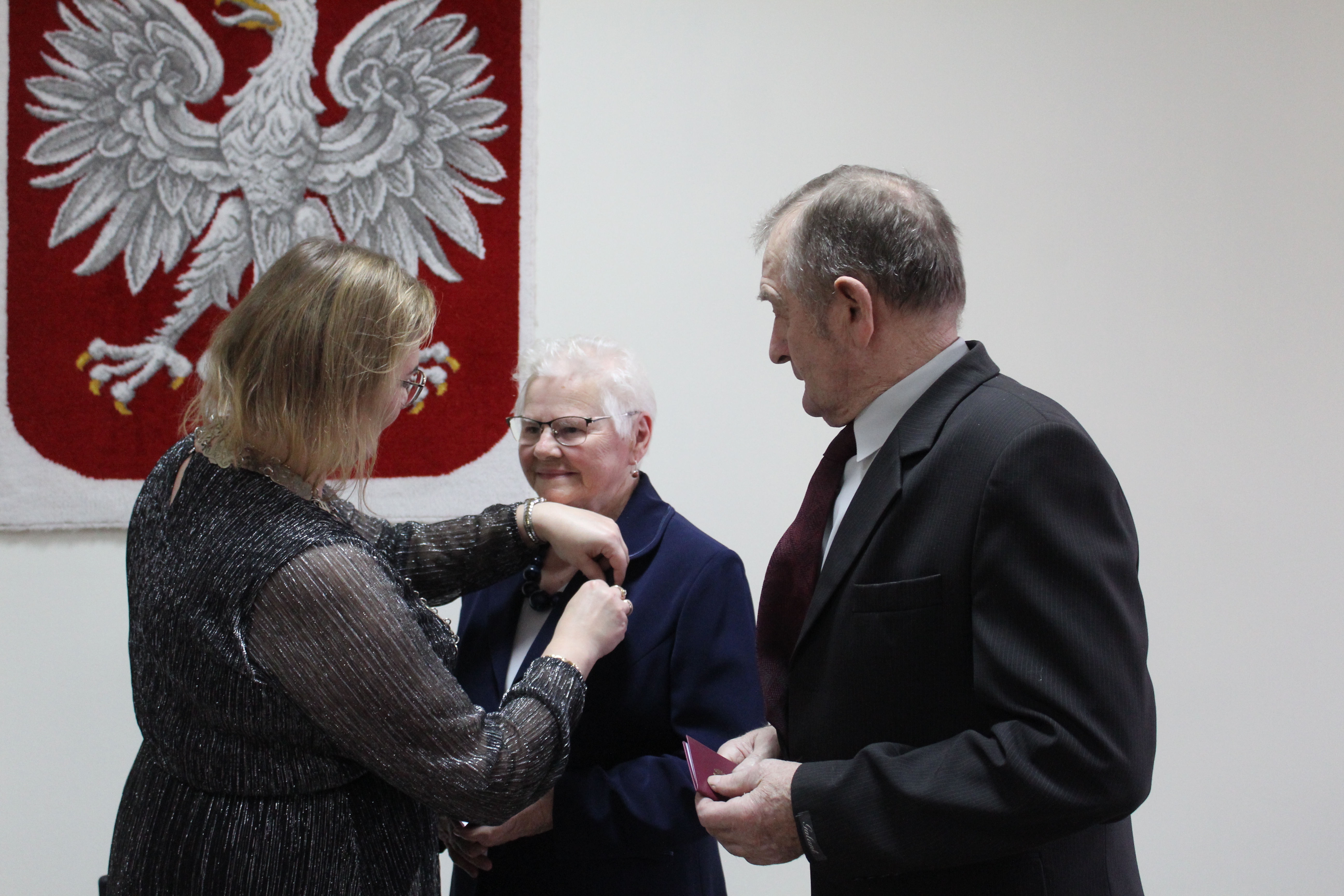 Następnie Wójt Gminy Wierzbica Agnieszka Jastrzębska wraz z Sekretarzem Gminy Eugeniuszem Wolszczakiem, kierownikiem Urzędu Stanu Cywilnego Sandrą Rosą i zastępcą kierownika USC Magdaleną Spasińską wręczyli medale przyznane Jubilatom przez Prezydenta Rzeczypospolitej Polskiej.