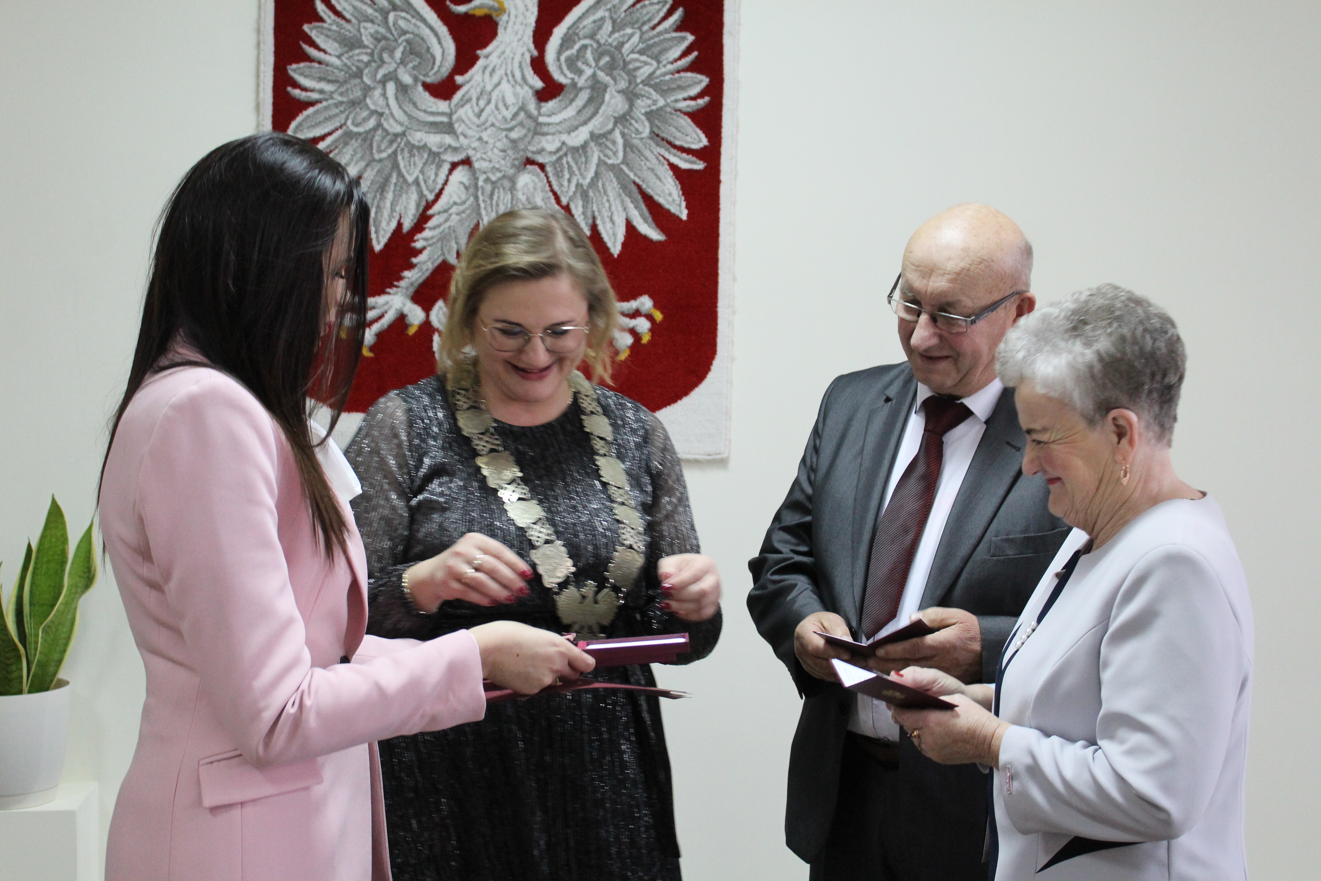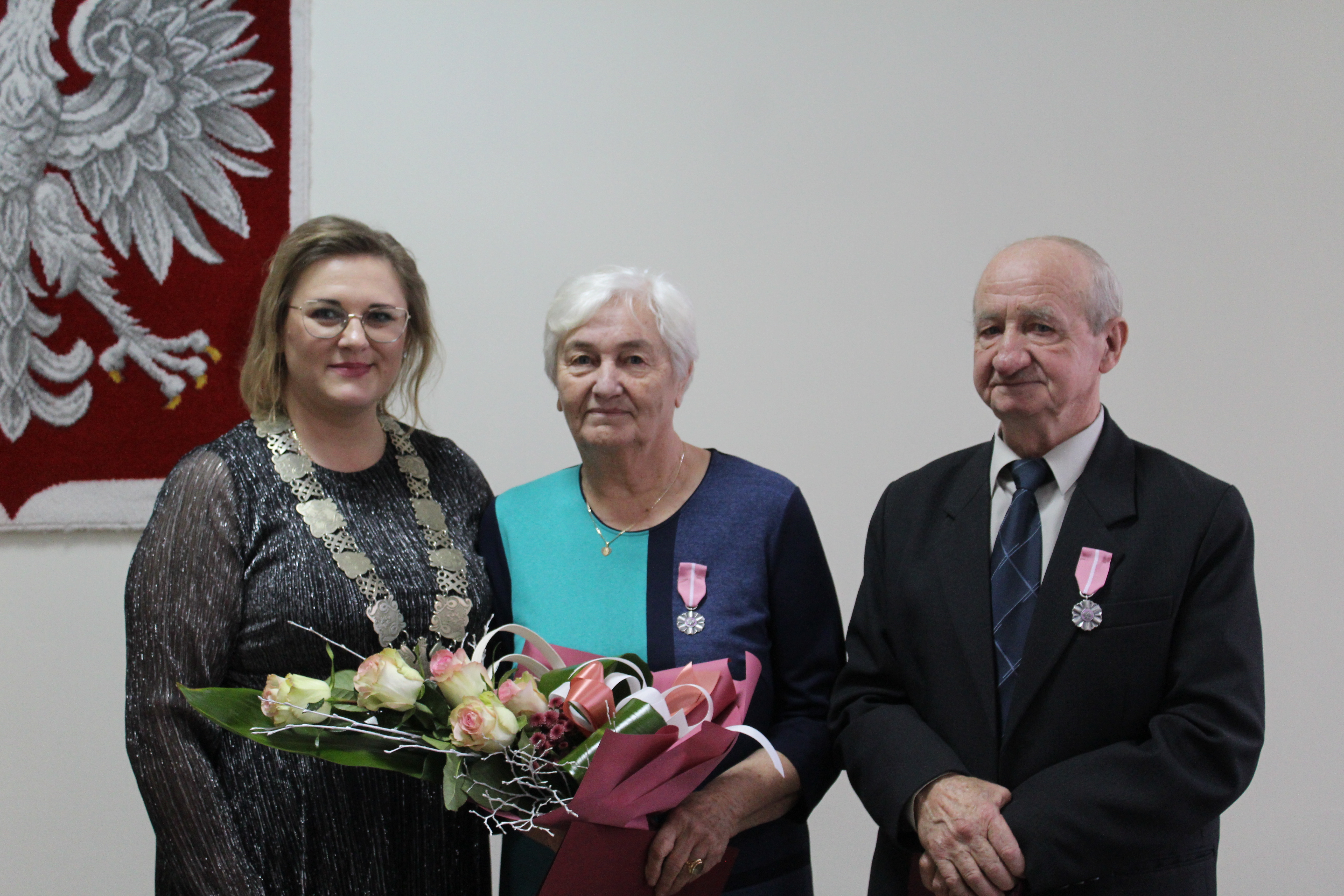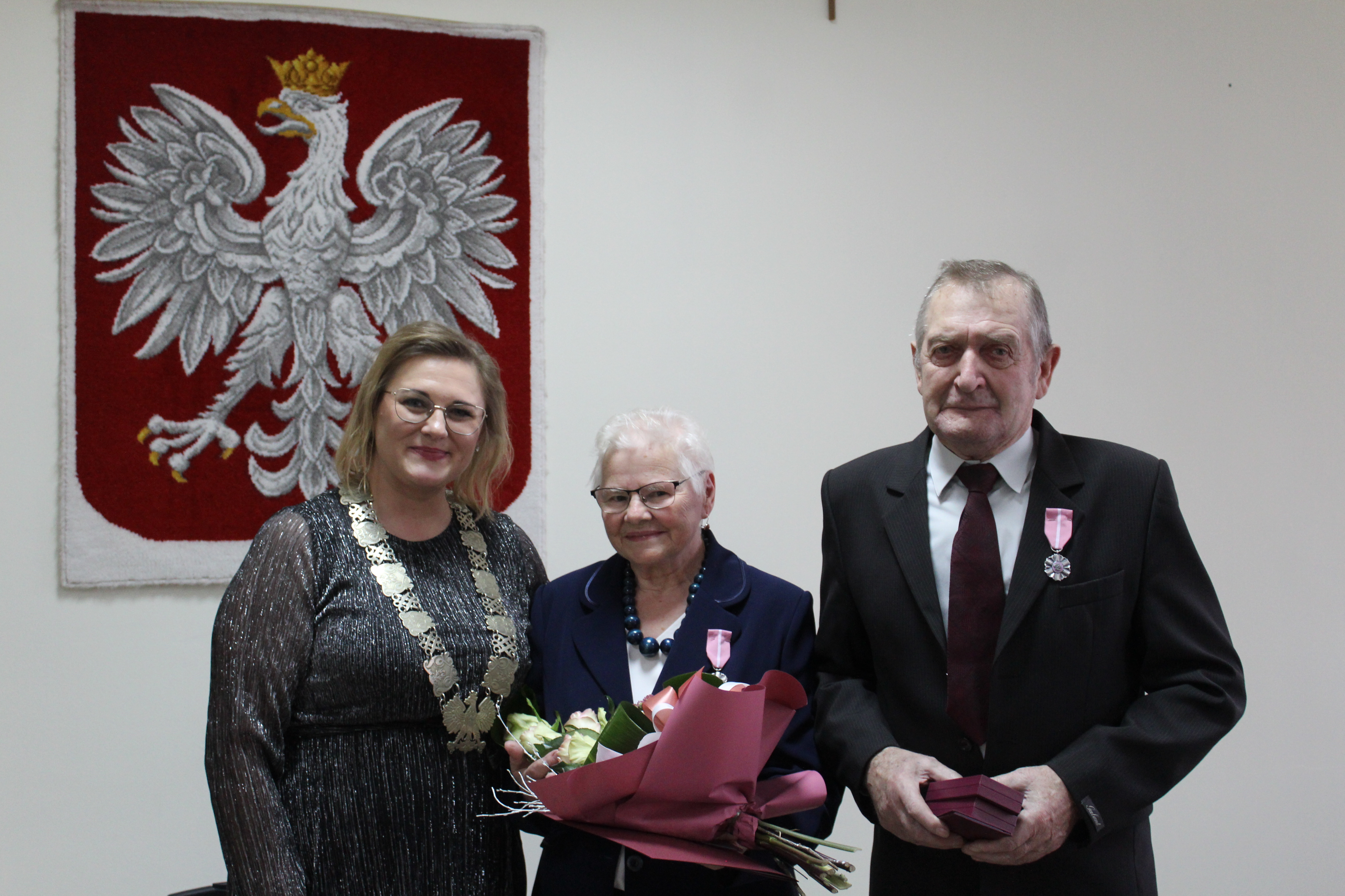 Następnie Wójt Gminy Wierzbica Agnieszka Jastrzębska wraz z Sekretarzem Gminy Eugeniuszem Wolszczakiem, kierownikiem Urzędu Stanu Cywilnego Sandrą Rosą i zastępcą kierownika USC Magdaleną Spasińską wręczyli medale przyznane Jubilatom przez Prezydenta Rzeczypospolitej Polskiej.