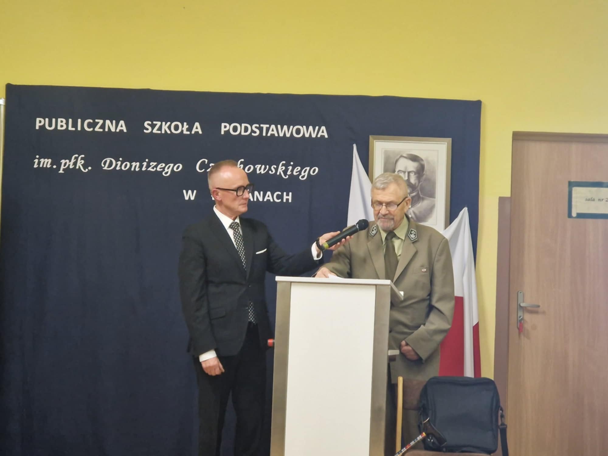 Wśród zgromadzonych mieliśmy zaszczyt gościć Pana Jana Chryzostoma Czachowskiego, potomka słynnego patrona, który również zabrał głos i przedstawił zasługi płk. Dionizego Czachowskiego w walce o naszą wolność. Opowiedział najważniejsze dzieje z jego życia, o tym jak ważna jest ojczyzna, patriotyzm oraz pamięć o zmarłych, którzy walczyli o niepodległą Polskę.