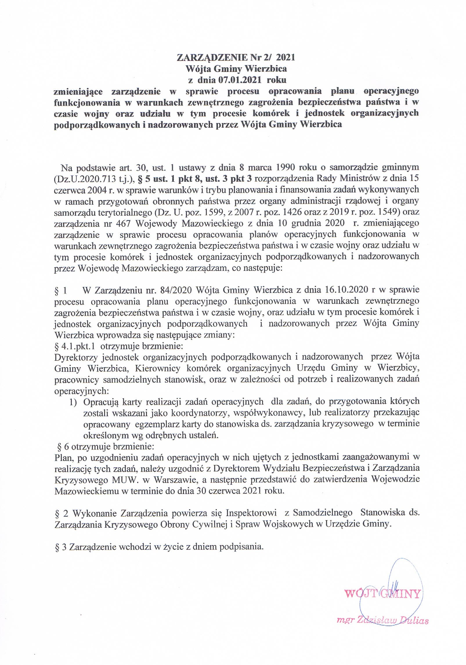 Zarządzenie Nr 2/2021 Wójta Gminy Wierzbica z dnia 7.01.2021 r. zmieniające zarządzenie w sprawie procesu opracowania planu operacyjnego funkcjonowania w warunkach zewnętrznego zagrożenia bezpieczeństwa państwa i w czasie wojny oraz udziału w tym procesie komórek i jednostek organizacyjnych podporządkowanych i nadzorowanych przez Wójta Gminy Wierzbica