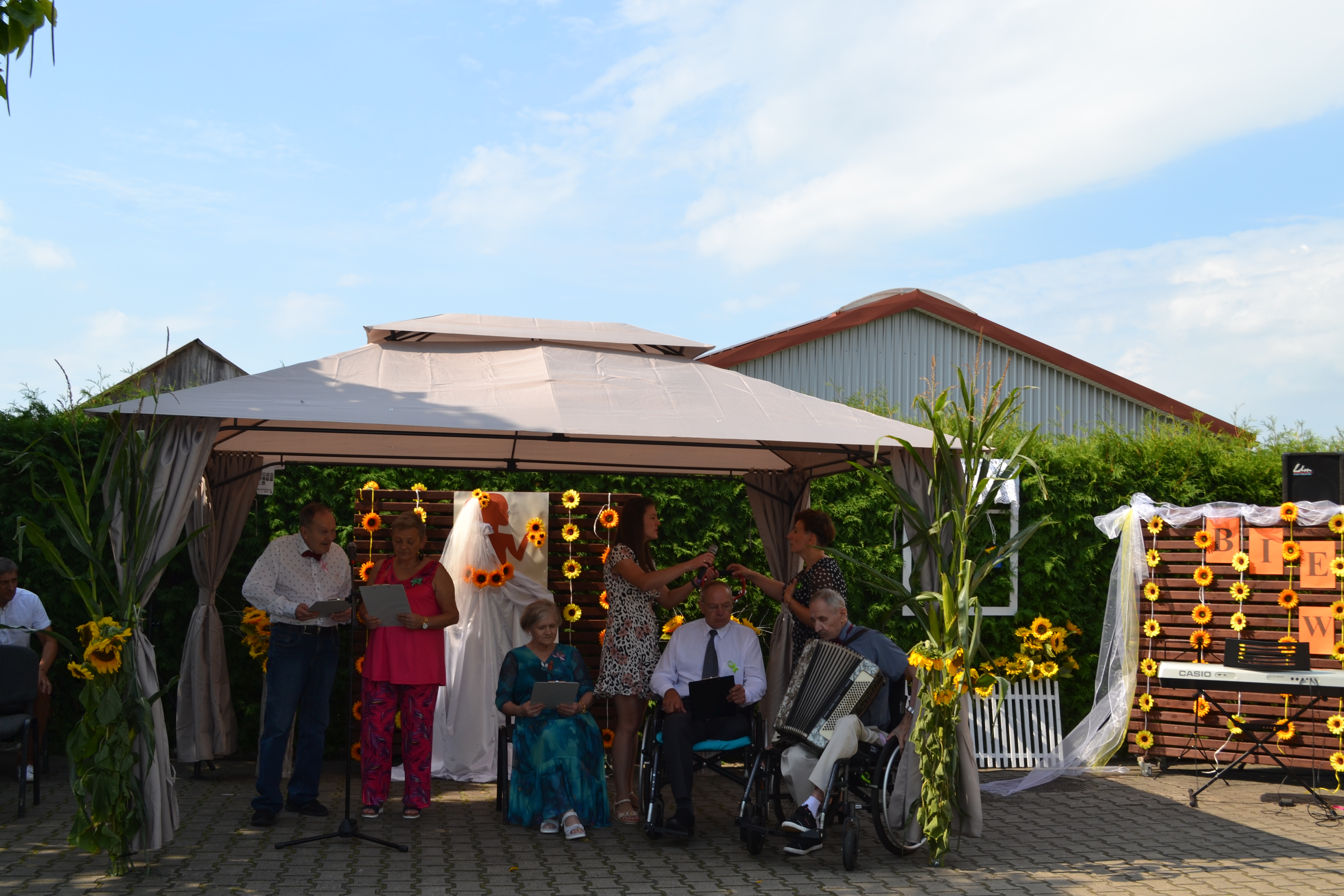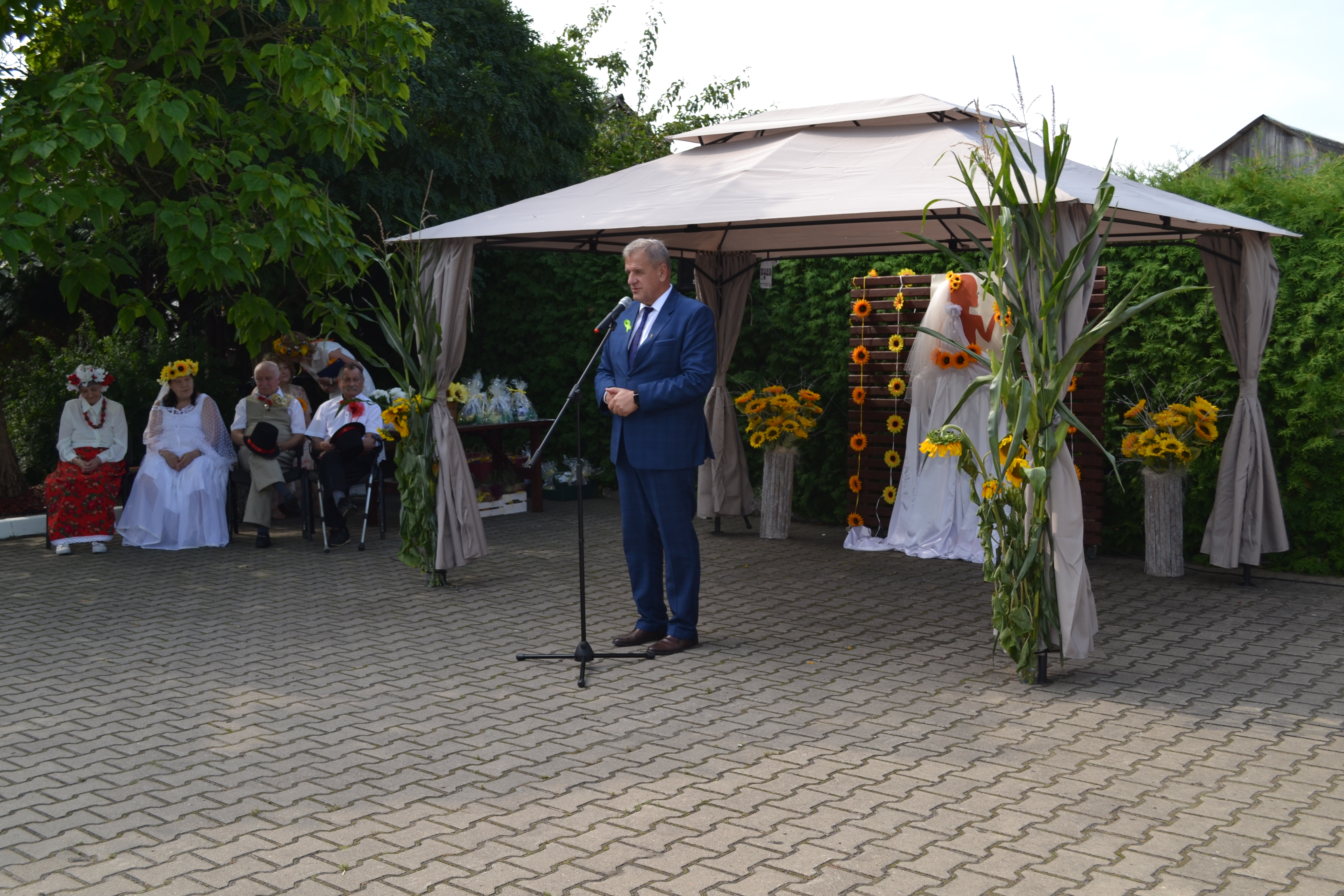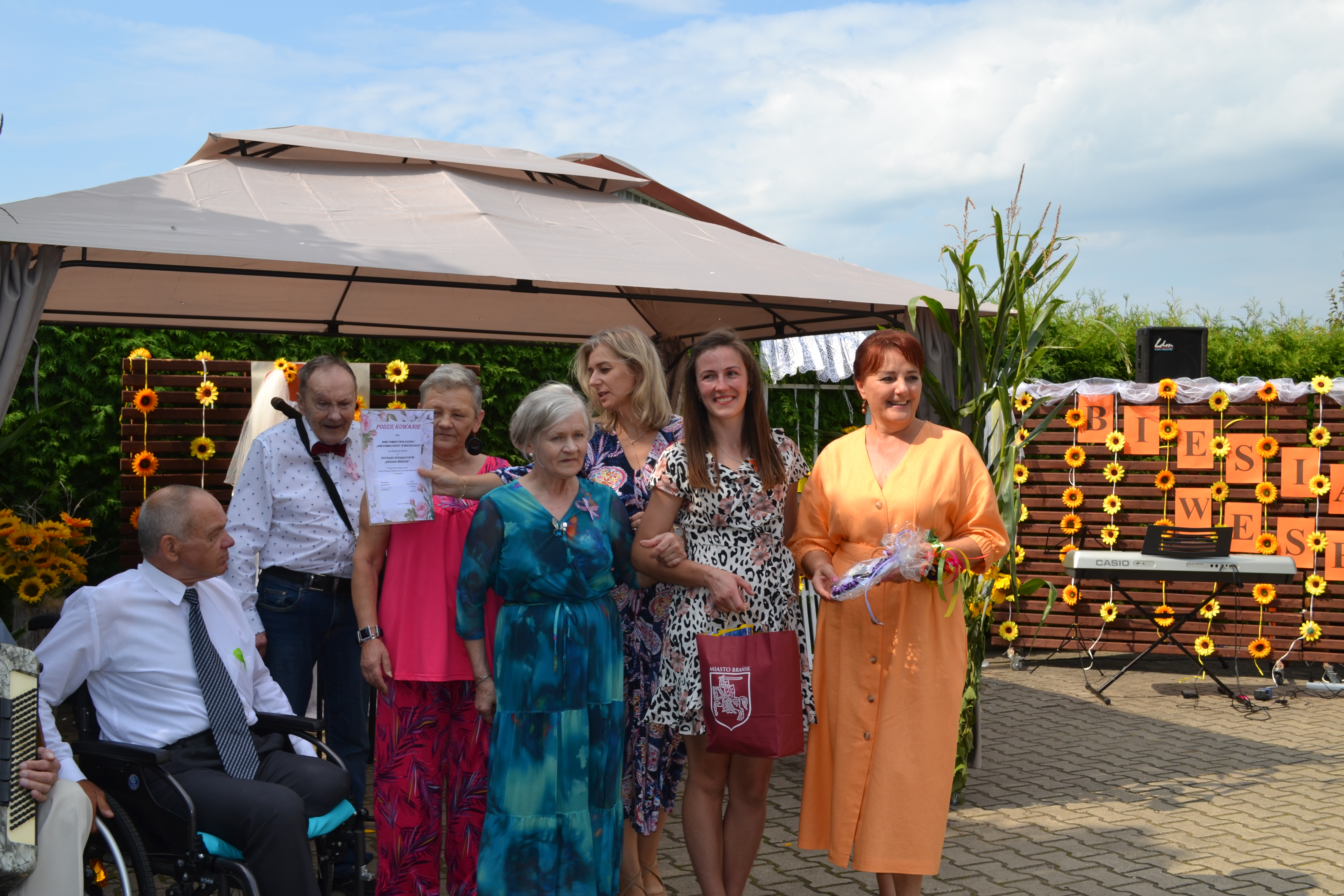 Odniosła się do sytuacji z okresu pandemii, która w szczególny sposób dotknęła domy pomocy społecznej. Podziękowała wszystkim osobom ,które wspierały domy pomocy. Zwróciła się do obecnych wśród zaproszonych gości starosty Sławomira Jerzego Snarskiego i wicestarosty Piotra Bożko, dziękując im za zaangażowanie w tamtym trudnym okresie. Podziękowała też dr Ewie Kierdelewicz z Przychodni Rodzinnej ZOZ w Brańsku, która wówczas i dziś jest blisko mieszkańców domu. Witając pozostałych gości dziekana i proboszcza parafii w Brańsku ks. Andrzeja Ulaczyka oraz kapelanów domu ks. Janusza Łoniewskiego i Marka Jakimiuka oraz licznych sponsorów i mieszkańców domów pomocy społecznej z opiekunami i dyrektorami życzyła, aby dzień ten był dniem radości i uśmiechu, tak jak żółte słoneczniki będące dekoracją tej imprezy.