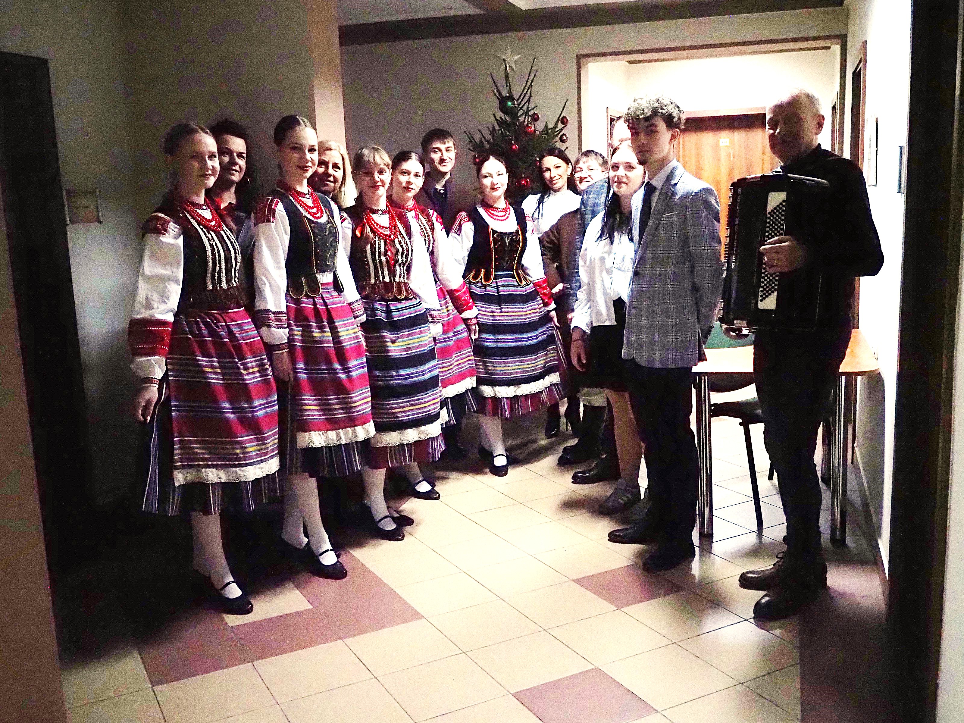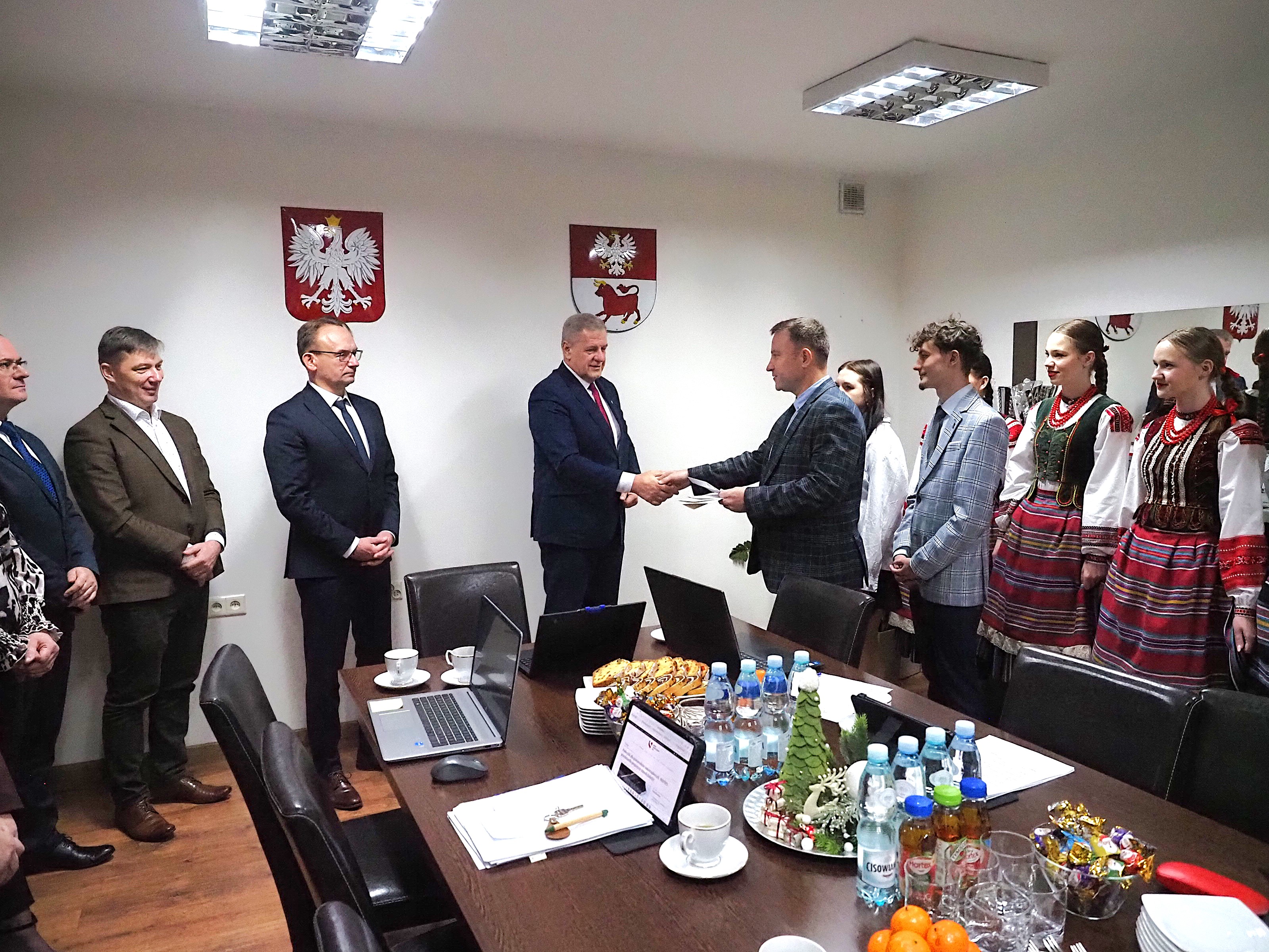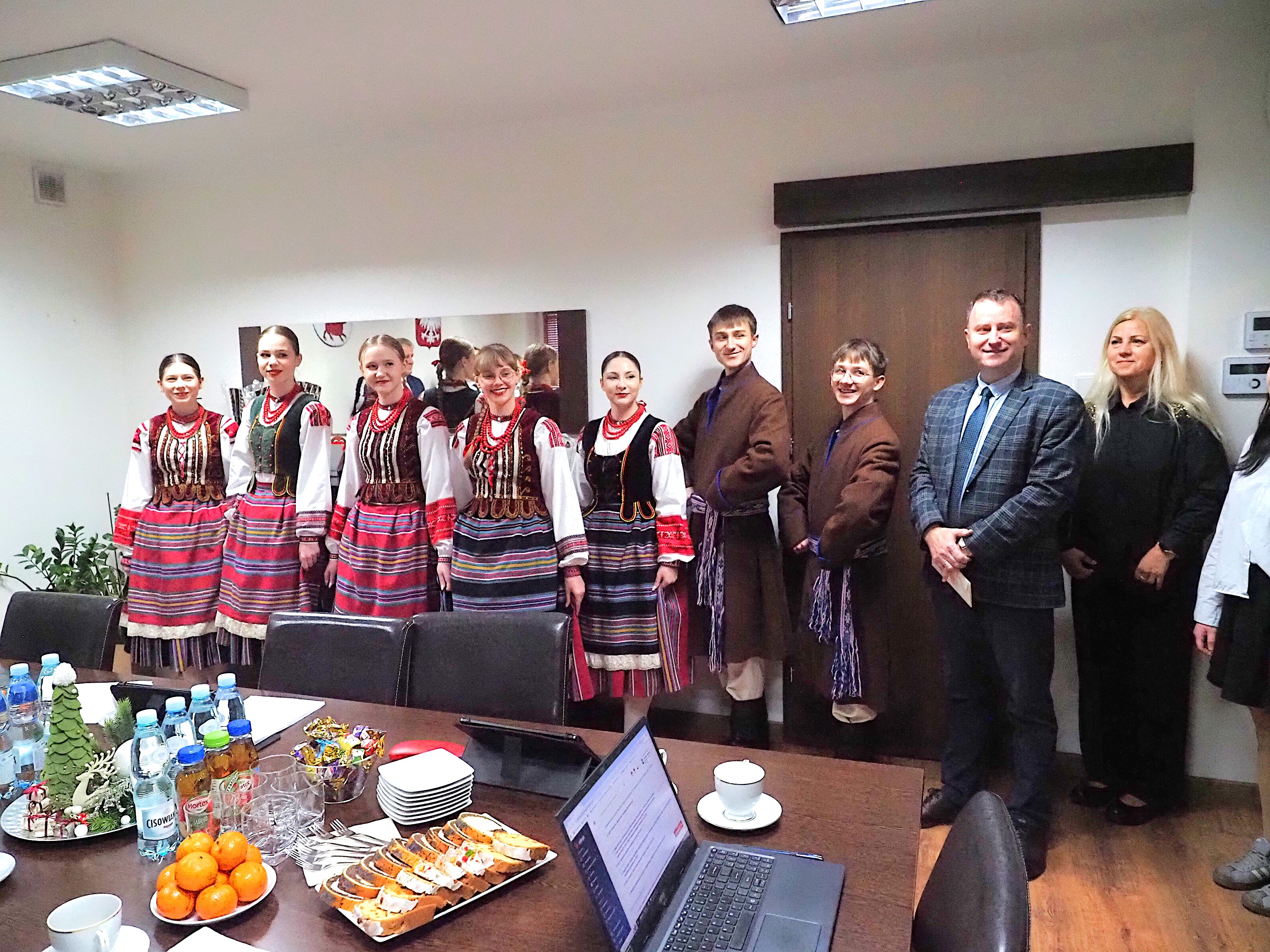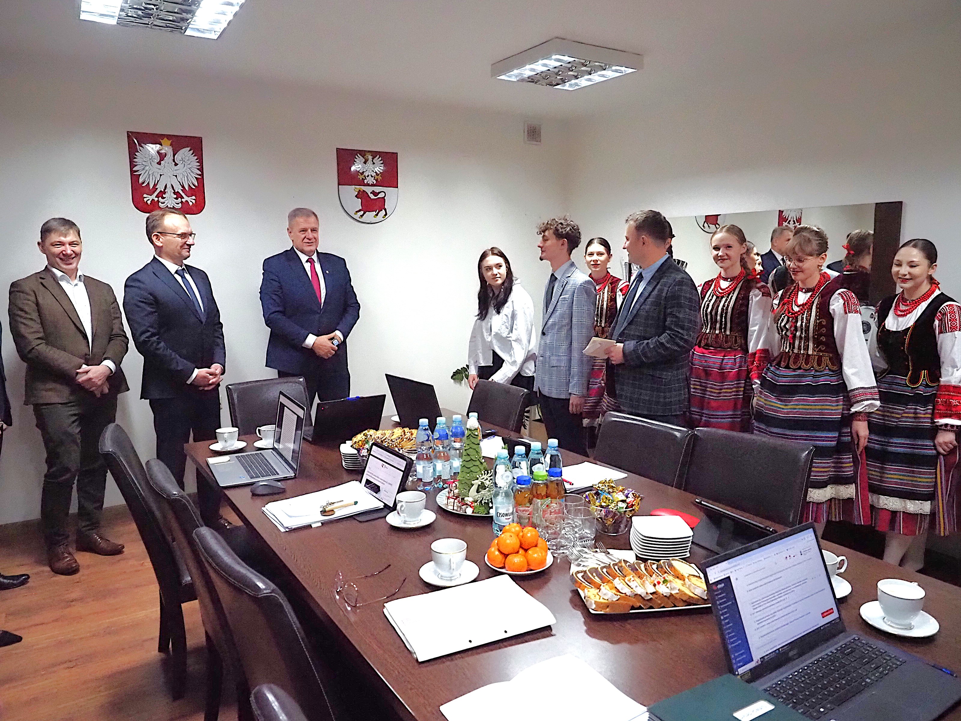 Dyrektor szkoły Bolesław Hryniewicki i młodzi kolędnicy na ręce starosty i wicestarosty złożyli całemu zarządowi życzenia świąteczne. Następnie młodzież zaśpiewała skoczne pastorałki i tradycyjne kolędy, które przy akompaniamencie akordeonu stworzyły prawdziwie świąteczny klimat i na chwilę oderwały od codziennych obowiązków. Posiedzenie zarządu powiatu dzięki młodym kolędnikom nabrało wyjątkowo ciepłego, bożonarodzeniowego charakteru.