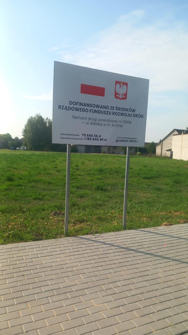W piątek 29 sierpnia Powiatowy Zarząd Dróg w Bielsku Podlaskim dokonał odbioru końcowego inwestycji pn.: „Remont drogi powiatowej Nr 1599B - ul. Bielska w m. Brańsk”. Dzięki staraniom władz Powiatu Bielskiego otrzymano dofinansowanie z Rządowego Funduszu Rozwoju Dróg w wysokości 711.649,56 zł. Całkowity koszt realizacji zadania wyniósł 1.186.648,40 zł.