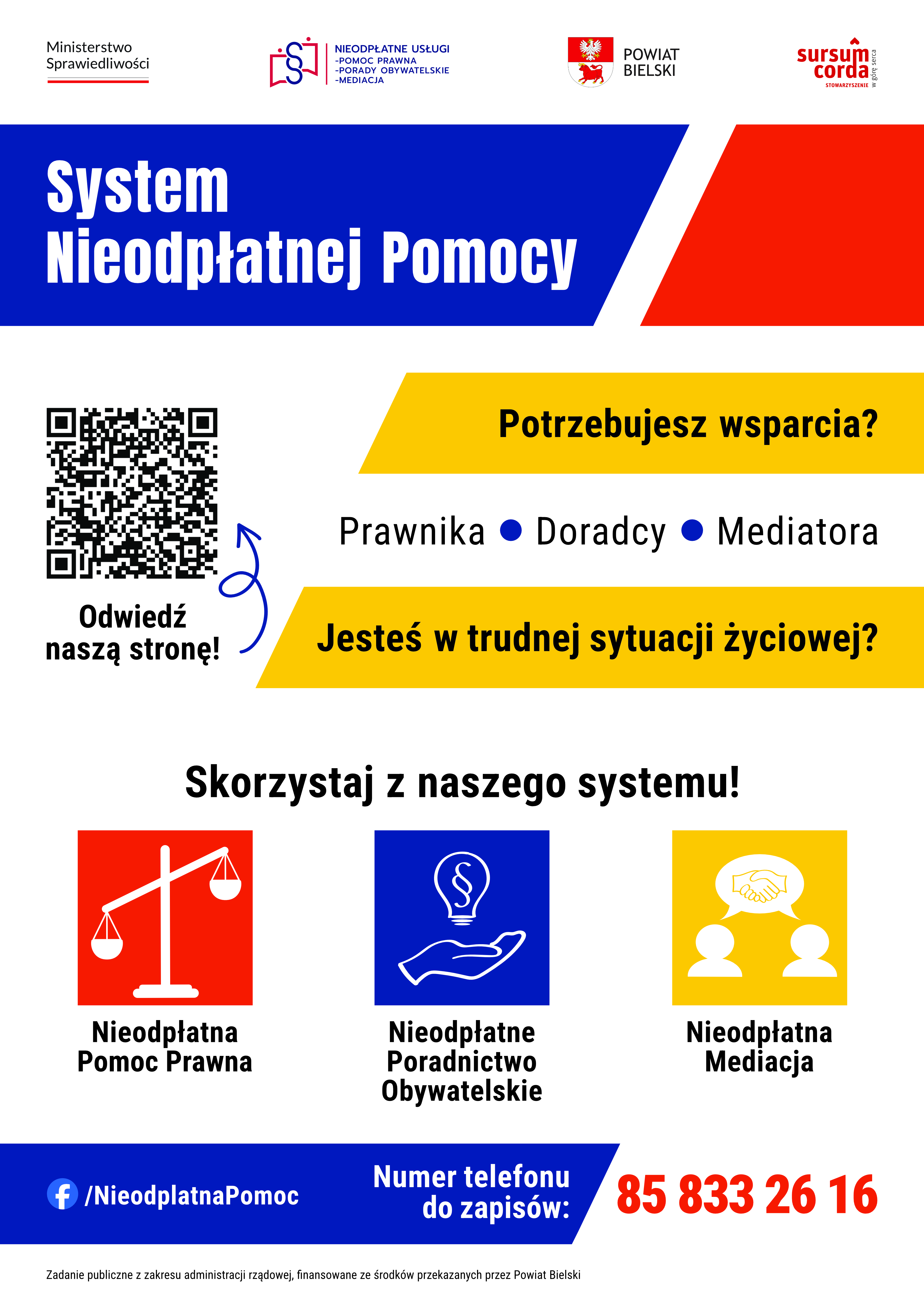 Szukasz pomocy lub wsparcia prawnego w trudnej sprawie? Nie stać Cię na skorzystanie z usług kancelarii prawnej i nie masz się do kogo zwrócić o pomoc? Zapraszamy do korzystania z punktów nieodpłatnej pomocy prawnej i poradnictwa obywatelskiego na terenie powiatu bielskiego. Znajdziesz tam profesjonalną i darmową pomoc radców prawnych, adwokatów, mediatorów oraz osób zajmujących się poradnictwem obywatelskim. Pomoc świadczona jest na podstawie ustawy o nieodpłatnej pomocy prawnej, nieodpłatnym poradnictwie obywatelskim oraz edukacji prawnej.