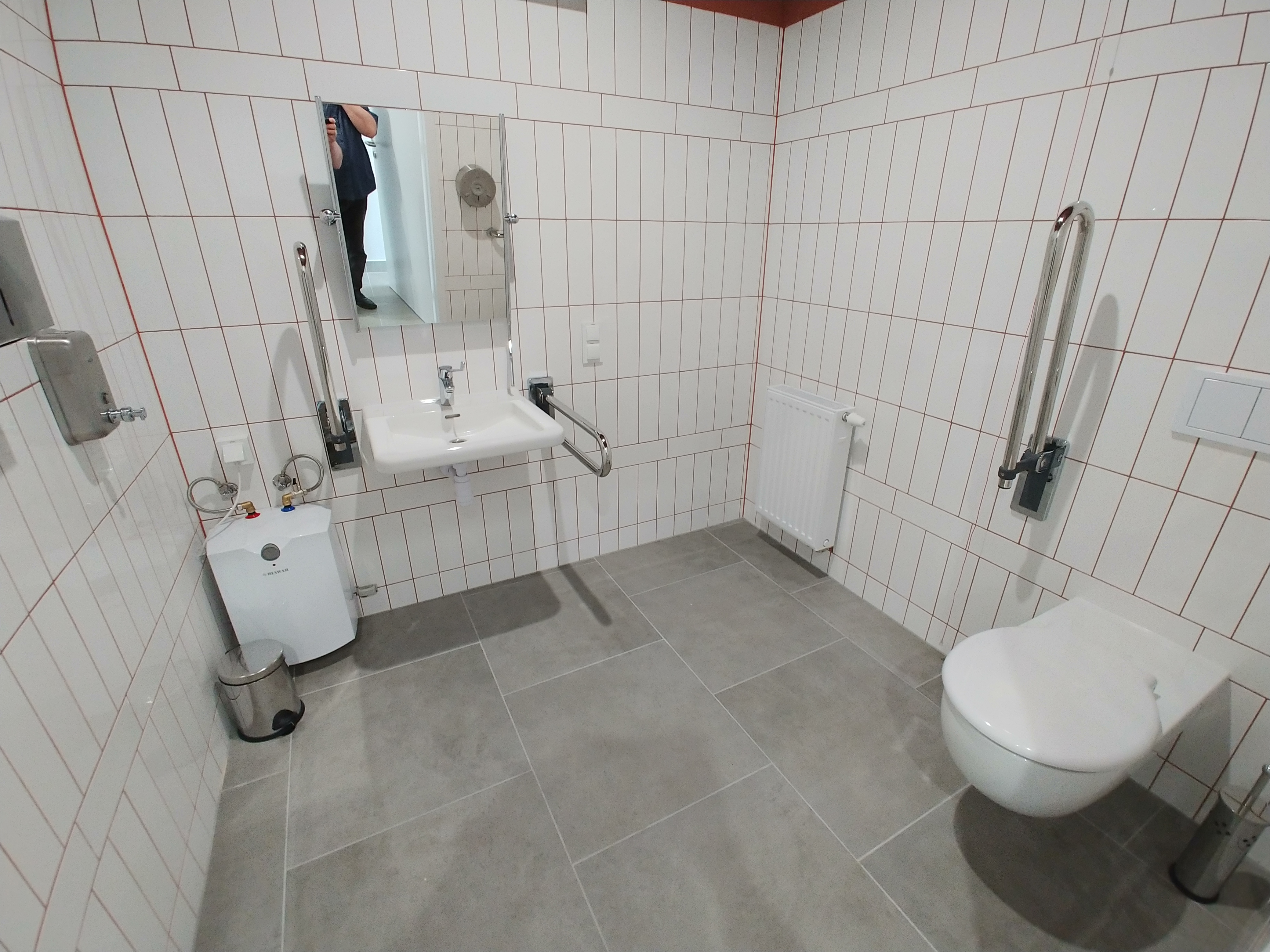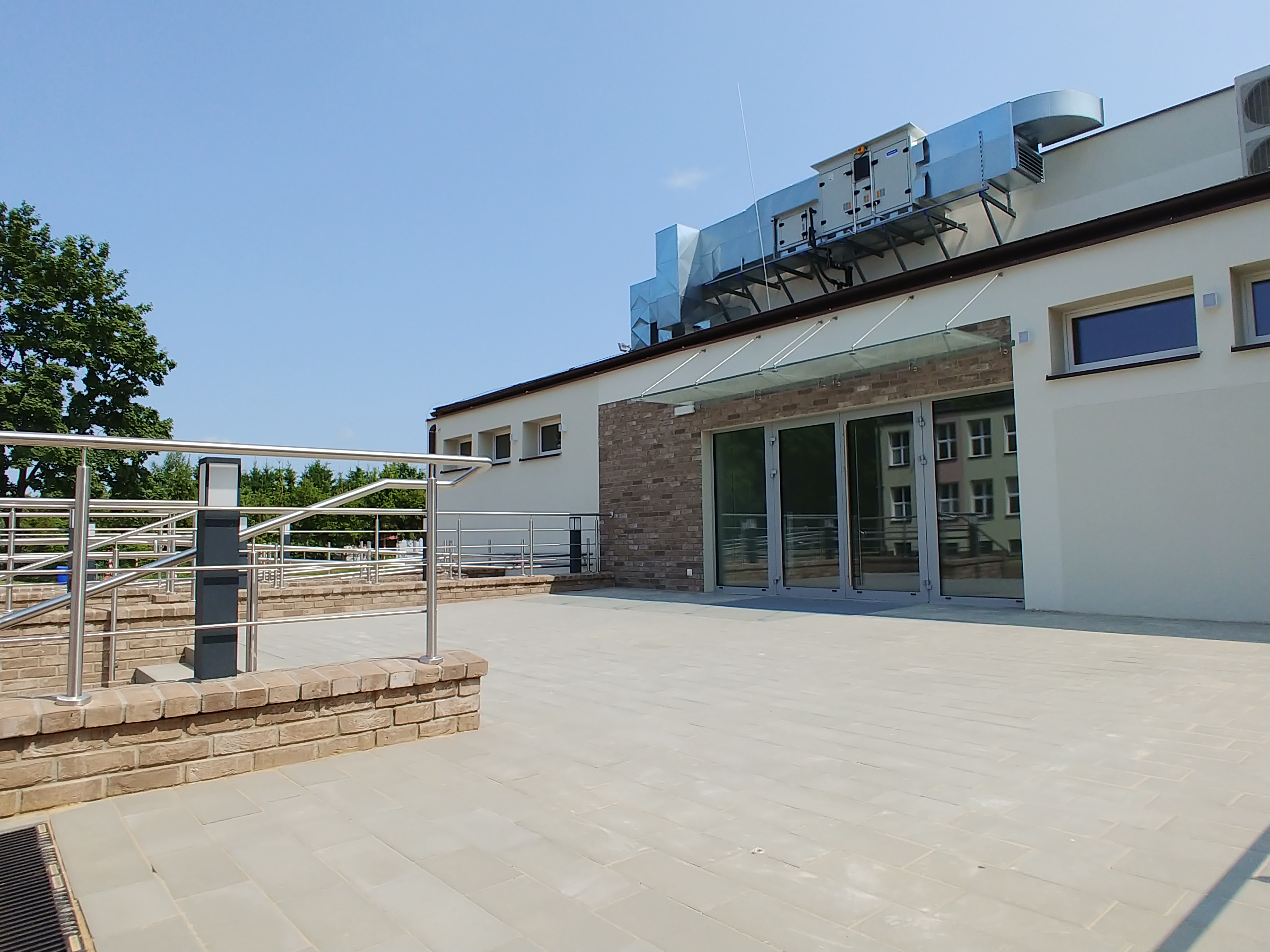 Ponadto przeprowadzone zmiany w budynku objęły dobudowę zewnętrznej klatki schodowej wraz z windą osobową oraz przebudowę części piętra korpusu głównego. Całość obiektu objętego przebudową została przystosowana do obsługi osób niepełnosprawnych, w tym poruszających się na wózkach inwalidzkich. W tym celu przy północnym wejściu wybudowano pochylnię z odpowiednim oporęczowaniem, umożliwiającą dojazd na poziom parteru. Zaprojektowano sanitariaty dla niepełnosprawnych, zapewniając im odpowiednią powierzchnię umożliwiającą swobodne manewrowanie wózkiem inwalidzkim i łatwy podjazd do urządzeń oraz specjalistyczne poręczowanie i aparaty sanitarne. Wygodne poruszanie się wózkami inwalidzkimi jest możliwe dzięki odpowiedniej szerokości dróg i przejść komunikacyjnych oraz szerokich przejść w drzwiach zewnętrznych i wewnętrznych.