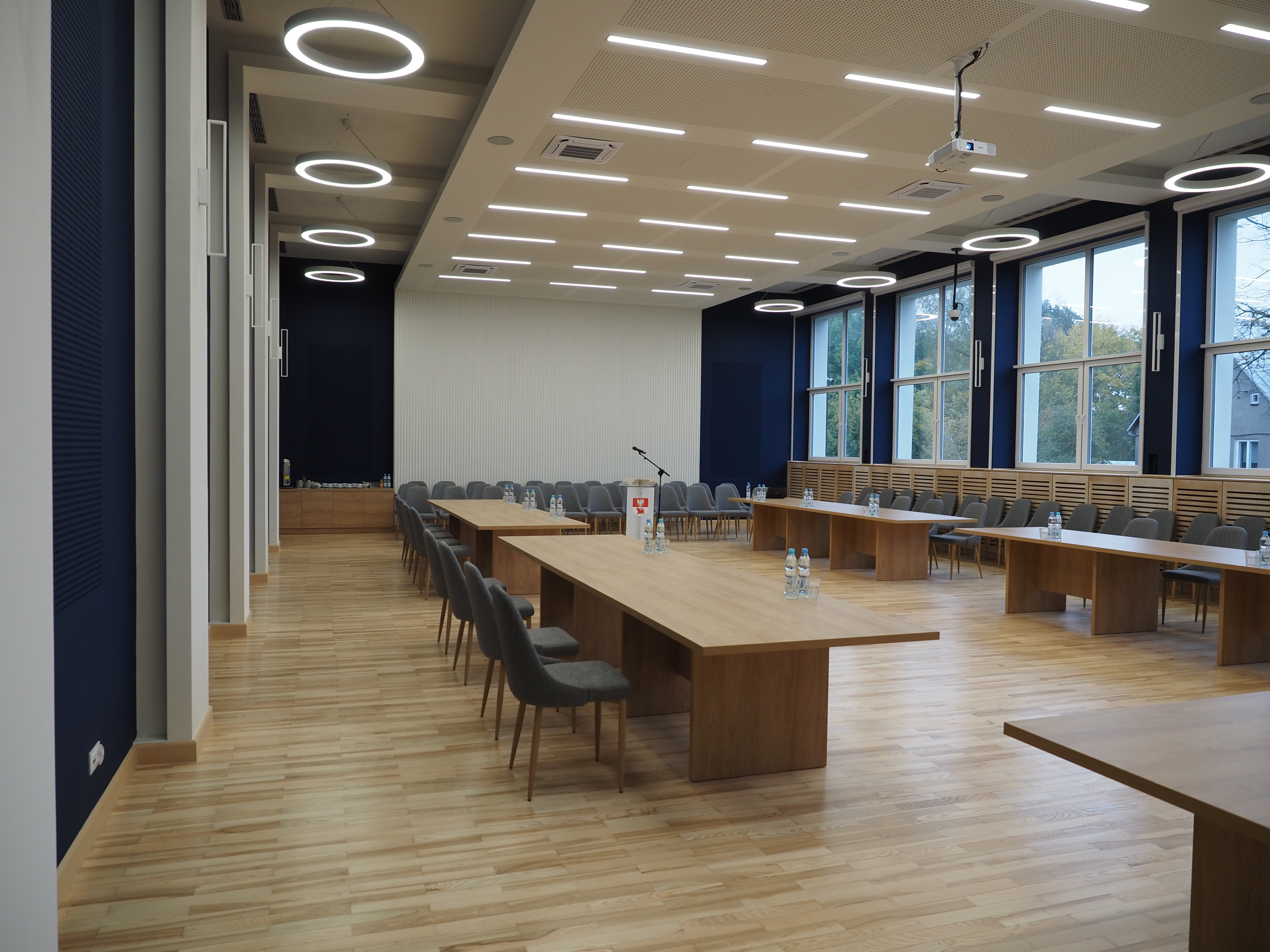W efekcie przeprowadzonych prac budowlanych powstała sala konferencyjna o powierzchni ok. 170 m2, która przeznaczona została do prowadzenia obrad rady powiatu, zebrań czy organizowania imprez kulturalnych. Jest ona pomieszczeniem mieszczącym powyżej 50 osób, ale możliwe jest maksymalne jednoczesne przebywanie w niej nawet 170 osób. W celu obsługi powstało obszerne zaplecze, w skład którego wchodzą: pomieszczenie socjalne, korytarze i hol, toalety (w tym dla osób niepełnosprawnych) i szatnia. Całość ma powierzchnię 274 m2.
