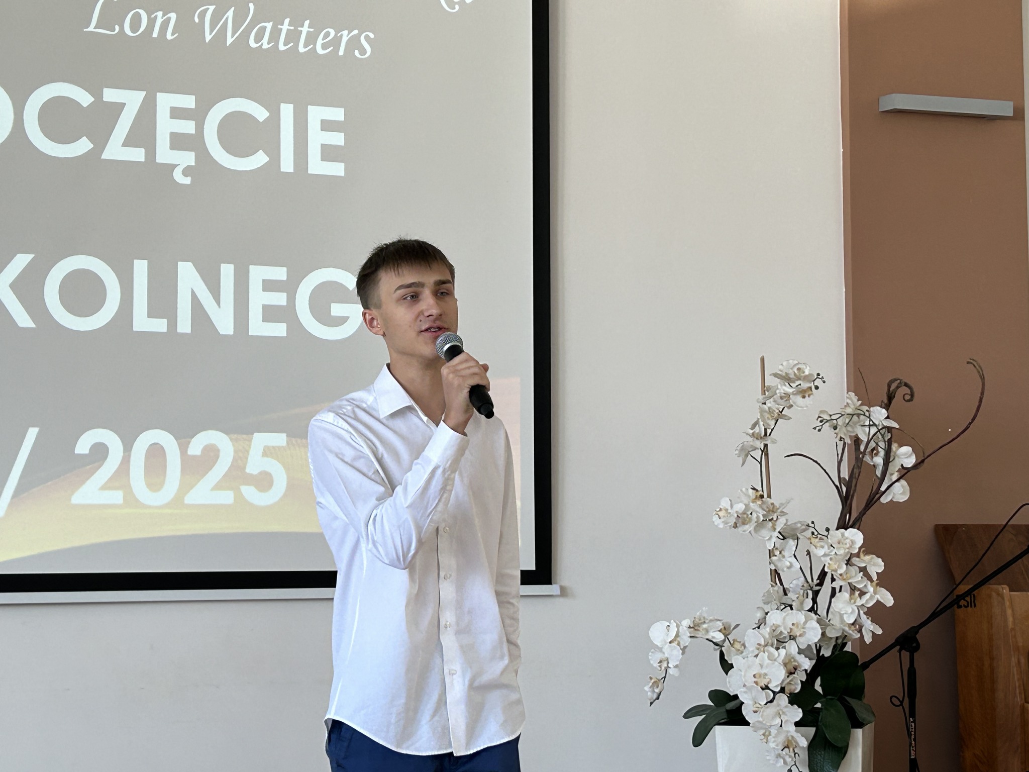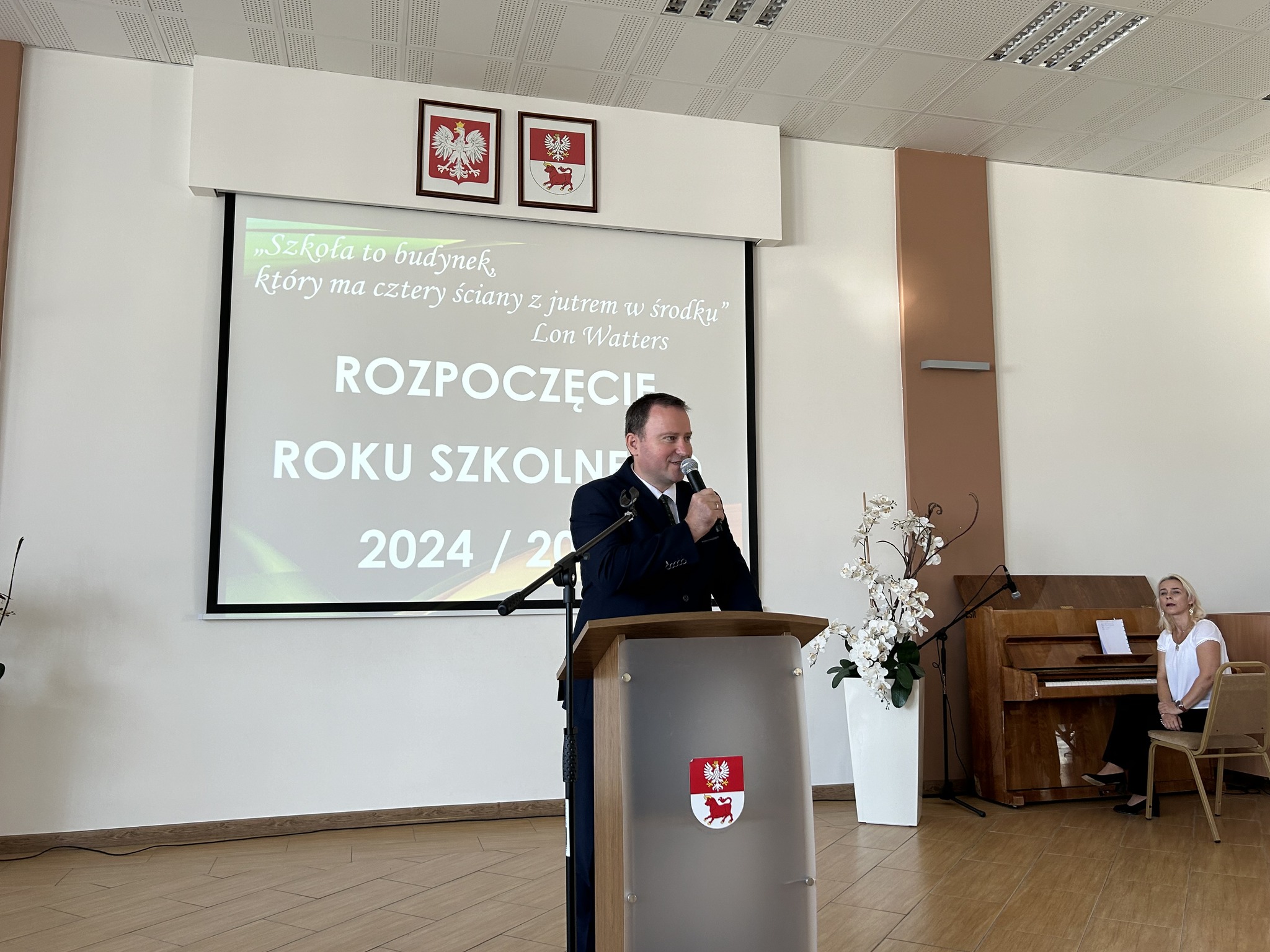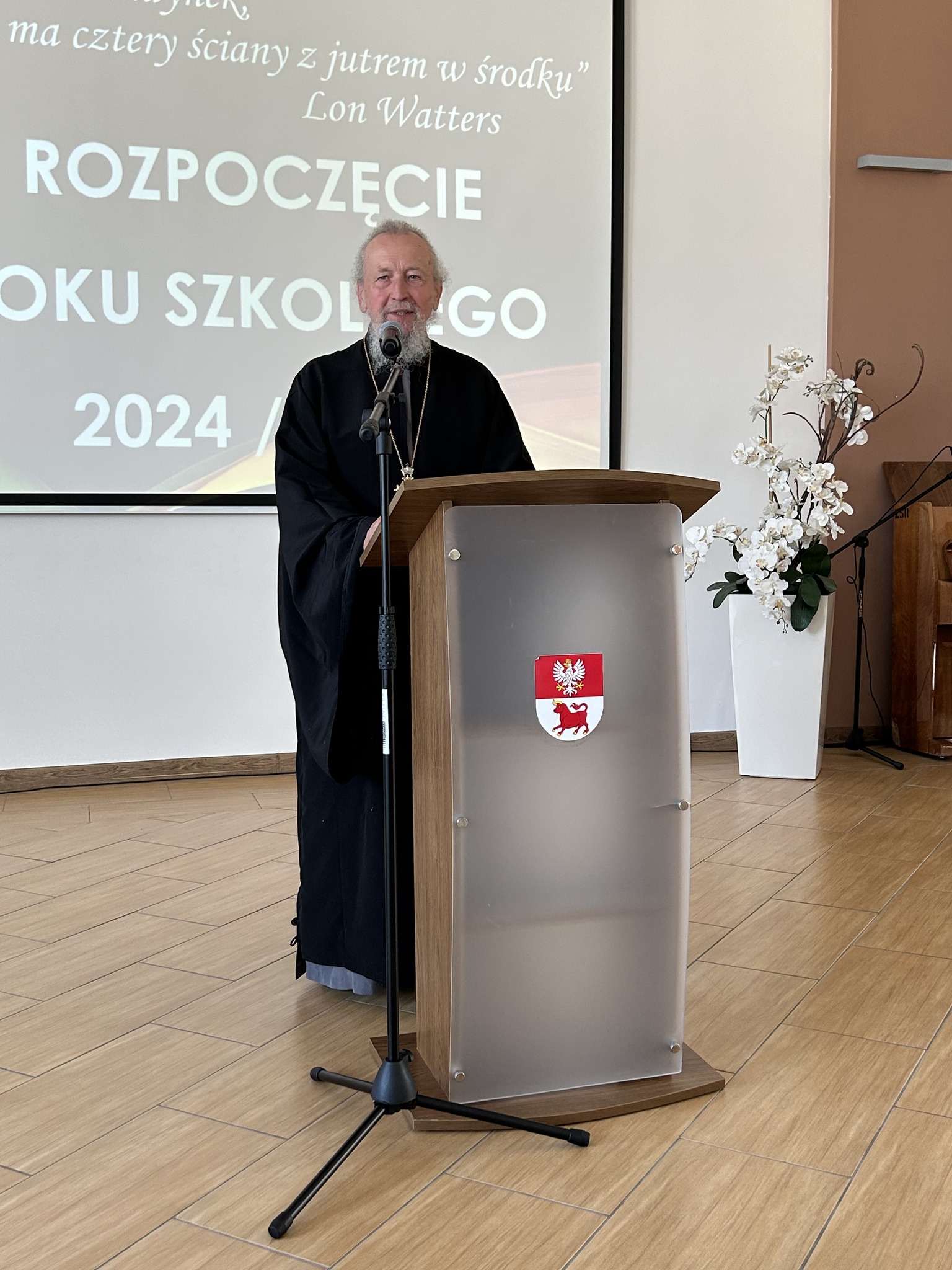W uroczysty nastrój tego dnia wprowadził wszystkich zebranych występ Maćka Gabrysiaka. Następnie zabrał głos dyrektor Bolesław Hryniewicki. Szczególnie serdecznie przywitał przybyłych na tę uroczystość gości: pana Piotra Bożko – wicestarostę bielskiego, księdza dziekana Leoncjusza Tofiluka i majora Jakuba Troskę. Ciepłe słowa powitania skierował do uczniów klas pierwszych zaczynających naukę w naszej szkole. Dyrektor mówił o czekających zadaniach na nowy rok szkolny. Zwrócił uwagę, że oprócz zdobywania wiedzy i umiejętności ważne są też kompetencje społeczne. Zachęcił uczniów do aktywnego działania nie tylko na lekcjach, ale też na rzecz szkoły i środowiska. Powiedział o ważnej roli organu prowadzącego w realizowaniu zadań szkoły. Dzięki wsparciu był możliwy gruntowny remont i przebudowa internatu oraz w przyszłości budowa hali sportowej. Na koniec złożył życzenia nauczycielom i uczniom, by zrealizowali zamierzone cele i odnieśli sukcesy.