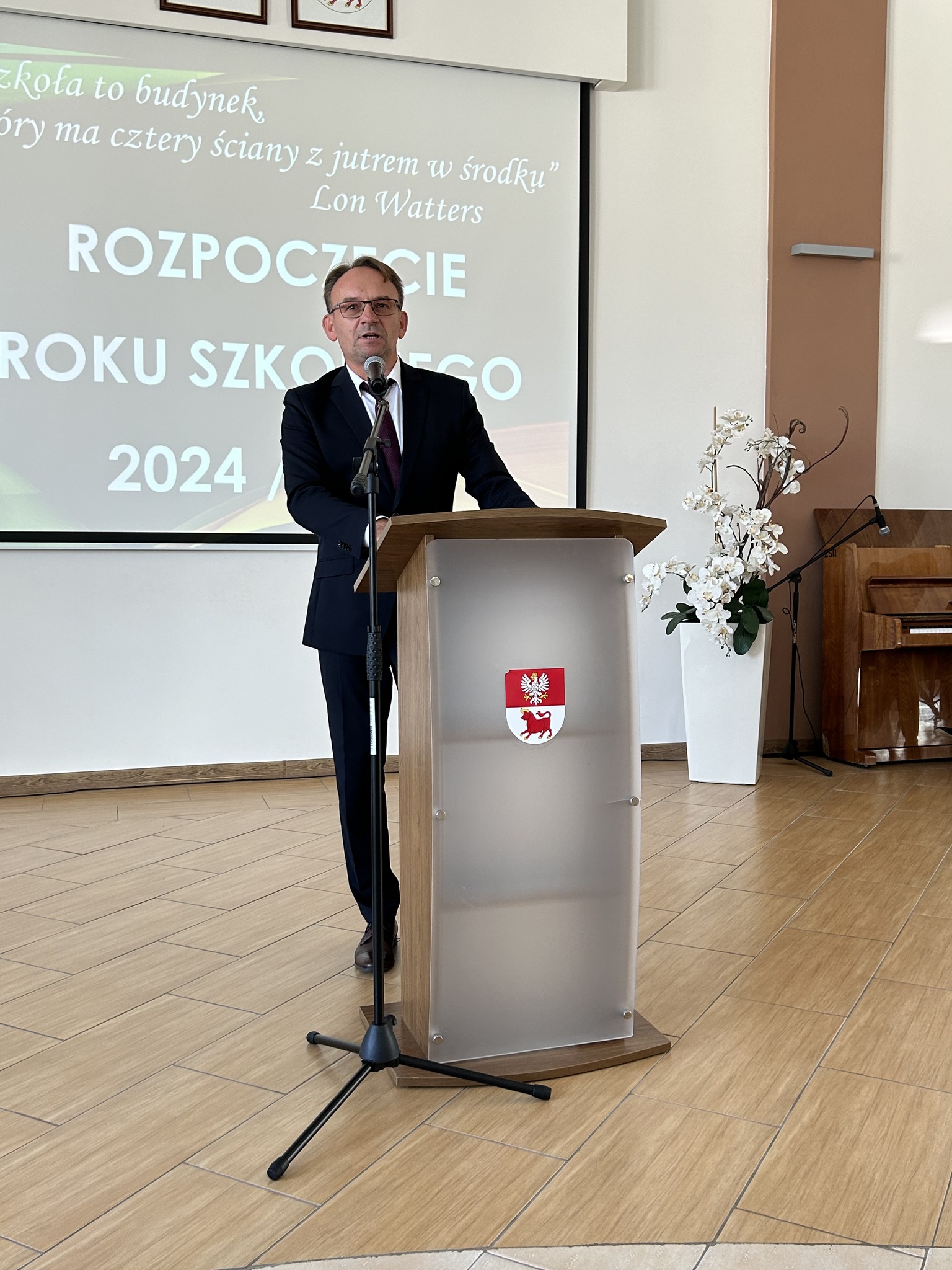 Następnie głos zabrał wicestarosta bielski pan Piotr Bożko. W swoim wystąpieniu nawiązał do widniejącego hasła „Szkoła to budynek, który ma cztery ściany z jutrem w środku”. Powiedział, że wypełniają go ludzie, którzy tworzą ciągłość pokoleń. Trzeba go też wypełnić pracą, by zadbać o swoją przyszłość. Na zakończenie złożył życzenia na nadchodzący rok szkolny.