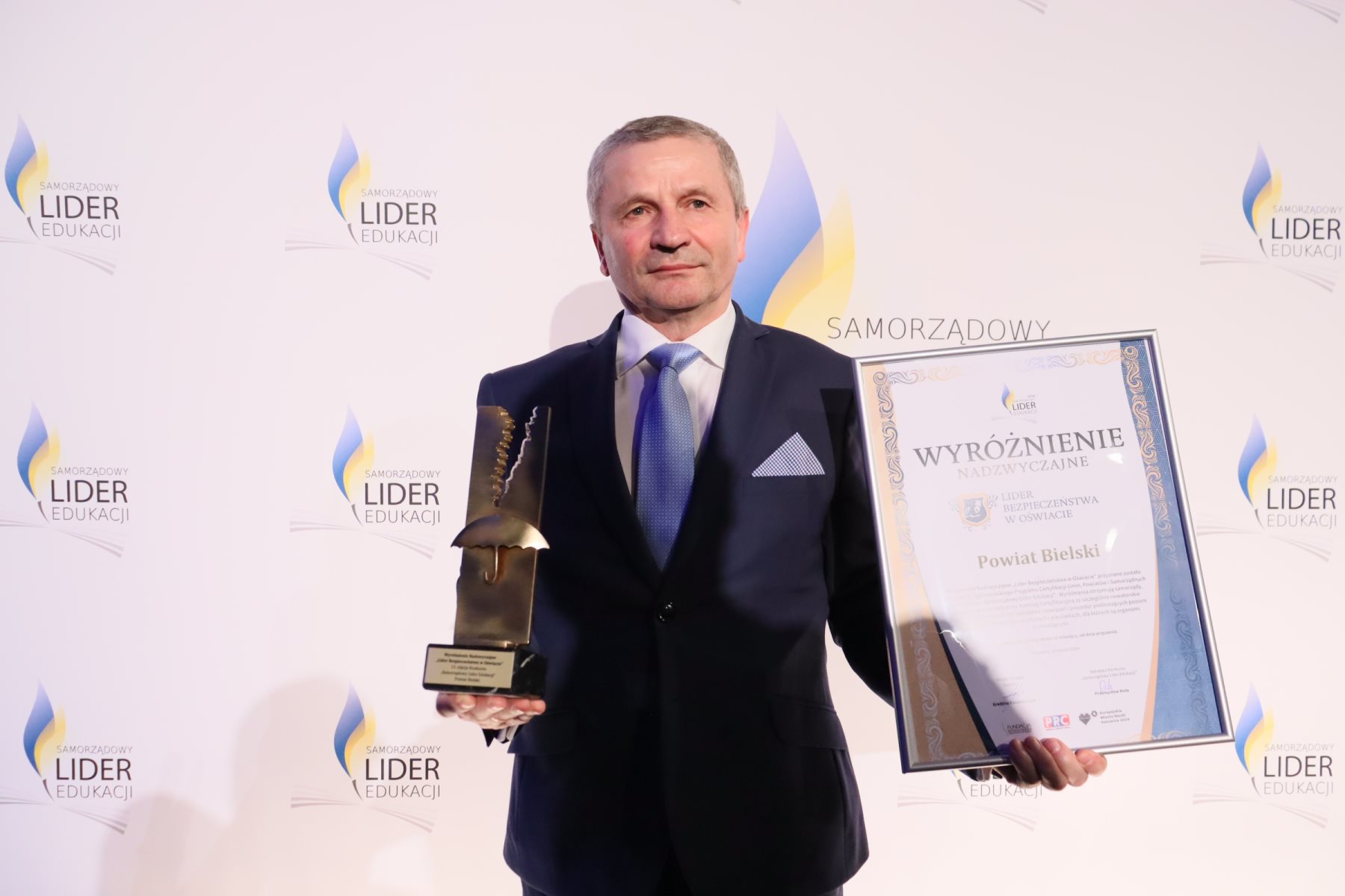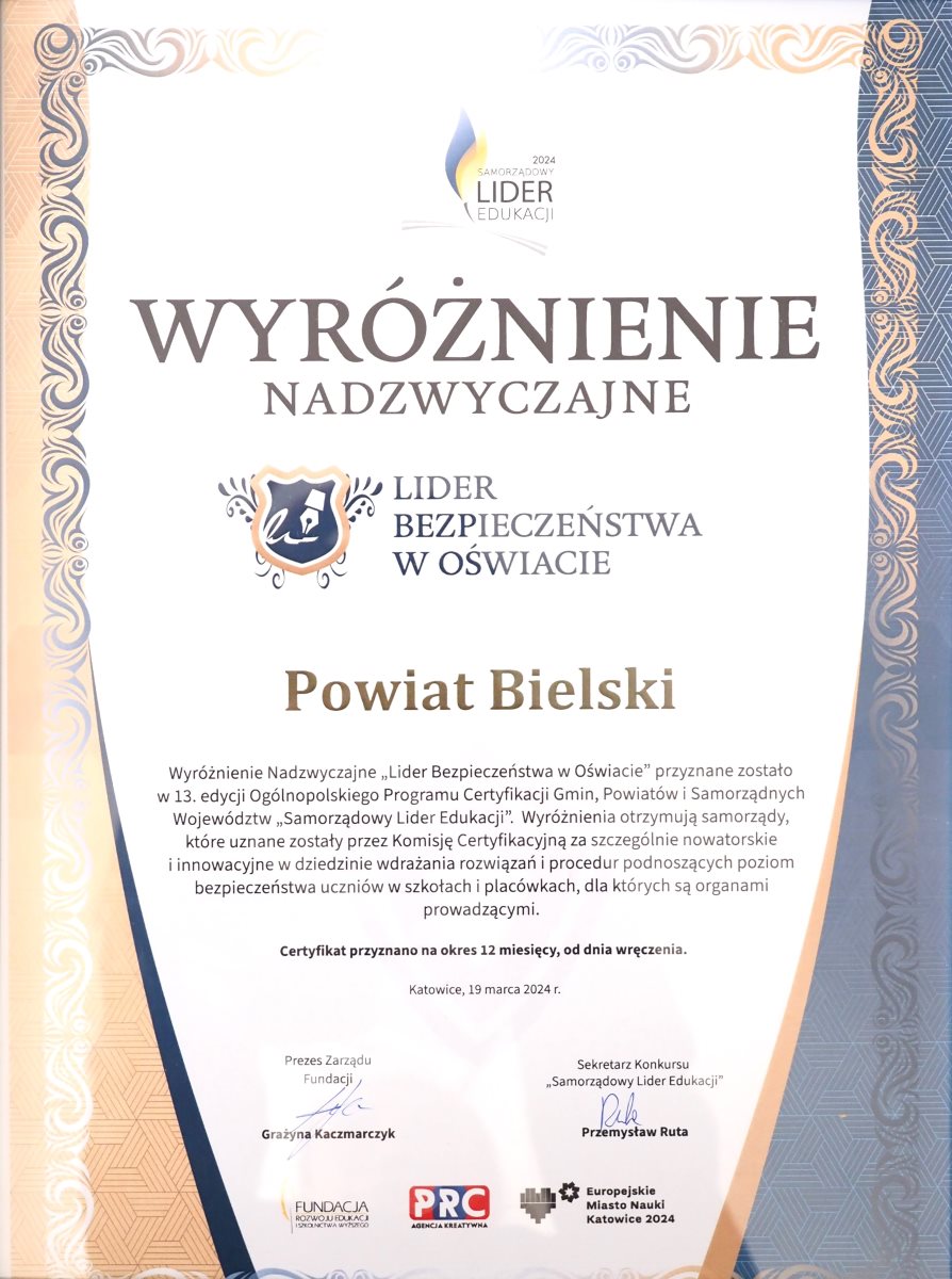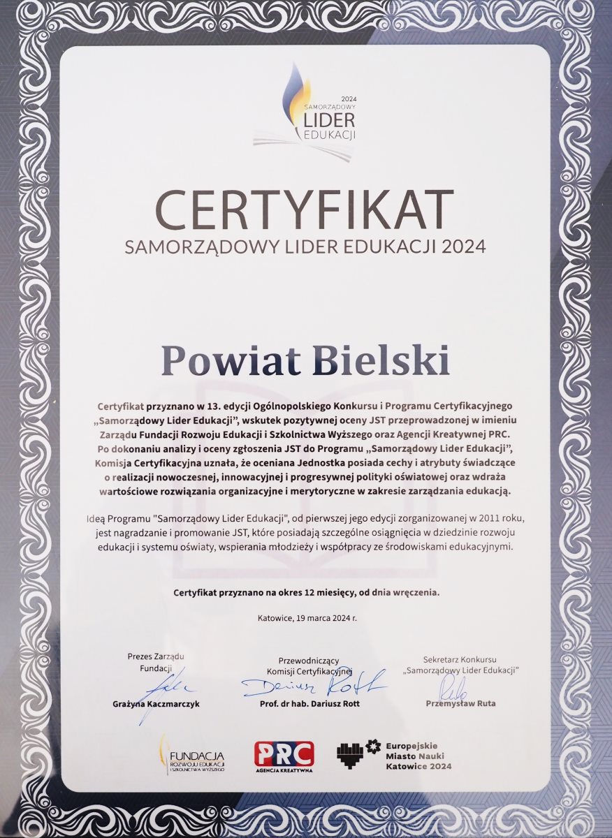 Powiat Bielski uzyskał 89 punktów na 100 możliwych w skali oceny, przyznanych przez Komisję Certyfikującą. To pozwoliło mu otrzymać certyfikat „Samorządowy Lider Edukacji 2024”. Dodatkowo wysoka liczba zdobytych punktów zaowocowała wyróżnieniem powiatu jako „Lidera bezpieczeństwa w oświacie”. Certyfikaty oraz statuetkę w imieniu starosty bielskiego odebrał naczelnik Wydziału Oświaty, Kultury i Ochrony Zdrowia Anatol Grzegorz Tymiński.