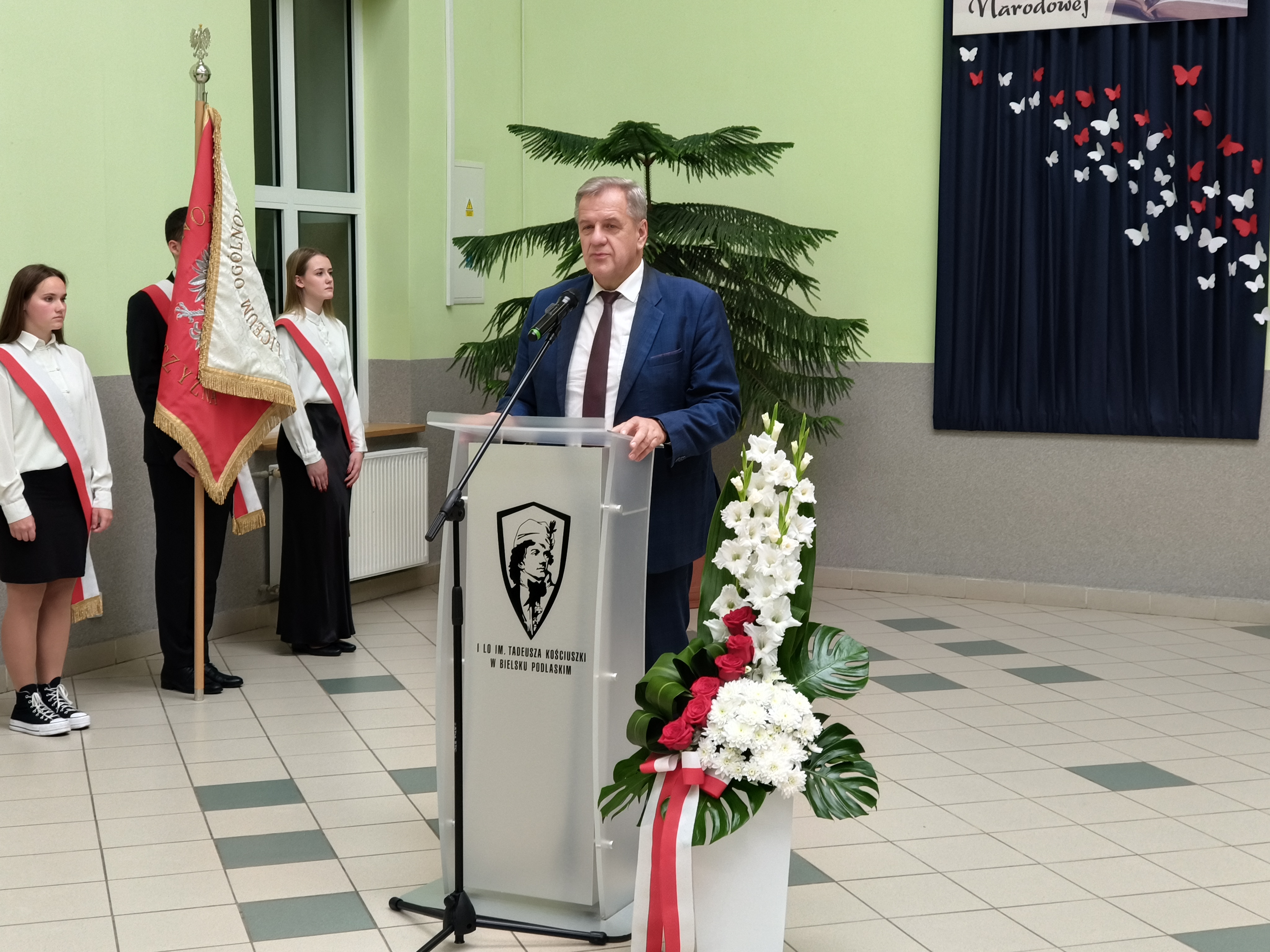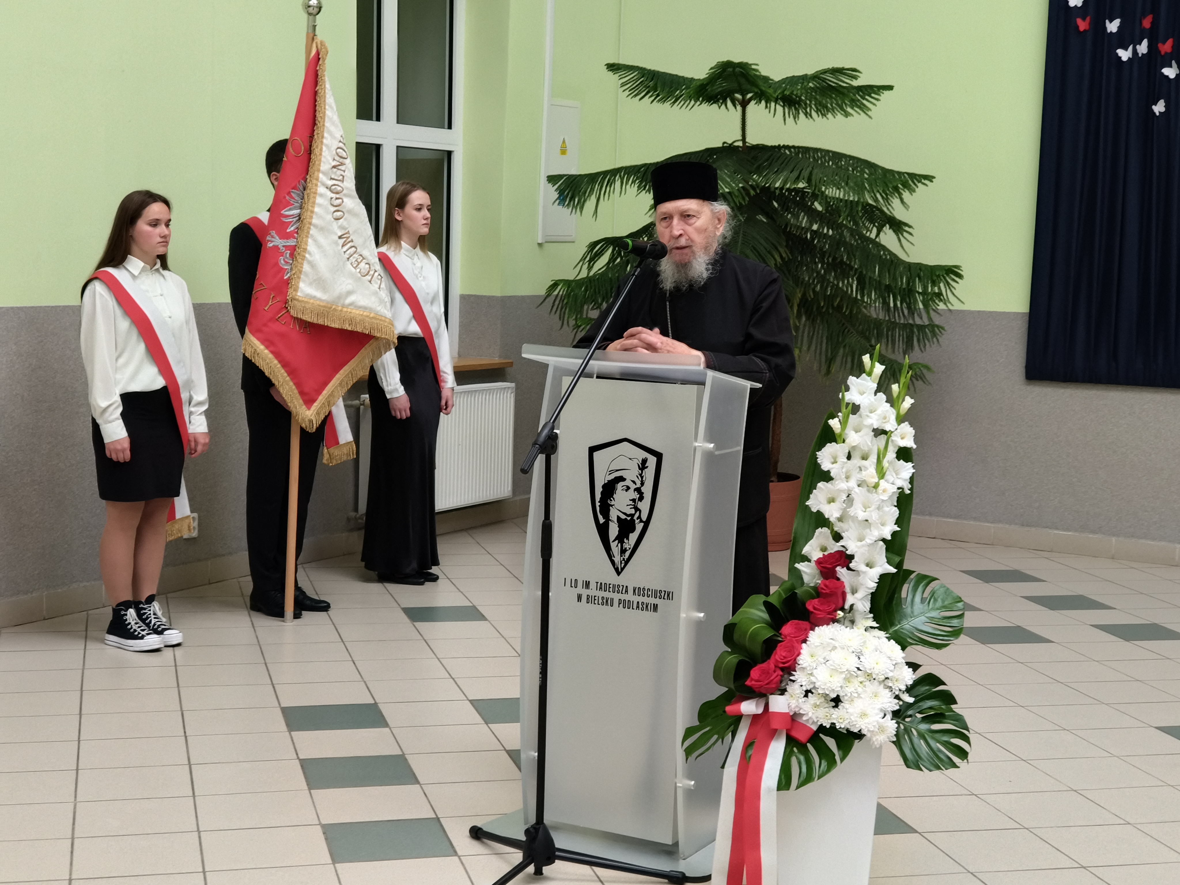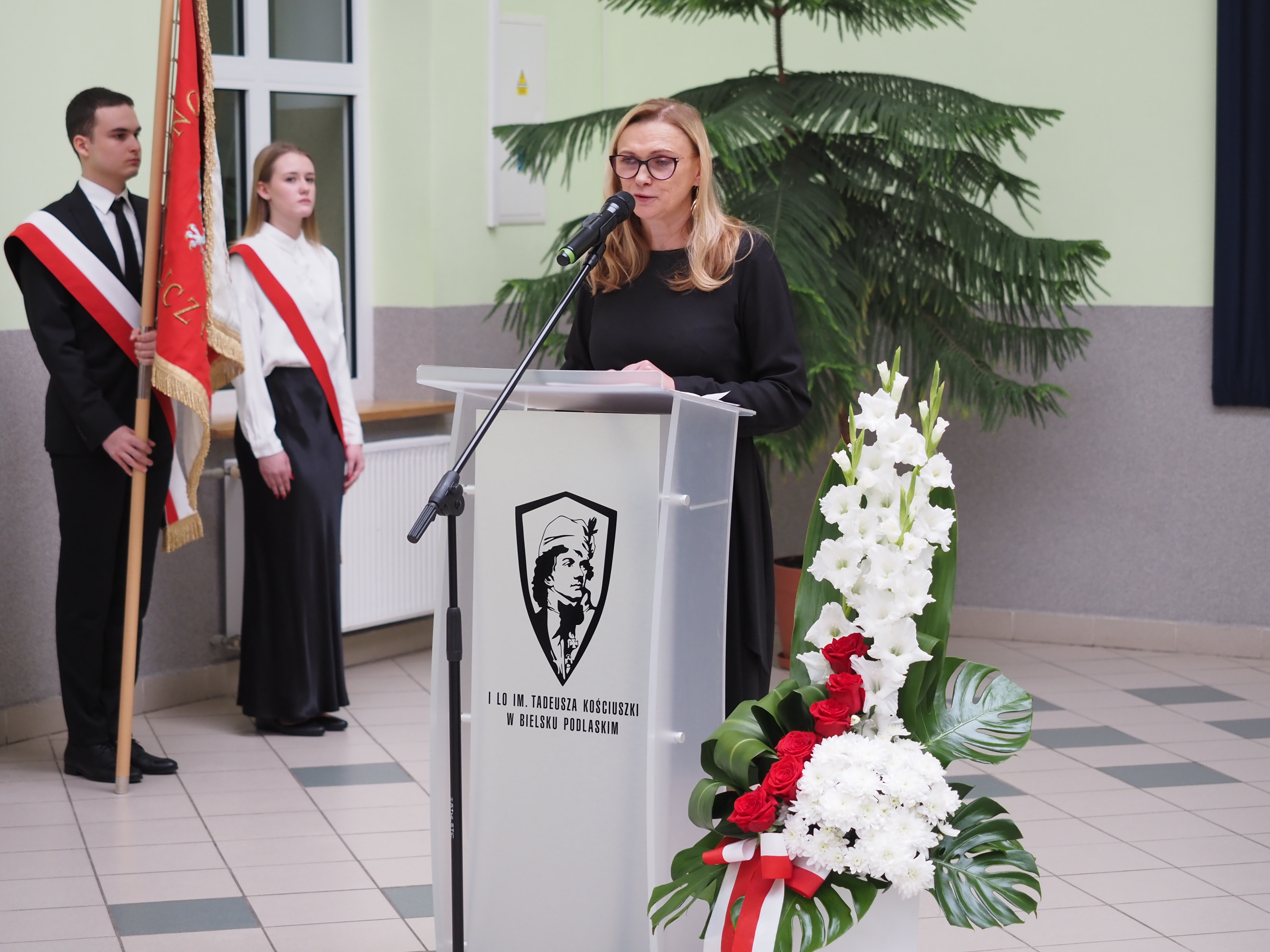 Zgromadzonych uczestników uroczystości powitała dyrektor I Liceum Ogólnokształcącego Marzena Pogorzelska-Ciołek. Wśród licznych gości wymieniła m.in. przedstawicieli władz Powiatu Bielskiego: starostę Sławomira Jerzego Snarskiego, przewodniczącego rady powiatu Andrzeja Leszczyńskiego, wicestarostę Piotra Bożko, członka zarządu powiatu Macieja Bobla, sekretarza powiatu Marka Martyniuka, skarbnika powiatu Ninę Tymińską. Powitanie poprzedziło uroczyste wprowadzenie sztandaru szkoły oraz odśpiewanie hymnu narodowego pod prowadzącym głosem jednej z uczennic I LO.