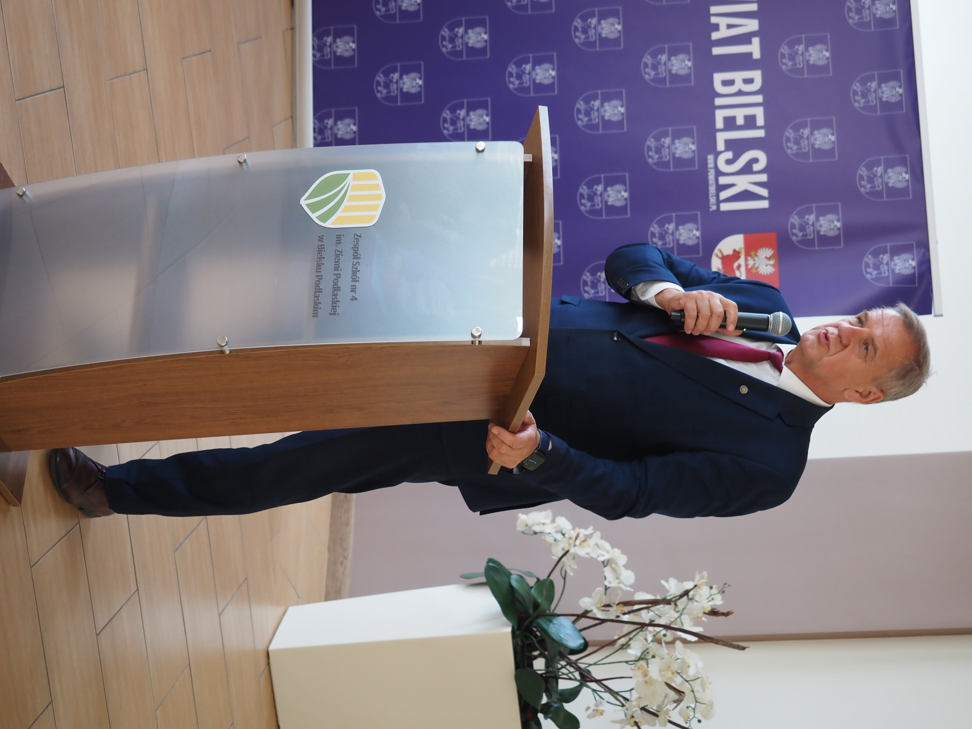 Starosta Sławomir Jerzy Snarski w swoim wystąpieniu życzył uczniom zapału do nauki i satysfakcji z podejmowanych działań, podkreślając jednocześnie rolę szkoły w kształceniu młodzieży oraz jej wkład w rozwój powiatu bielskiego. – Szkoła jest poznawaniem świata, poznawaniem siebie – zwrócił się starosta do uczniów. – Człowiek musi się napełnić treścią, w różnym stopniu zależną od naszych zainteresowań, wypełnić nią nasze życie, nasze umysły – tym, co pozwoli uczynić was lepszymi ludźmi, rozumiejącymi świat. Żebyście poznawali siebie i innych ludzi, posiedli umiejętności i dali sobie szanse w świecie na rozwój, na szczęście, na spełnianie się w interesującym was zakresie. Warto ten wysiłek wykonać.