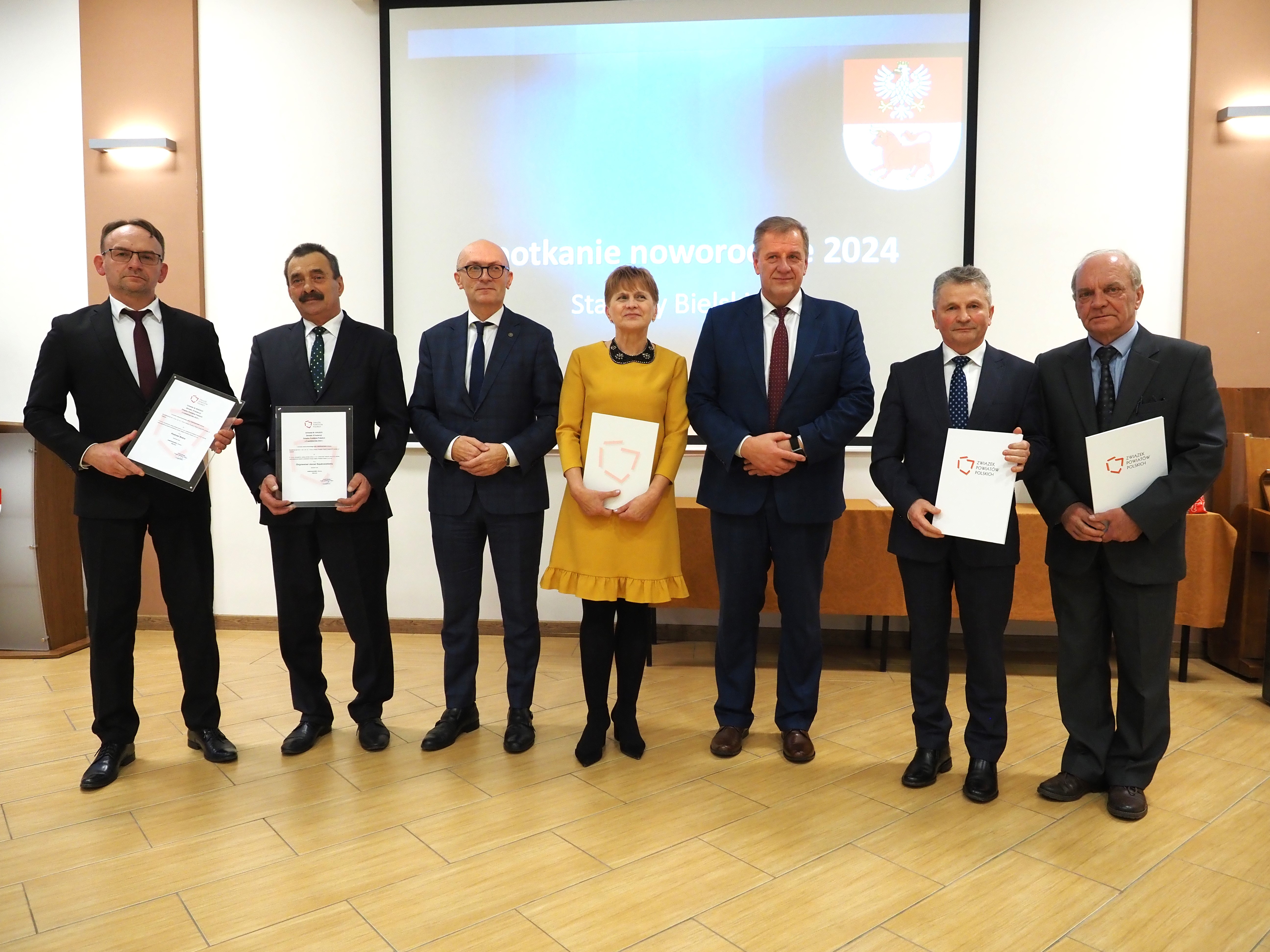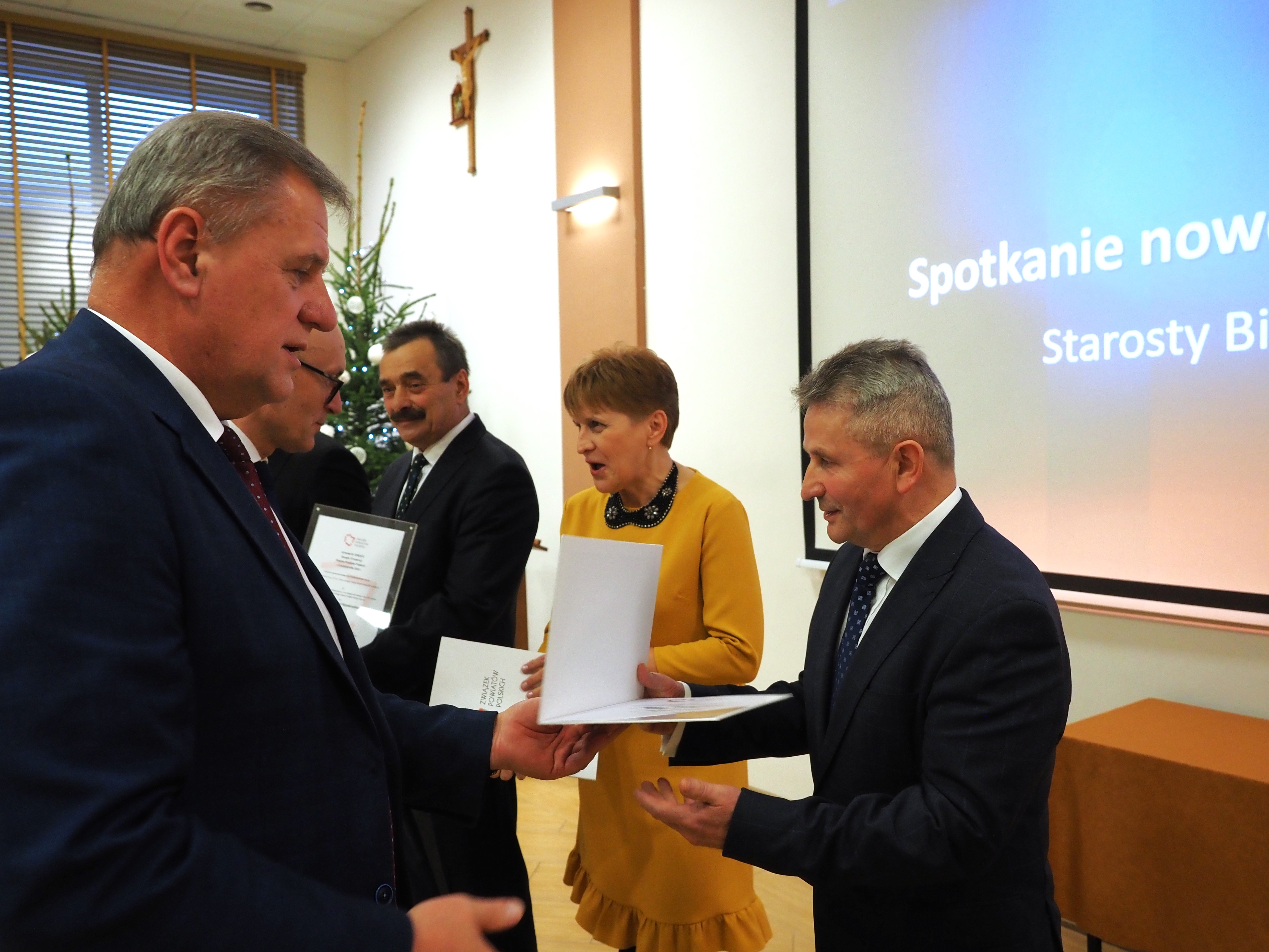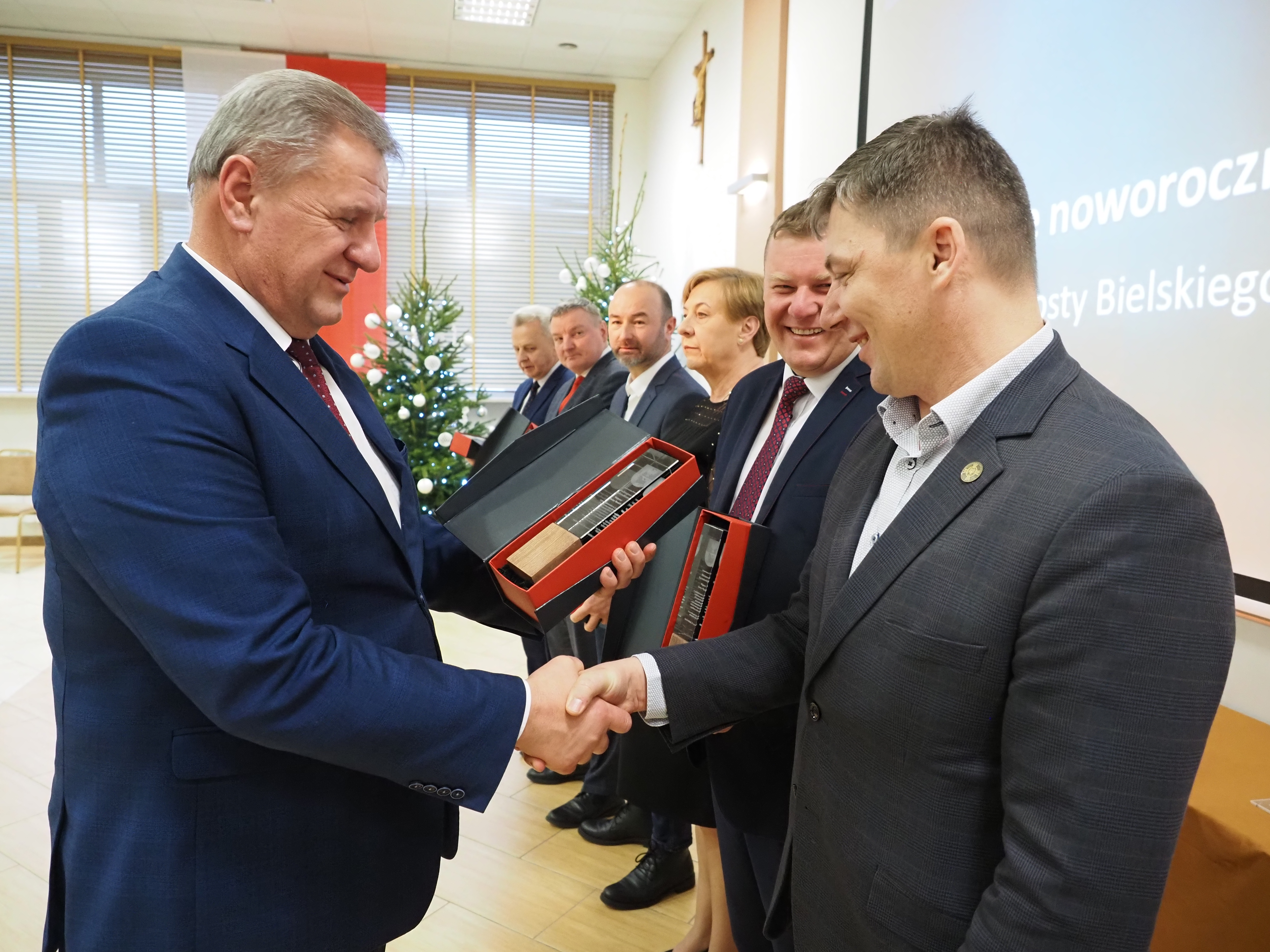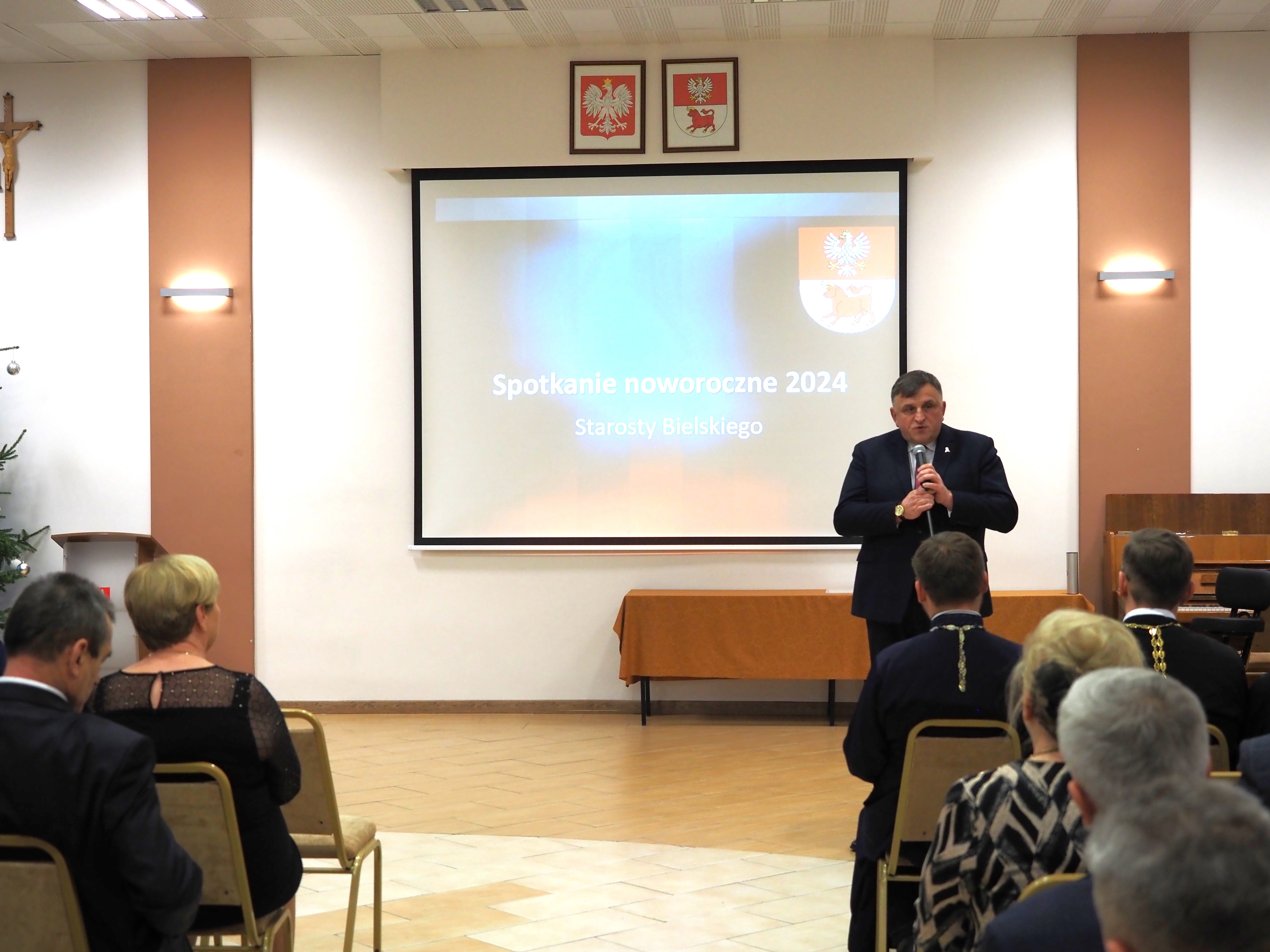 w zakresie edukacji, utrzymania i budowy dróg powiatowych, rynku pracy, ochrony zdrowia, pomocy społecznej, bezpieczeństwa publicznego oraz administracji powiatowej. Ważnym wątkiem przewijającym się w jego przemówieniu było znaczenie wspólnoty powiatowej oraz rola, jaką pełnią osoby i instytucje zewnętrzne, dzięki którym wspólnota ta może realizować zadania, zabezpieczać swoje potrzeby oraz stale się rozwijać. To właśnie do tych, którzy wspierają Powiat Bielski i pracowników samorządowych, starosta skierował podziękowania i wyrazy wdzięczności. Jak podczas każdego spotkania noworocznego, kilka wybranych spośród tego grona osób zostało przez niego uhonorowanych pamiątkowymi statuetkami. Otrzymali je burmistrz Bielska Podlaskiego Jarosław Borowski, burmistrz Brańska Eugeniusz Koczewski oraz wójtowie gmin: Raisa Rajecka (gmina Bielsk Podlaski), Mariusz Korzeniewski (gmina Wyszki), Andrzej Jankowski (gmina Brańsk). Ponadto wśród wyróżnionych znalazł się Jan Miniuk, właściciel Przedsiębiorstwa Drogowo-Mostowego „Maksbud”.