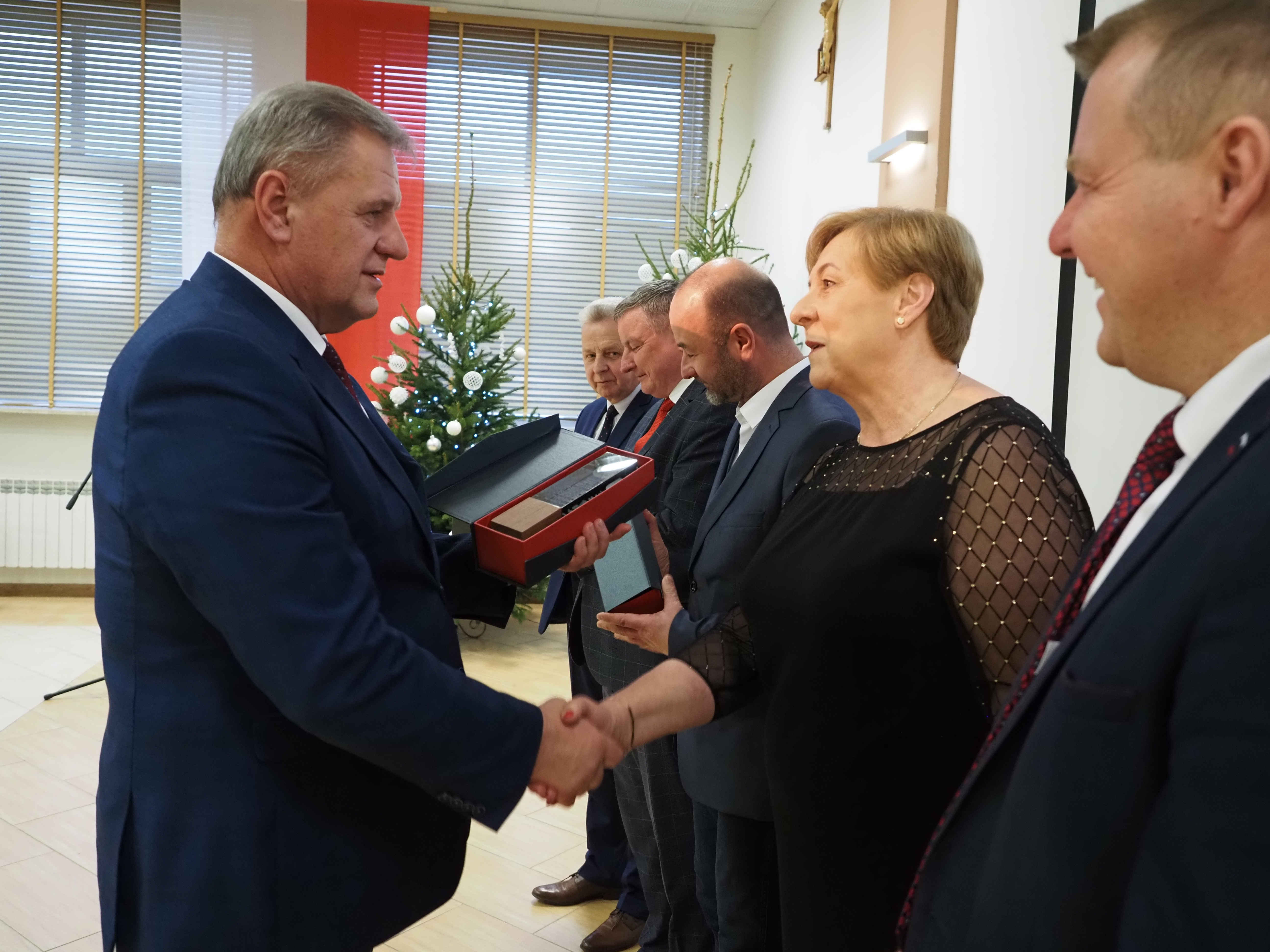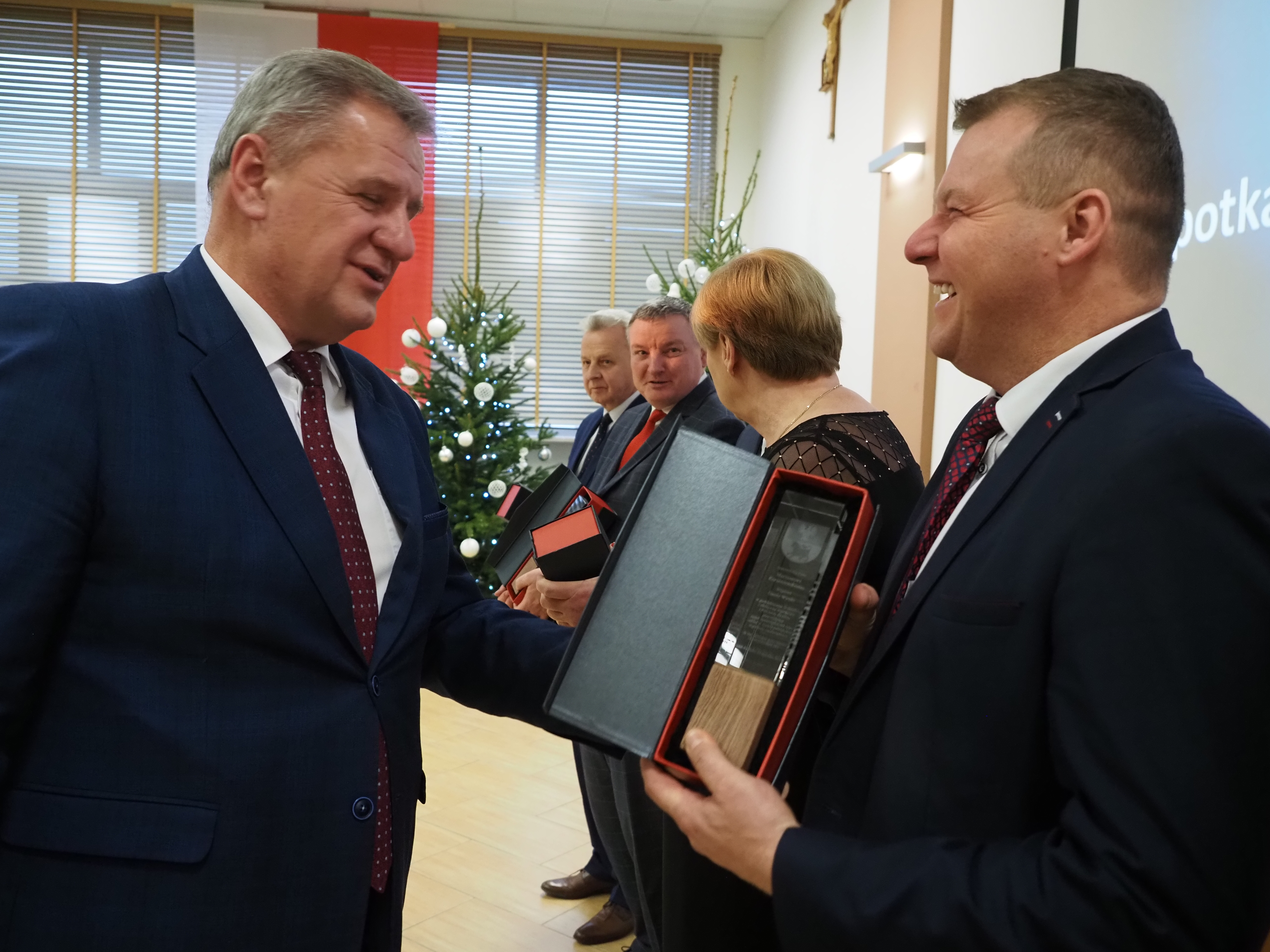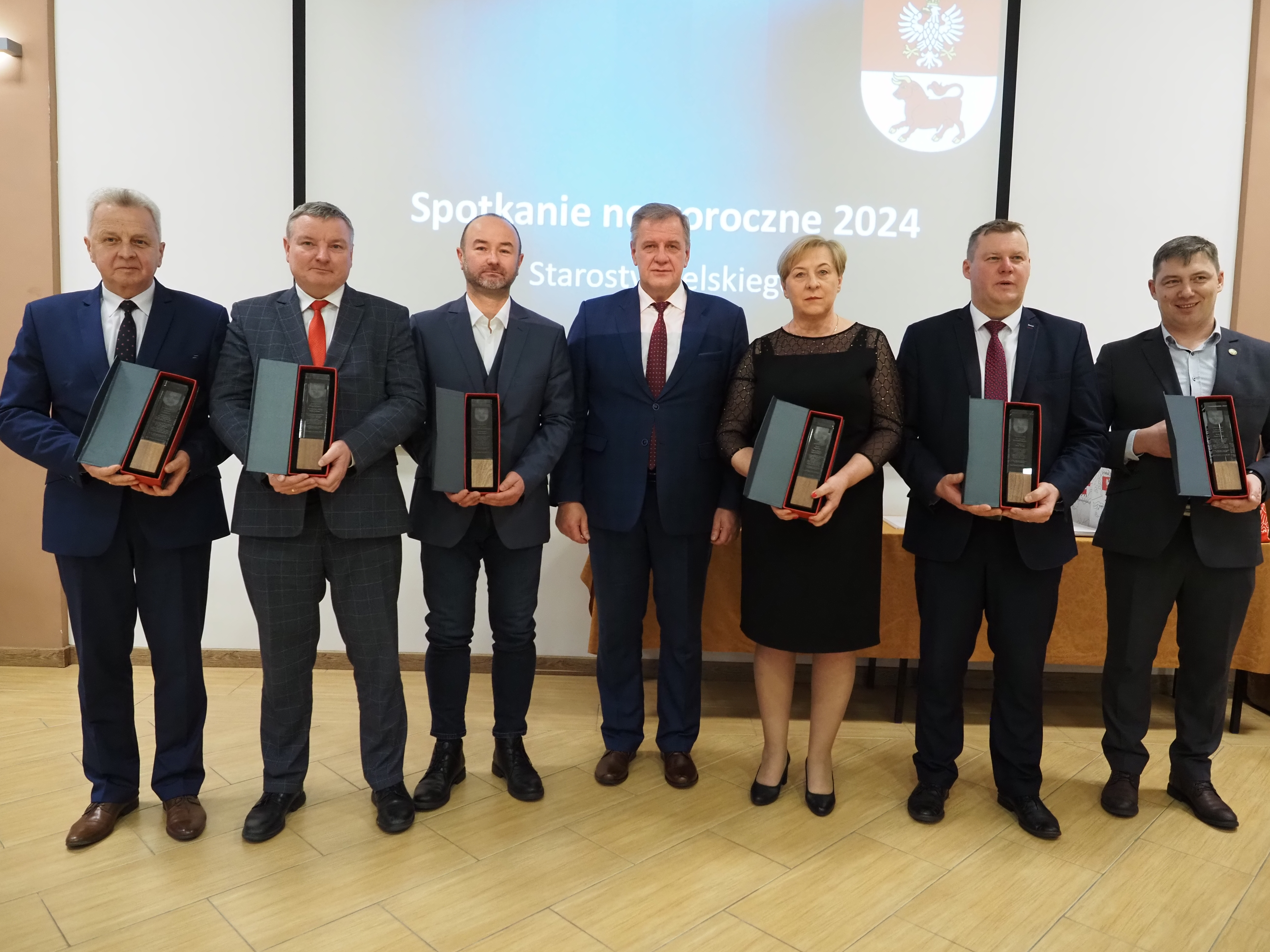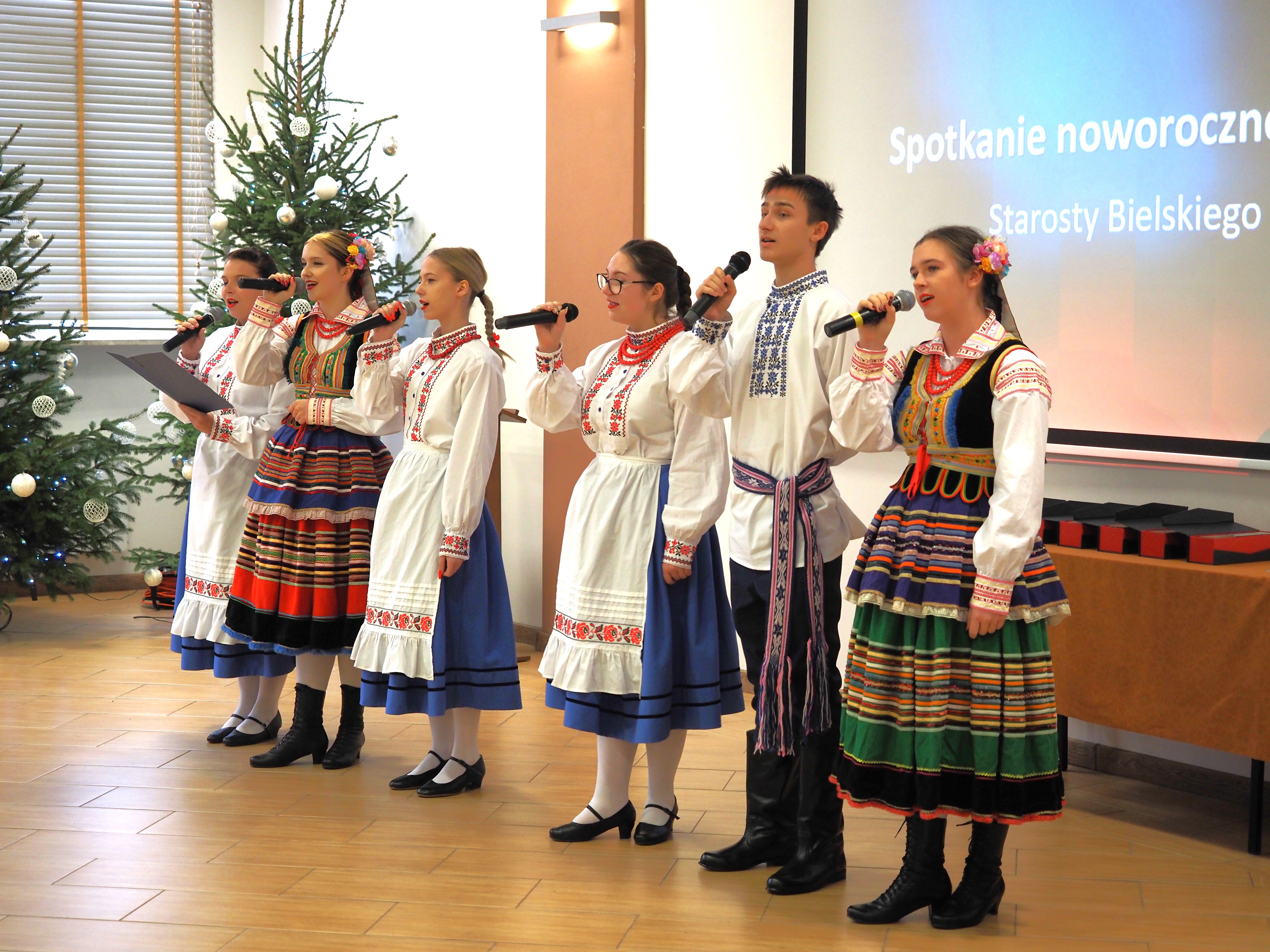w zakresie edukacji, utrzymania i budowy dróg powiatowych, rynku pracy, ochrony zdrowia, pomocy społecznej, bezpieczeństwa publicznego oraz administracji powiatowej. Ważnym wątkiem przewijającym się w jego przemówieniu było znaczenie wspólnoty powiatowej oraz rola, jaką pełnią osoby i instytucje zewnętrzne, dzięki którym wspólnota ta może realizować zadania, zabezpieczać swoje potrzeby oraz stale się rozwijać. To właśnie do tych, którzy wspierają Powiat Bielski i pracowników samorządowych, starosta skierował podziękowania i wyrazy wdzięczności. Jak podczas każdego spotkania noworocznego, kilka wybranych spośród tego grona osób zostało przez niego uhonorowanych pamiątkowymi statuetkami. Otrzymali je burmistrz Bielska Podlaskiego Jarosław Borowski, burmistrz Brańska Eugeniusz Koczewski oraz wójtowie gmin: Raisa Rajecka (gmina Bielsk Podlaski), Mariusz Korzeniewski (gmina Wyszki), Andrzej Jankowski (gmina Brańsk). Ponadto wśród wyróżnionych znalazł się Jan Miniuk, właściciel Przedsiębiorstwa Drogowo-Mostowego „Maksbud”.