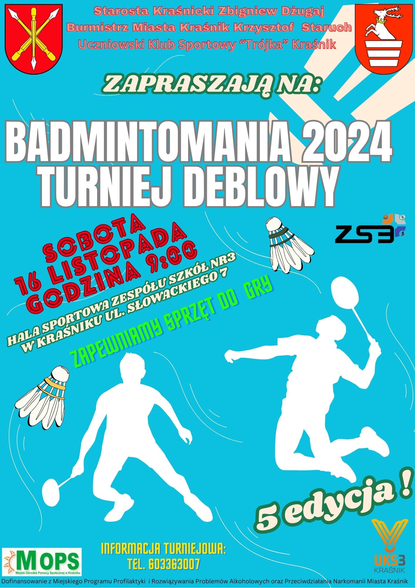Plakat turnieju. Od góry zawiera następującą treść: Starosta Kraśnicki Zbigniew Dżugaj, Burmistrz Miasta Kraśnik Krzysztof Staruch, Uczniowski Klub Sportowy "Trójka" Kraśnik zapraszają na: Badmintomania 2024 Turniej Deblowy, sobota 16 listopada godzina 9:00, hala sportowa Zespołu Szkół nr 3 w Kraśniku, ul. Słowackiego 7, zapewniamy sprzęt do gry, 5 edycja, informacja turniejowa: tel. 603363007.