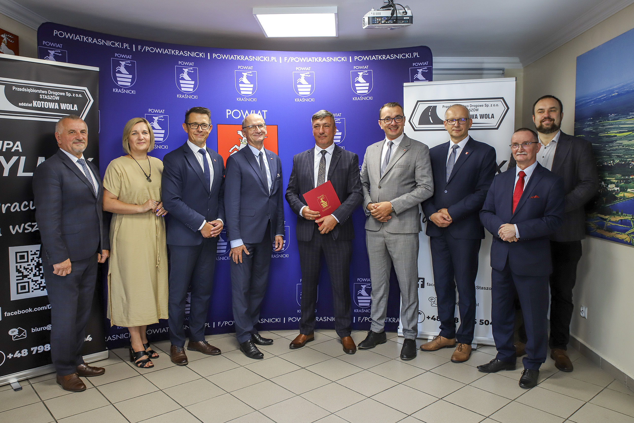 Przedstawiciele samorządu powiatowego podpisali umowę z Wykonawcą ostatniej w ramach Rządowego Funduszu Inwestycji strategicznych POLSKI ŁAD inwestycji drogowej pod nazwą "Poprawa infrastruktury drogowej w powiecie kraśnickim". W ramach tego zadania będą realizowane przebudowy dróg w trzech gminach: Trzydnik Duży, Gościeradów i Szastarka. Warto tu wskazać, iż dofinansowanie tej inwestycji sięgnęło 95%.