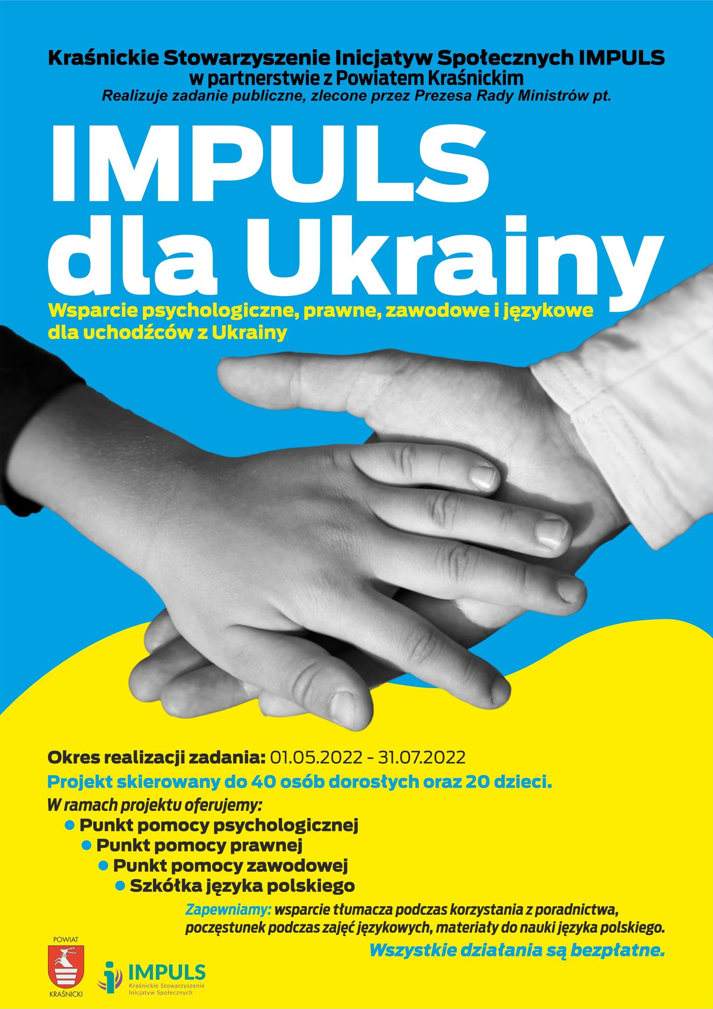 Kraśnickie Stowarzyszenie Inicjatyw Społecznych IMPULS w partnerstwie z powiatem kraśnickim realizuje w okresie od 1 maja do 31 lipca 2022 roku zadanie publiczne pt. „IMPULS dla Ukrainy”. Projekt jest skierowany do 40 osób dorosłych oraz 20 dzieci. Uchodźcy z Ukrainy mogą bezpłatnie skorzystać ze wsparcia psychologicznego, prawnego, zawodowego i językowego. Organizatorzy zapewniają wsparcie tłumacza podczas korzystania z poradnictwa, poczęstunek podczas zajęć językowych, a także materiały do nauki języka polskiego.