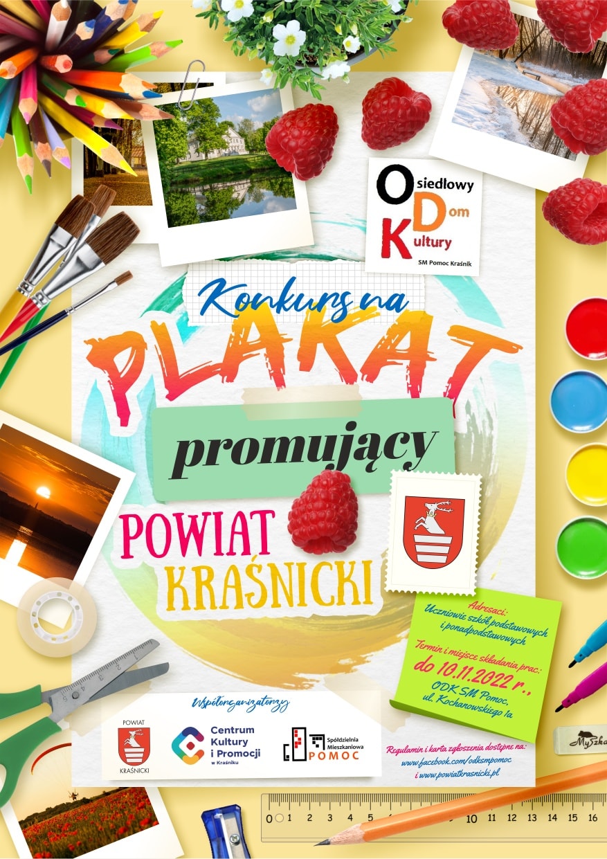Osiedlowy Dom Kultury i Spółdzielnia Mieszkaniowa Pomoc we współpracy ze Starostwem Powiatowym w Kraśniku oraz kraśnickim Centrum Kultury i Promocji zapraszają do udziału w konkursie na „Plakat Promujący Powiat Kraśnicki”. Liczymy na kreatywność i wyobraźnię plastyczną.