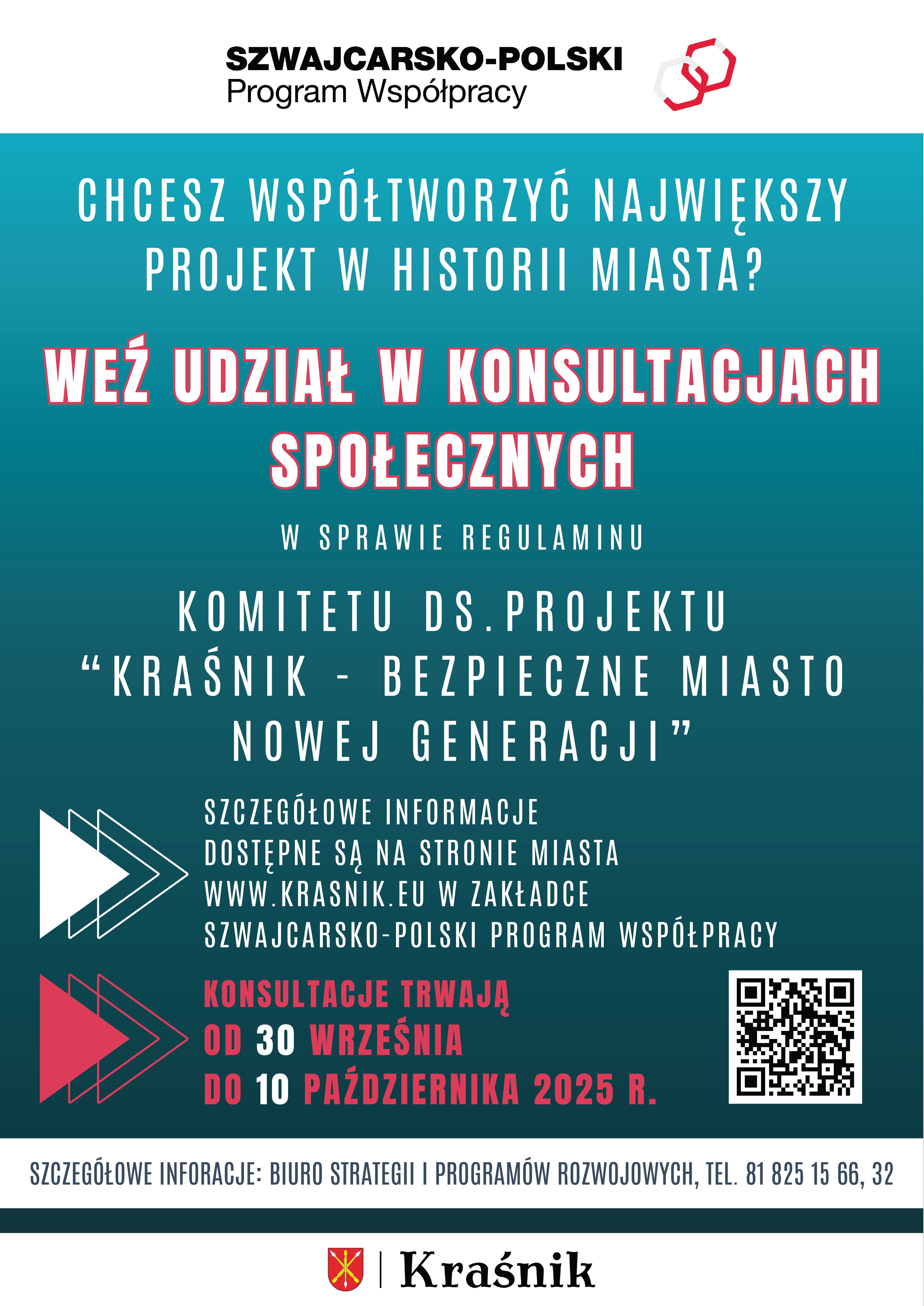 Chcesz współtworzyć największy projekt w historii Kraśnika? Zapraszamy do udziału w konsultacjach społecznych dotyczących regulaminu Komitetu ds. Projektu „Kraśnik – Bezpieczne Miasto Nowej Generacji”, realizowanego w ramach Szwajcarsko-Polskiego Programu Współpracy.