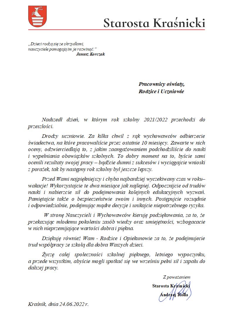 W stronę Nauczycieli i Wychowawców kieruję podziękowania, za to, że przekazując młodemu pokoleniu zasób wiedzy oraz umiejętności, wzbogacacie w nich nieprzemijające wartości dobra i piękna.