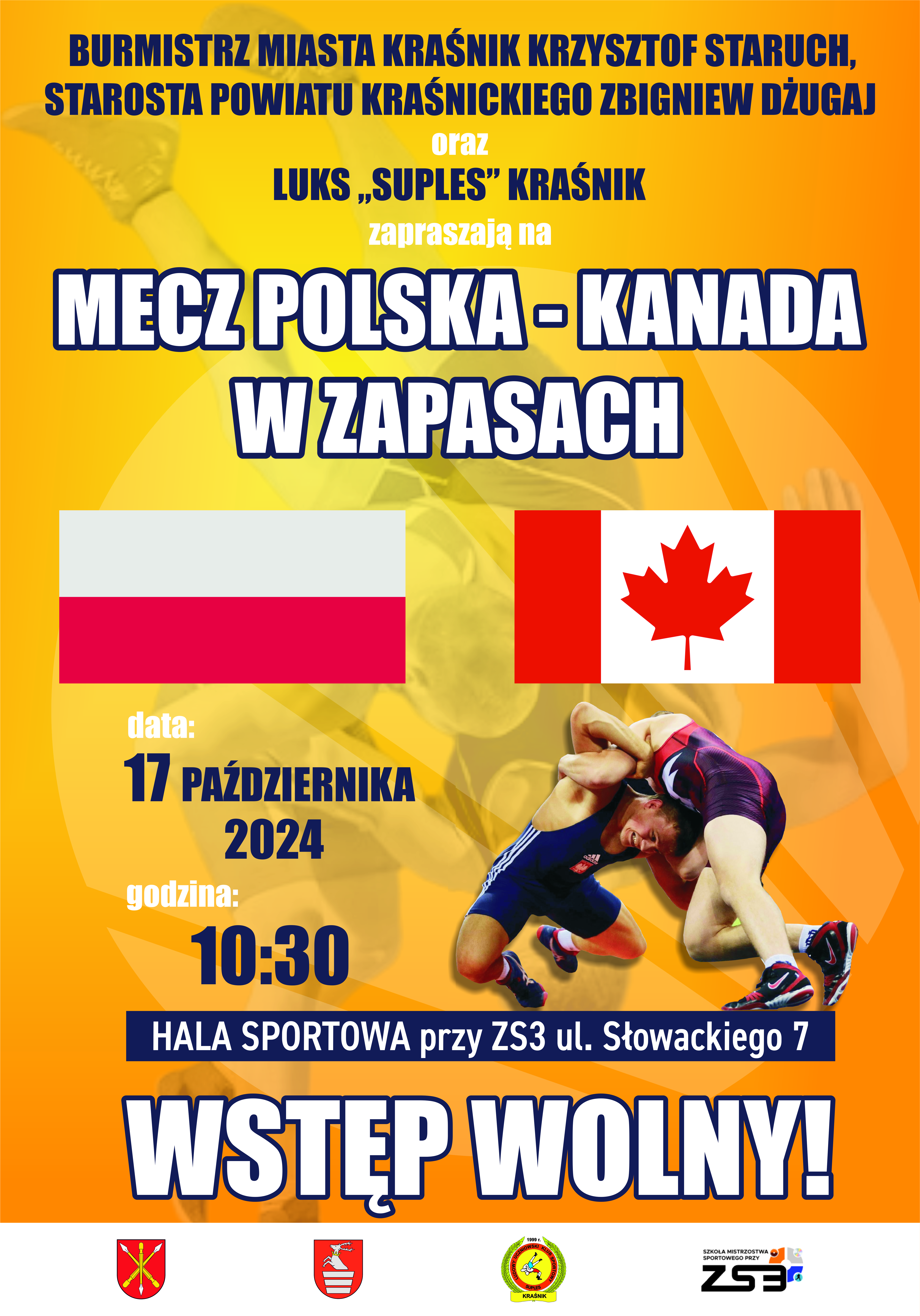 Starosta Kraśnicki Zbigniew Dżugaj, Burmistrz Miasta Kraśnik Krzysztof Staruch oraz Ludowy Uczniowski Klub Sportowy „Suples” serdecznie zapraszają na mecz Polska – Kanada w zapasach.