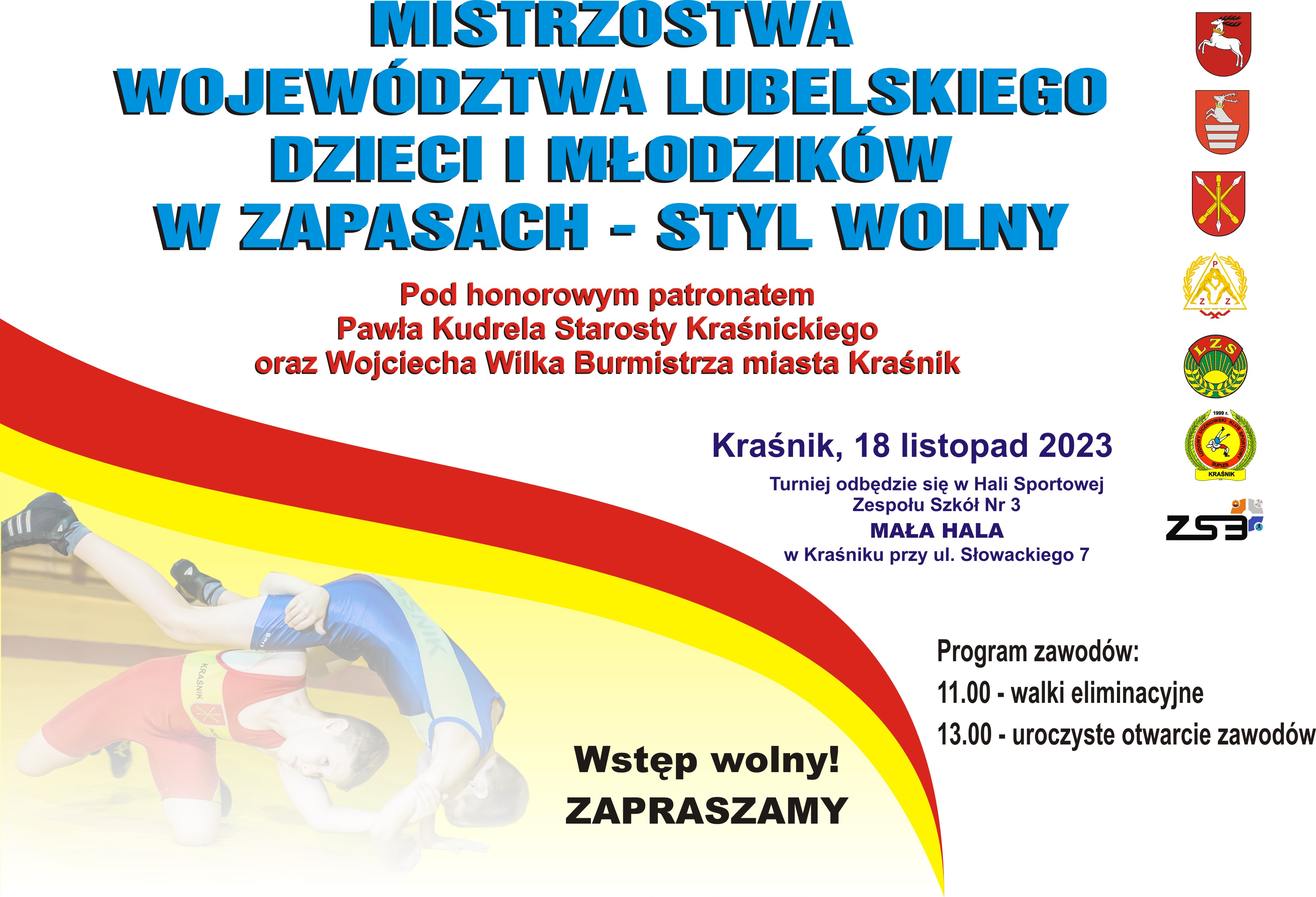 W dniu 18 listopada 2023 r. (sobota) na małej hali sportowej Zespołu Szkół nr 3 w Kraśniku przy ulicy Słowackiego 7 odbędą się Mistrzostwa Województwa Lubelskiego dzieci i młodzików w zapasach – styl wolny.