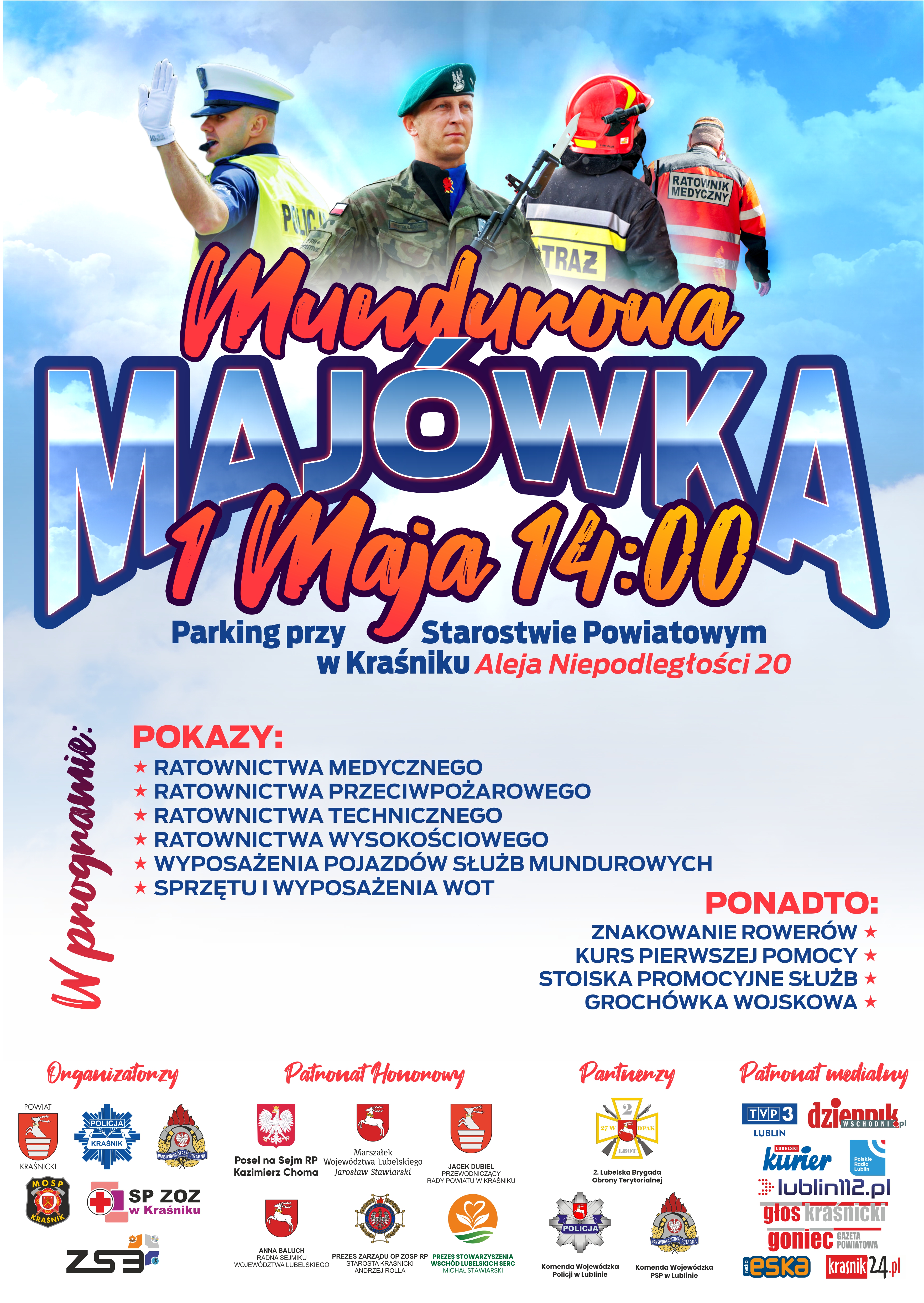 Patronat Honorowy nad wydarzeniem objął: Poseł na Sejm RP Kazimierz Choma, Marszałek Województwa Lubelskiego Jarosław Stawiarski, Radna Sejmiku Województwa Lubelskiego Anna Baluch, Prezes Związku Powiatowego OSP RP w Kraśniku - Starosta Kraśnicki Andrzej Rolla, Przewodniczący Rady Powiatu Kraśnickiego Jacek Dubiel oraz Prezes Stowarzyszenia Wschód Lubelskich Serc Michał Stawiarski. Niewątpliwie wydarzenie będzie stanowiło dobrą okazję do integracji mieszkańców powiatu kraśnickiego oraz zapoznania się z funkcjonowaniem służb stojących na straży bezpieczeństwa publicznego.