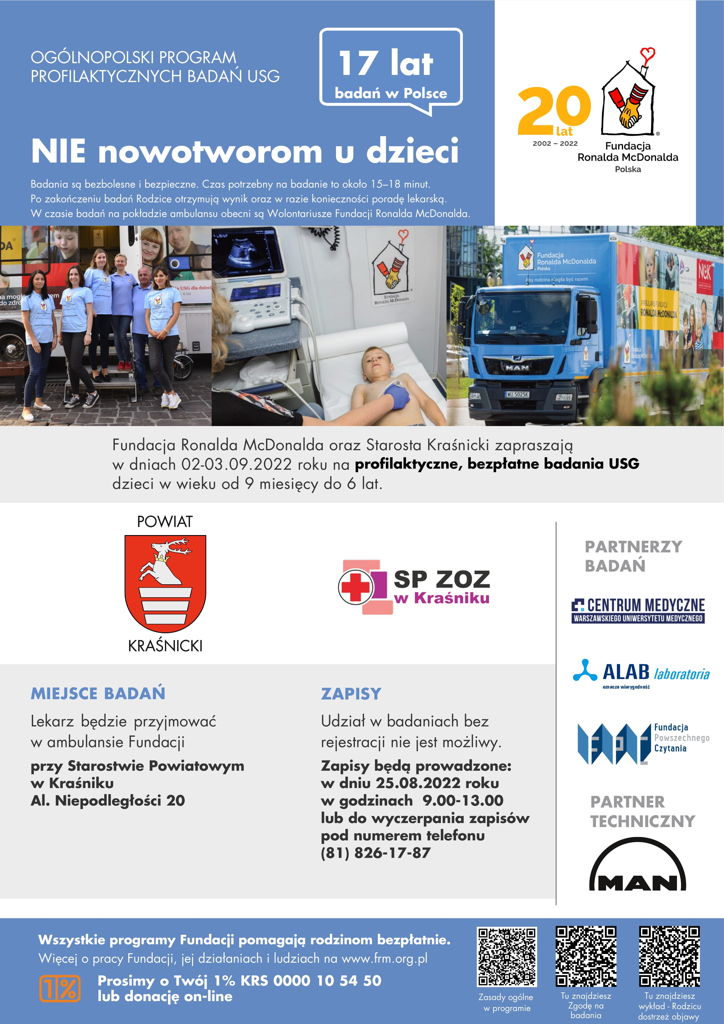 Zapraszamy na profilaktyczne, bezpłatne badania USG dzieci w wieku od 9 miesięcy do 6 lat w ramach kampanii społecznej na rzecz postępu w onkologii dziecięcej „NIE nowotworom u dzieci”, która w odpowiedzi na nasze zaproszenie będzie przeprowadzona na terenie powiatu kraśnickiego już po raz dwunasty w dniach 2 – 3 września przy Starostwie Powiatowym w Kraśniku.