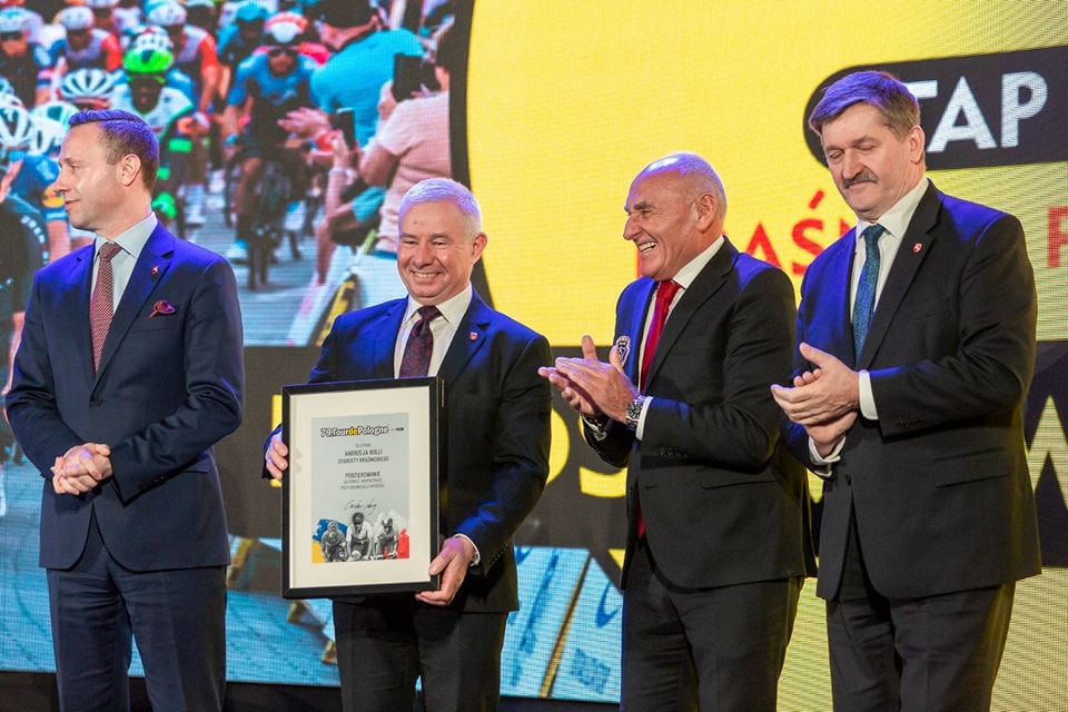 Starosta Andrzej Rolla odebrał pamiątkowy grawer z podziękowaniami za współorganizację III etapu 79. Tour de Pologne, który 1 sierpnia wystartował z Kraśnika do Przemyśla.
