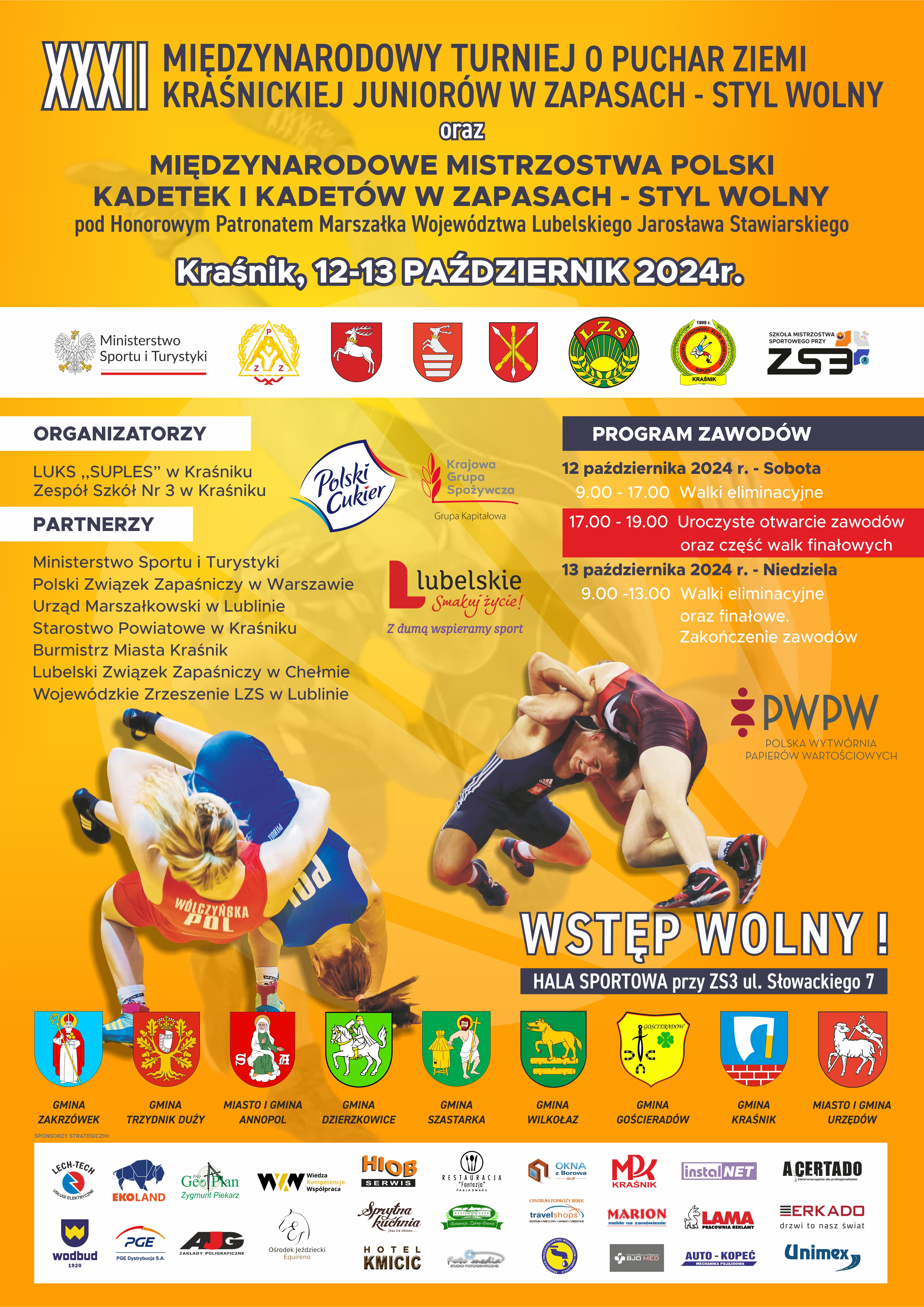 W dniach 12-13 października 2024 roku na hali sportowej przy Zespole Szkół nr 3 w Kraśniku odbędzie się XXXII Międzynarodowy Turniej o Puchar Ziemi Kraśnickiej Juniorów w zapasach - styl wolny oraz Międzynarodowe Mistrzostwa Polski Kadetek i Kadetów w zapasach – styl wolny.