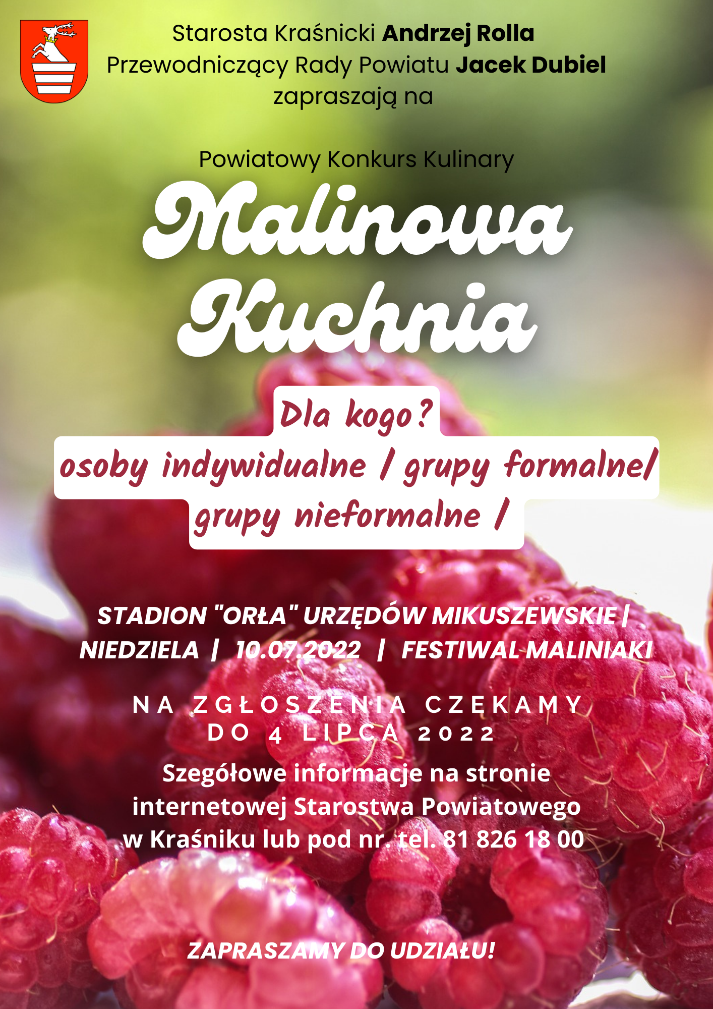 Starosta Kraśnicki Andrzej Rolla, Przewodniczący Rady Powiatu w Kraśniku Jacek Dubiel oraz Burmistrz Urzędowa Paweł Dąbrowski zapraszają do udziału w Powiatowym Konkursie Kulinarnym "Malinowa Kuchnia", którego organizatorem jest Wydział Promocji Starostwa Powiatowego w Kraśniku.