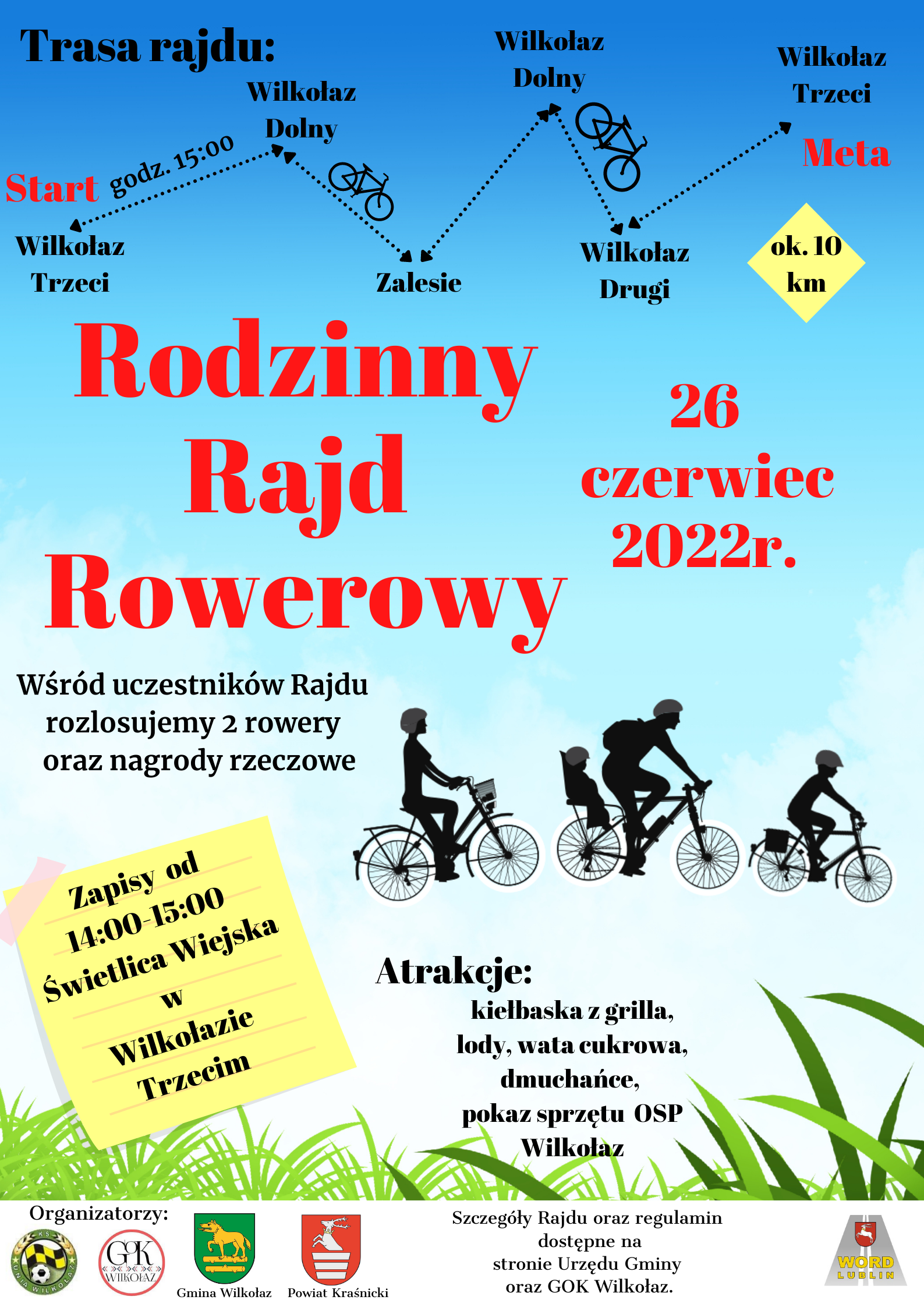 Serdecznie zapraszamy do wzięcia udziału w Rodzinnym Rajdzie Rowerowym, który odbędzie się w najbliższą niedzielę, 26 czerwca, w Wilkołazie. Jego organizatorami są: Klub Sportowy „Unia Wilkołaz” w Wilkołazie, Urząd Gminy Wilkołaz, Gminny Ośrodek Kultury w Wilkołazie przy współpracy ze Starostwem Powiatowym w Kraśniku.