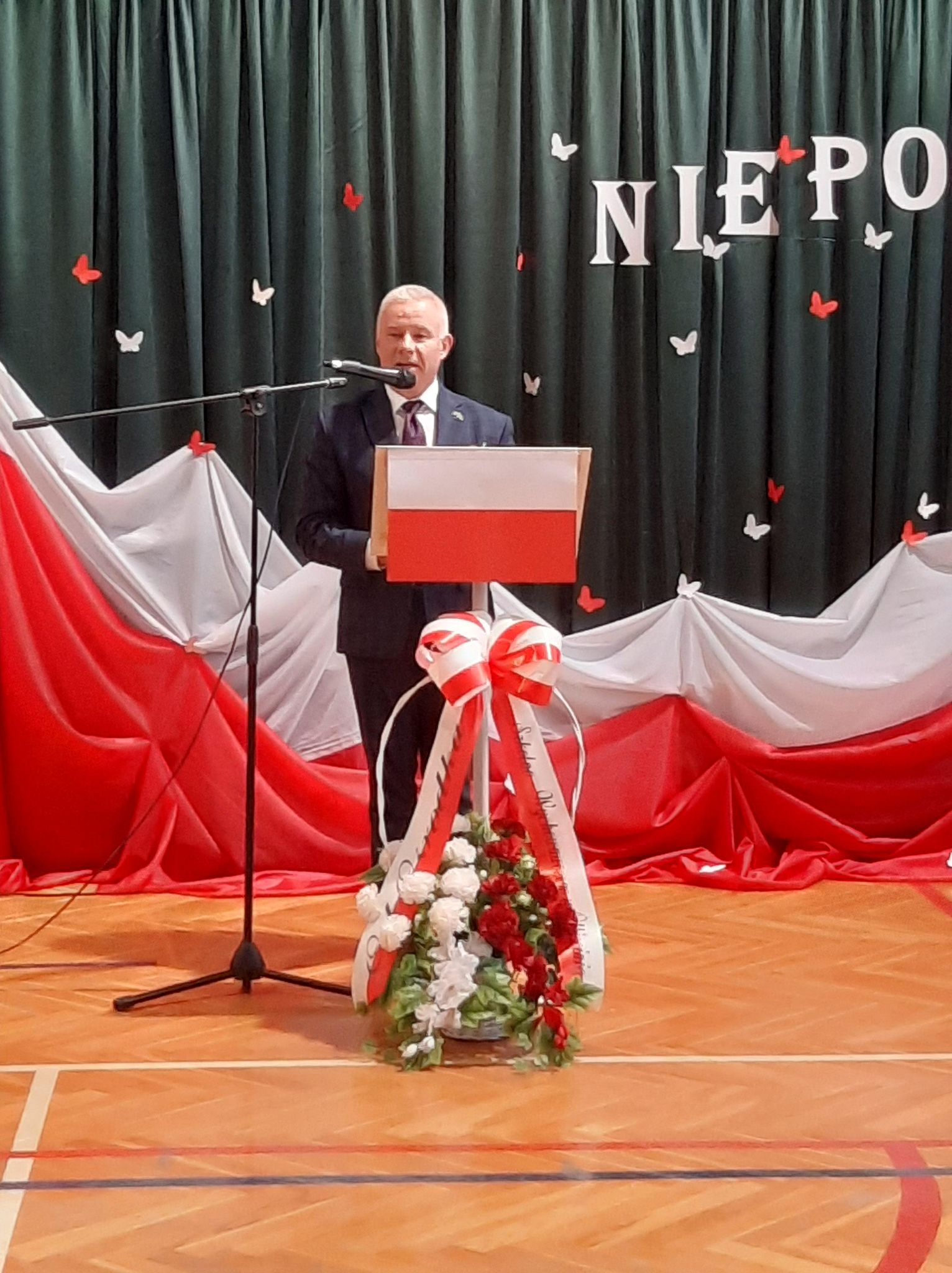 W Specjalnym Ośrodku Szkolno-Wychowawczym im. Jerzego Rudlickiego w Olbięcinie starosta Andrzej Rolla uczestniczył w szkolnych obchodach Święta Niepodległości które zorganizowała społeczność placówki.