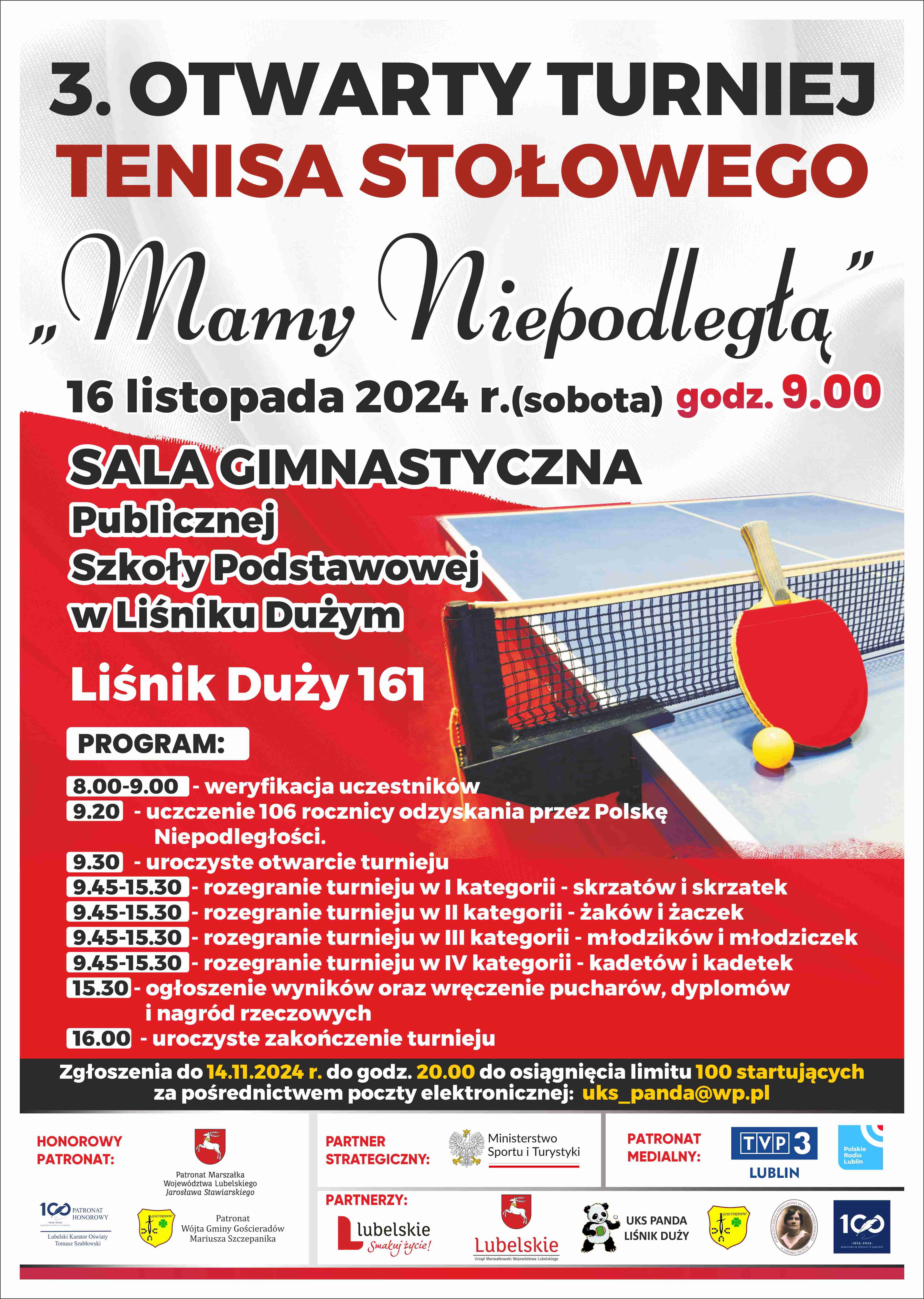 W sobotę, 16 listopada 2024 roku, w sali gimnastycznej Publicznej Szkoły Podstawowej w Liśniku Dużym, Liśnik Duży 161, odbędzie się 3. Otwarty Turniej Tenisa Stołowego „Mamy Niepodległą”.
