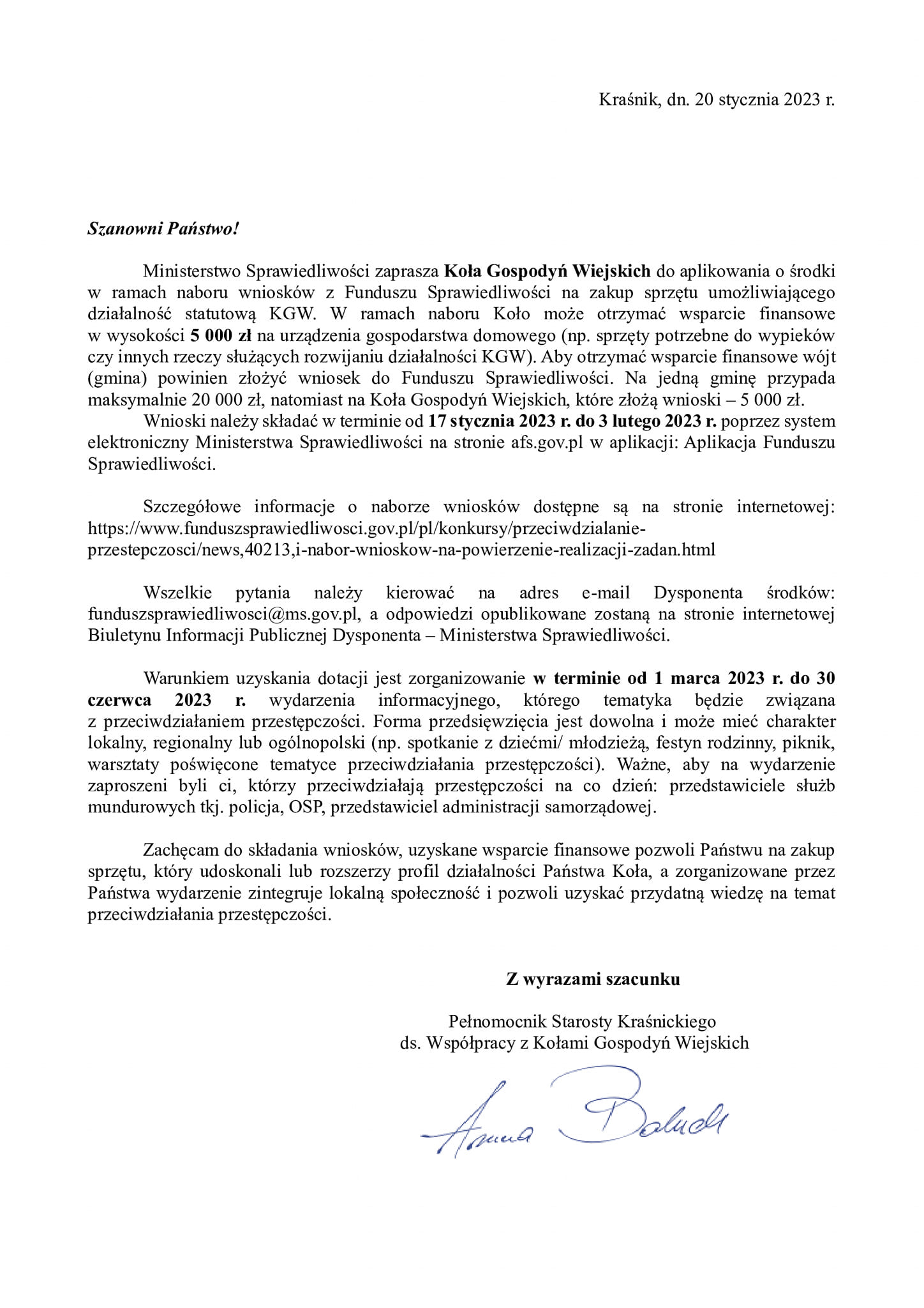 Pełnomocnik Starosty Kraśnickiego ds. Współpracy z Kołami Gospodyń Wiejskich Anna Baluch zaprasza Koła Gospodyń Wiejskich z powiatu kraśnickiego do składania wniosków na realizację przedsięwzięć z Funduszu Sprawiedliwości.